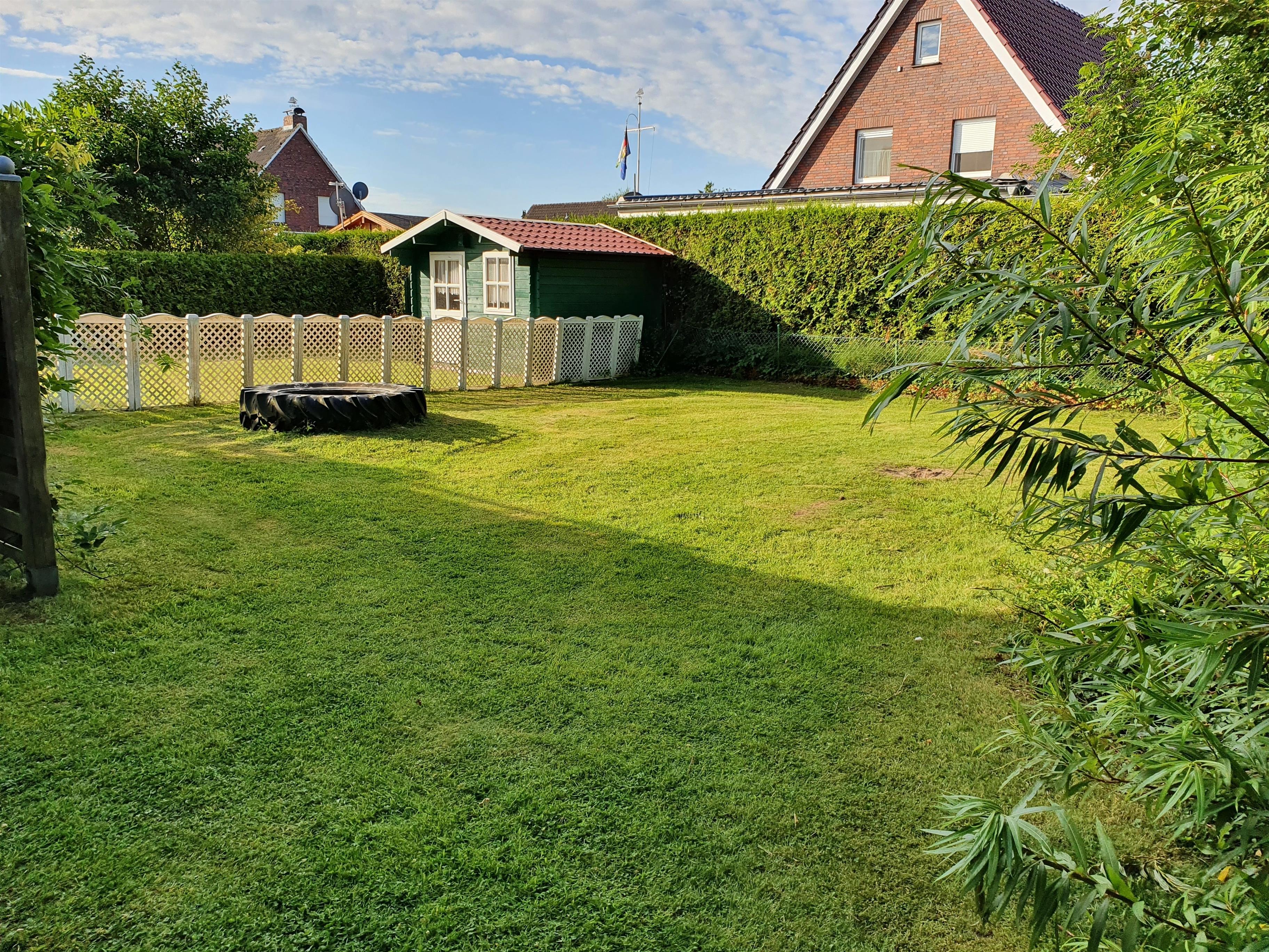 Die sonnige Terrasse hat eine Markise und Sichtschutzwände zum angrenzenden Garten. Im Garten können Ihre Kids sich auf einen großen Sandkasten freuen.