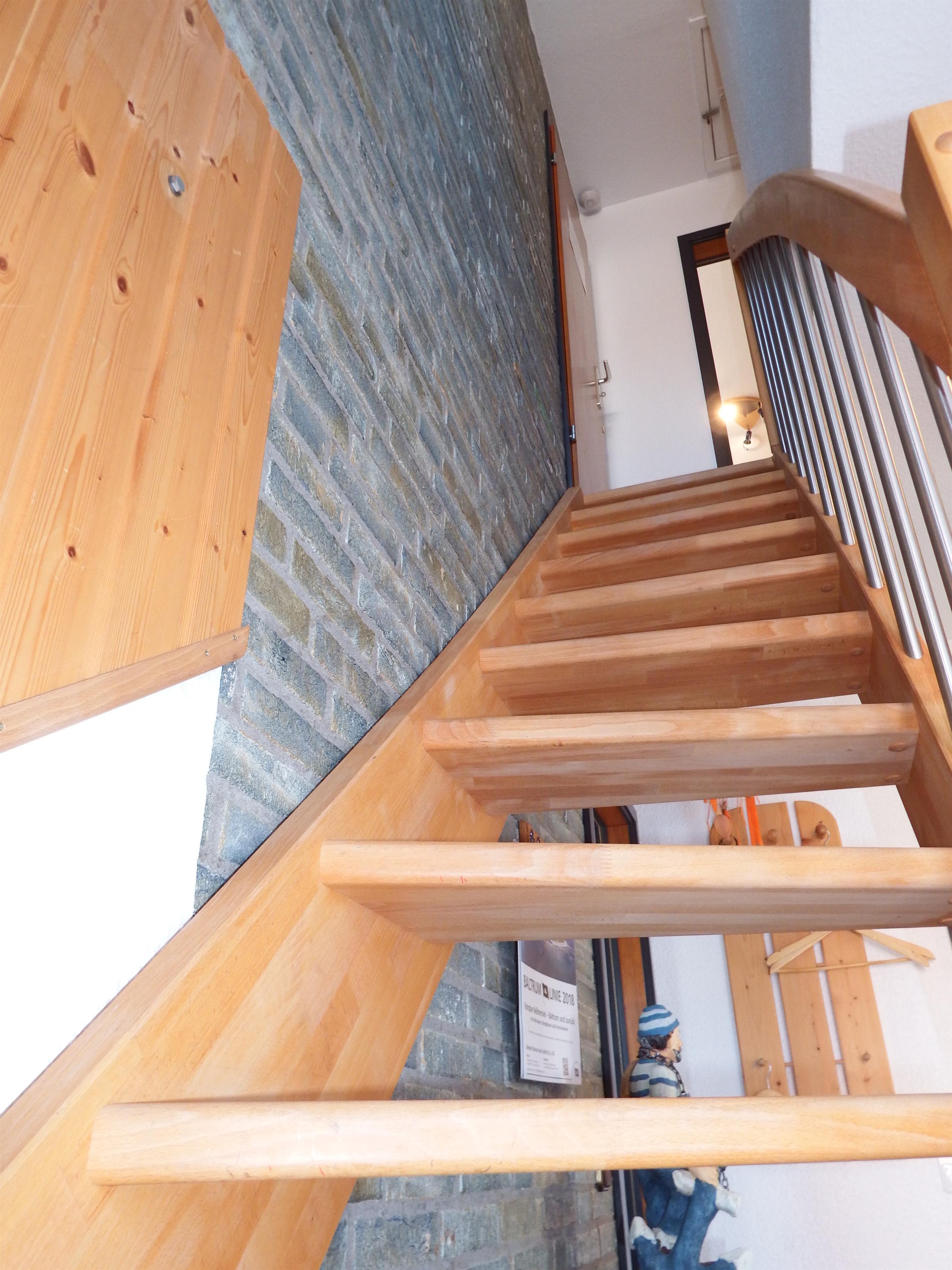 Über eine Holztreppe gelangen Sie in die obere Etage, wo sich 3 Schlafzimmer und ein Gäste-WC befinden. Alle Fenster sind mit Rollos versehen.