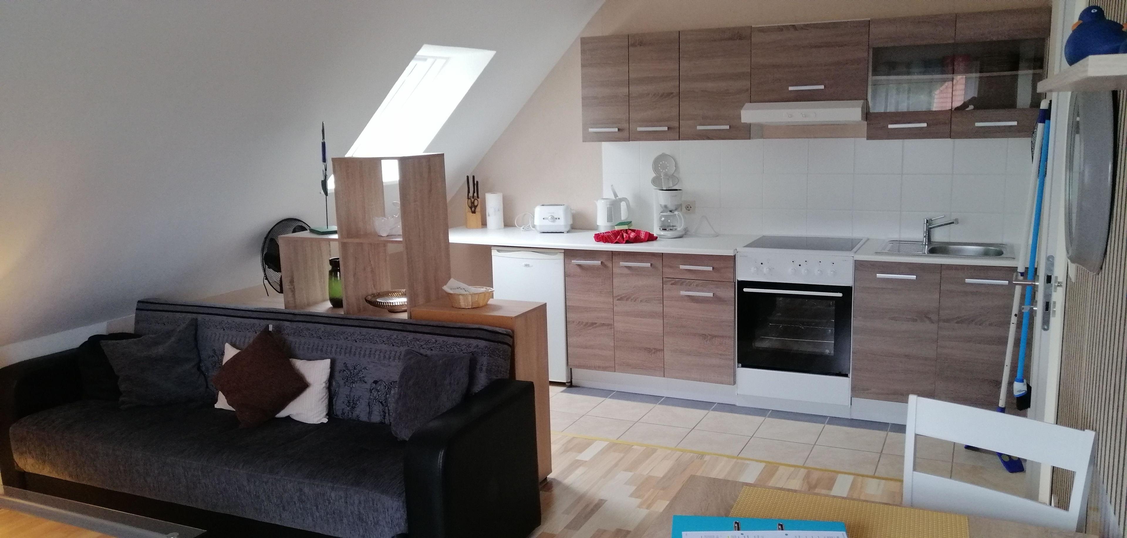 Zur Wohnung gehört eine Wohnküche mit Kühlachrank, Herd mit vier Platten und Backofen, Toaster, Wasserkocher und Kaffeemaschine.