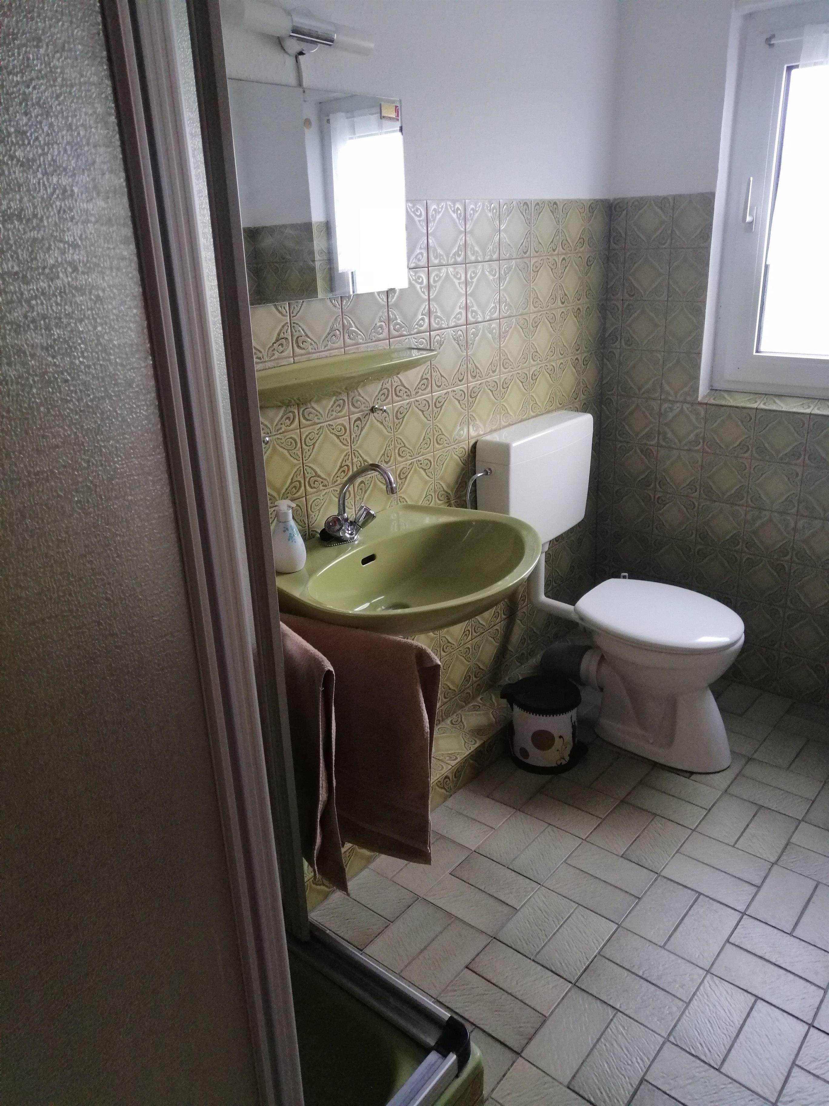 Das Badezimmer ist ausgestattet mit Dusche, Waschbecken und WC.
