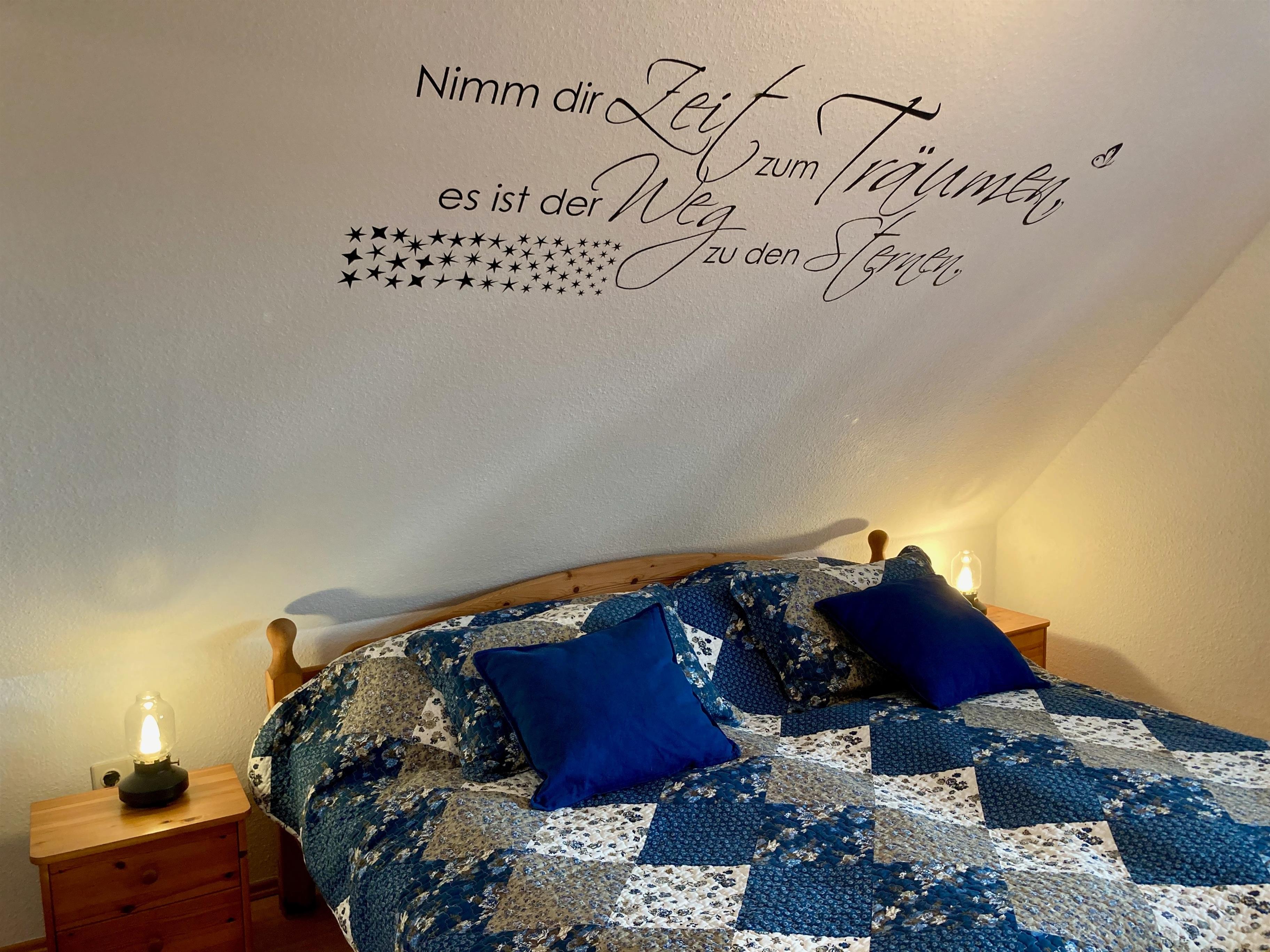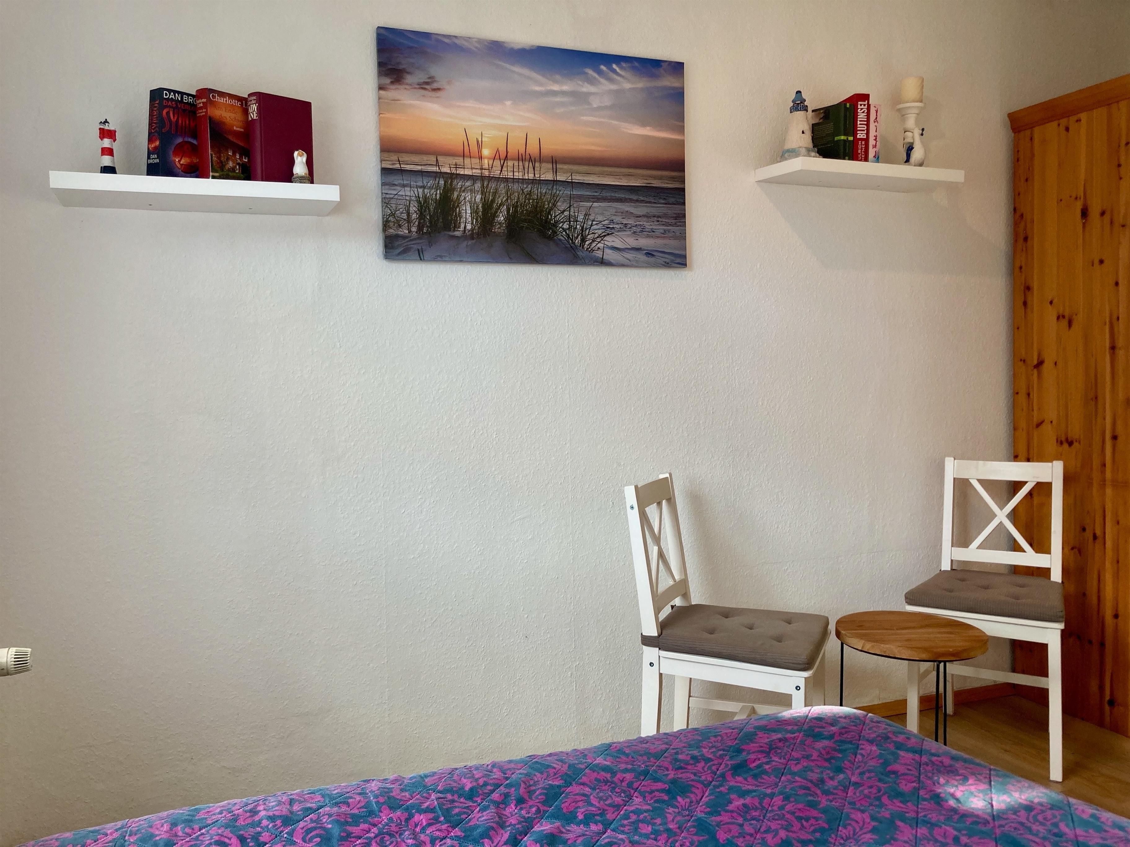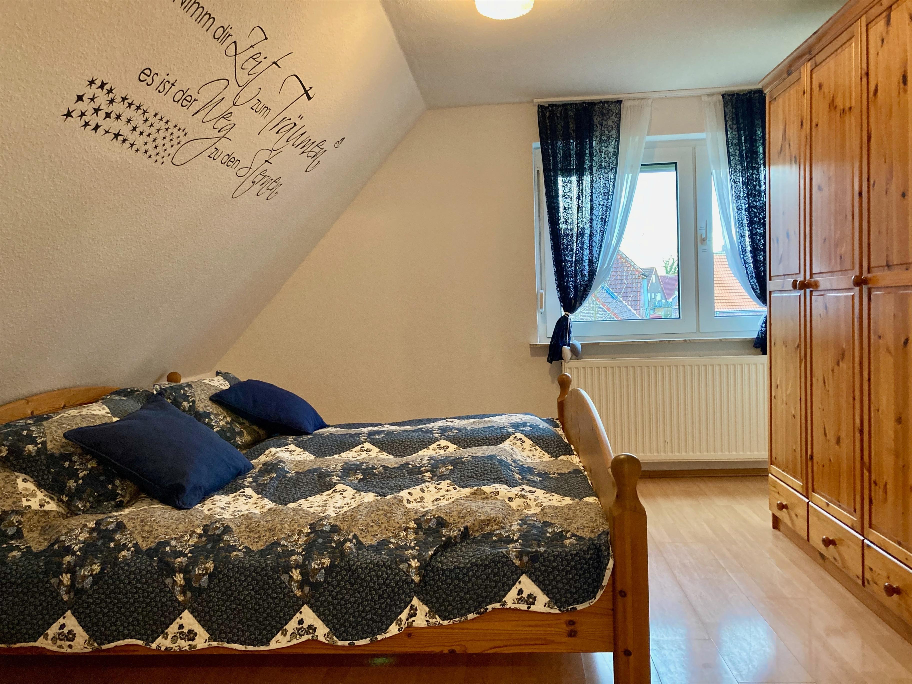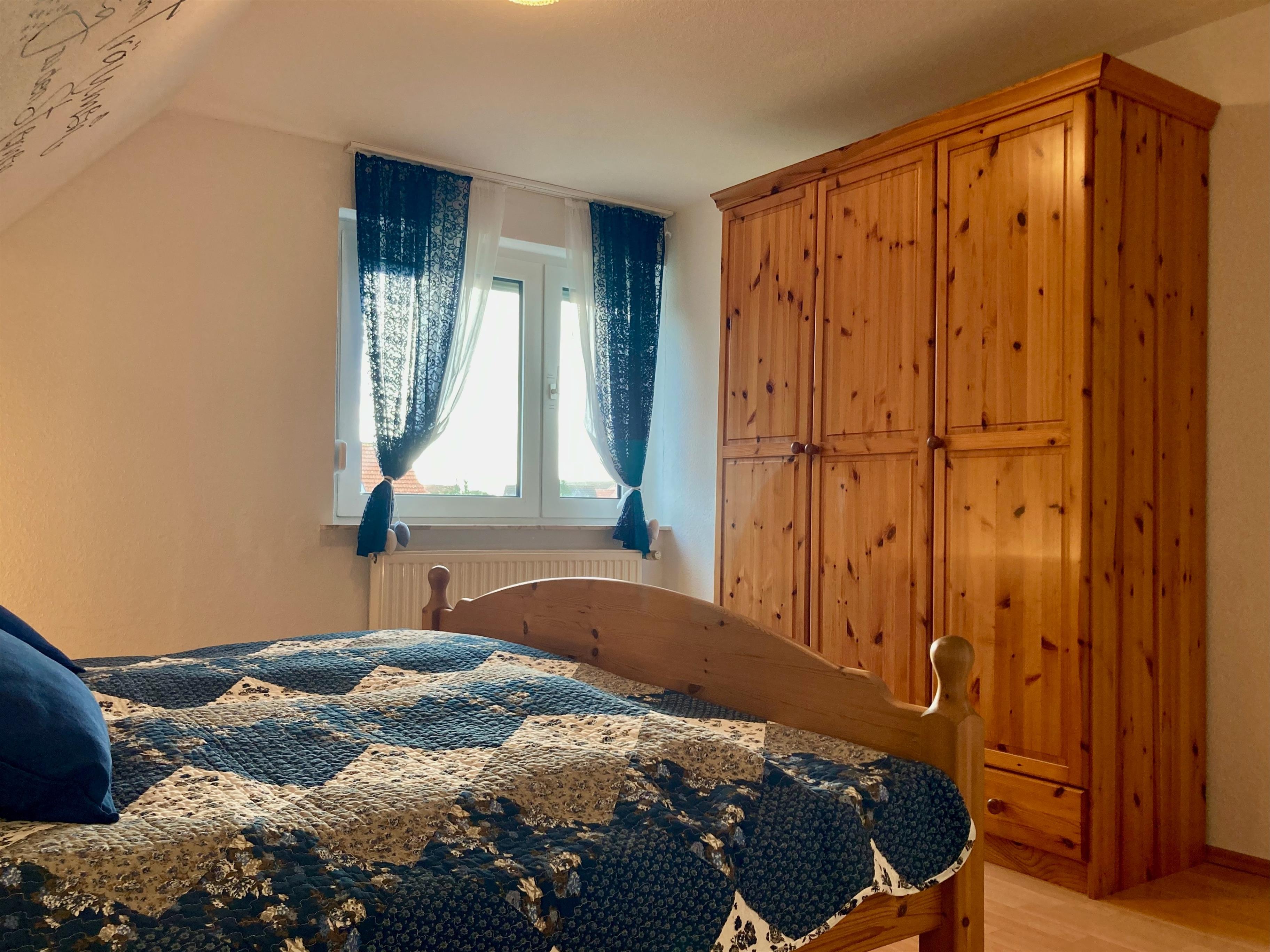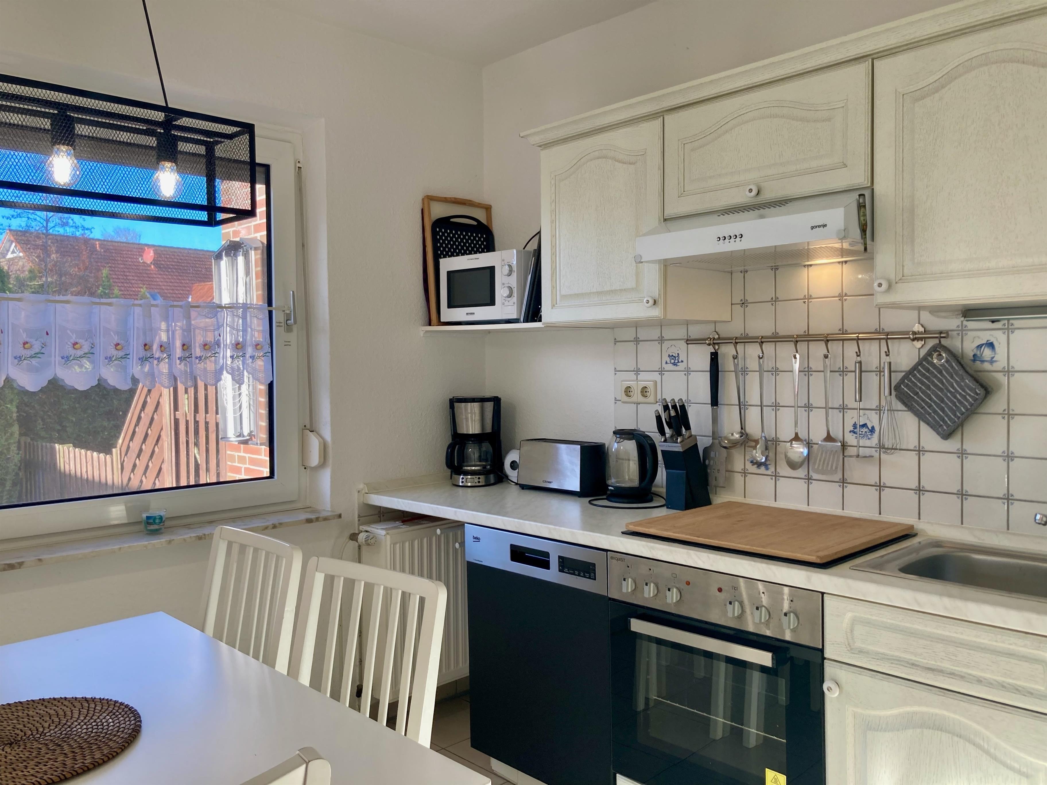Erdgeschoss: Flur. Wohnraum mit Sitzgruppe, Sat-TV (Amazon-Fire-TV), Radio/CD, Internetzugang (wlan, gratis), Terrassenausgang. Zum Wohnraum offene Küche mit Einbauherd (4 Ceranfelder, Backofen), Geschirrspüler, Kühlschrank, Mikrowelle, Airfryer, Kaffeemaschine, Toaster, Wasserkocher sowie Essplatz (Esstisch ausziehbar). Schlafzimmer mit Boxspringbett (1,40 m x 2 m), kleine Sitzecke. Dusche/WC mit Waschmaschine. Vom Flur Treppe ins Obergeschoss (Dachschrägen): Doppelzimmer mit kleiner Sitzecke. Einzelzimmer. WC. Abstellraum.