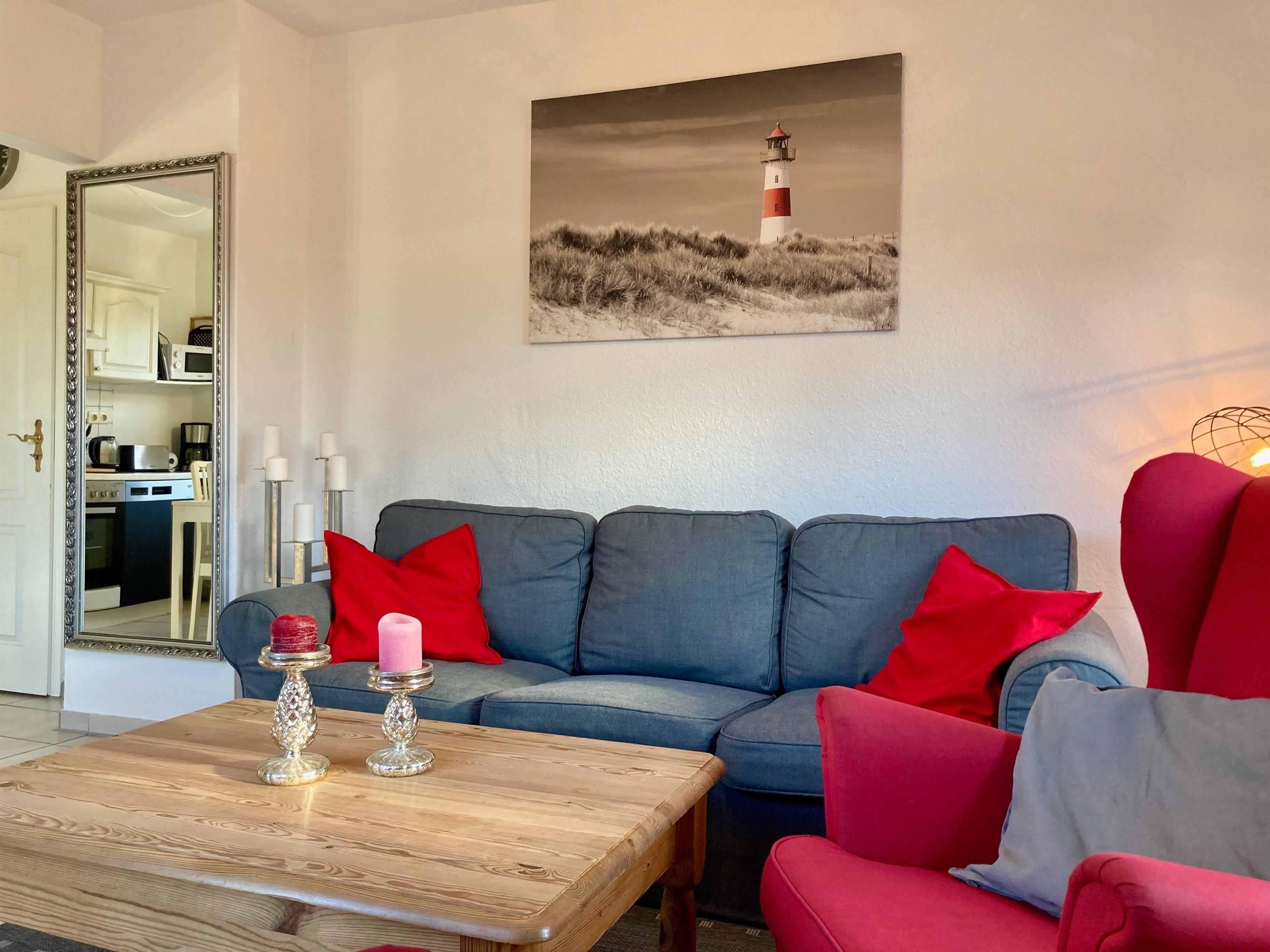 Gemütliche Einrichtung und gute Ausstattung mit überwiegend hellem Weichholzmobiliar sowie maritimen Deko-Elementen. Fliesenböden, in den Schlafbereichen Laminatfußböden. Fliegenschutzgitter in allen Räumen. Bügelbrett/-eisen. Kinderbett, Hochstuhl und mobile Kindersicherung vorhanden, Bollerwagen im Gartenhaus zur freien Nutzung. Tischfußball. Safe. Gas-Zentralheizung.