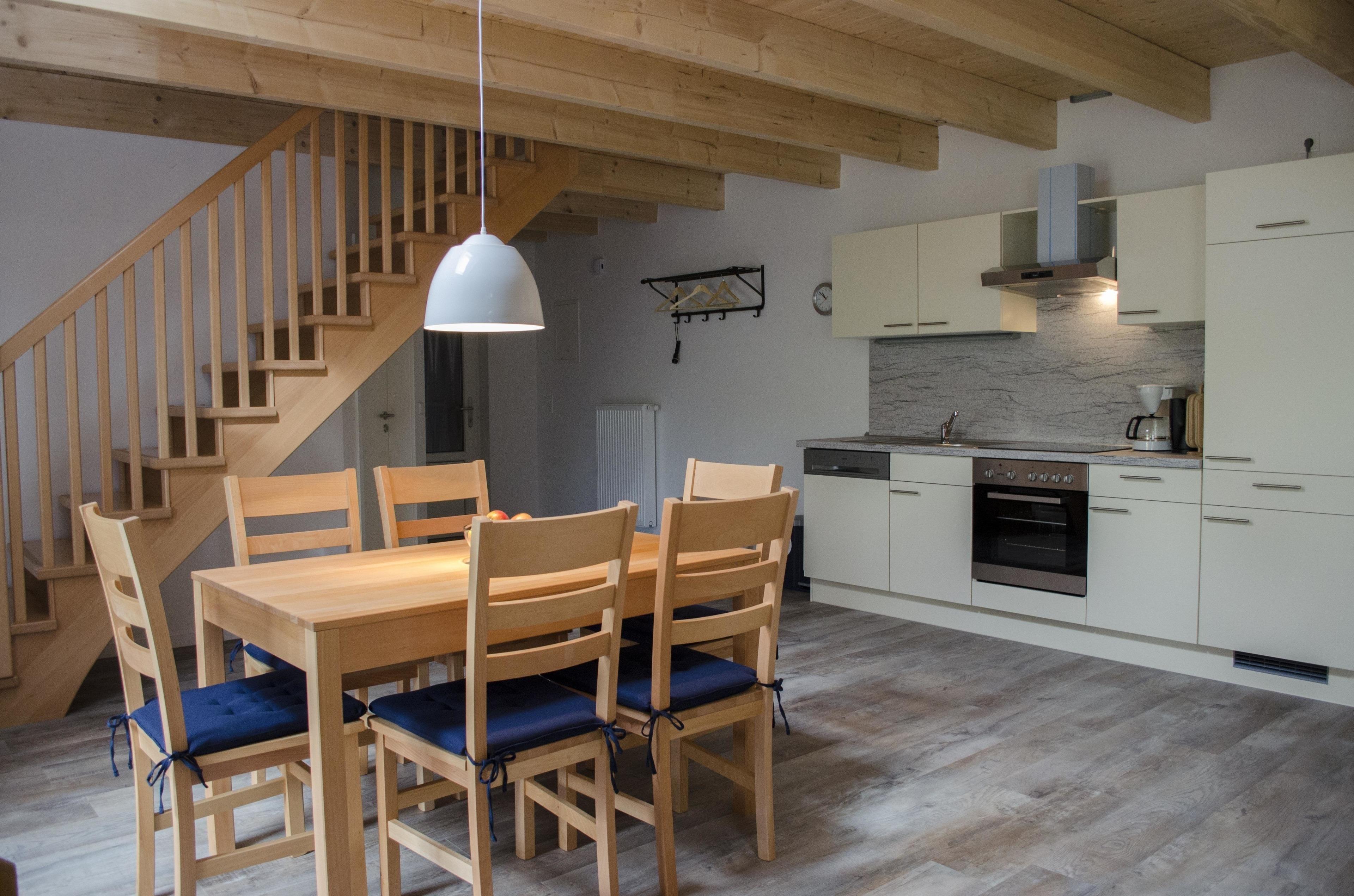 Wohn-/Eßzimmer mit Küchenzeile und das Badezimmer befinden sich unten.