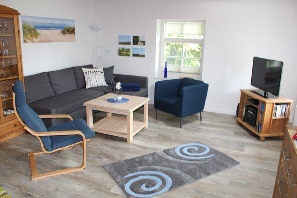 Heller, gemütlicher Wohnraum mit Sofa, 2 Sesseln, Flachbildschirmfernseher, Blueray-player und Hifi-Anlage. Viele CDs, DVDs, Malsachen und Spiele für verregnete Tage finden Sie in den Schubladen.