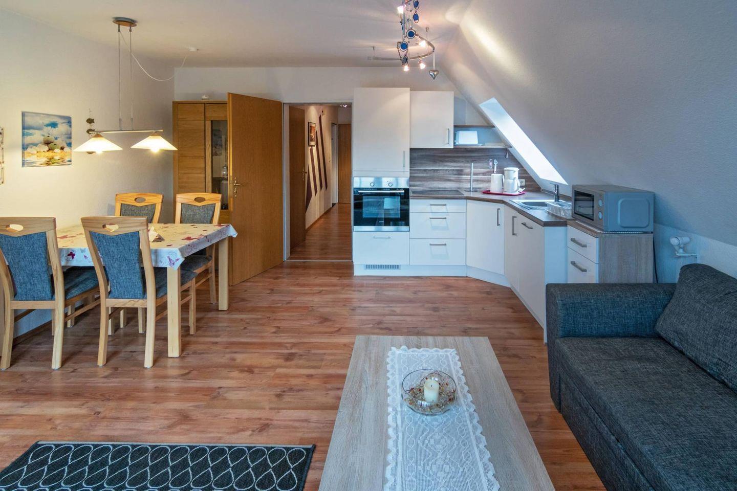 Die Wohnung Regina verfügt über einen gemütlichen Wohn- und Essbereich mit angrenzender voll ausgestatteter Küche, zwei Schlafzimmer (mit einem Ehebett und einer Schlafcouch) und ein Duschbad mit WC und Waschmaschine. Zur Wohnung gehört ein Balkon auf dem Sie sonnige Tage entspannt ausklingen lassen können. Vor dem Haus ist Ihr beschilderter PKW-Stellplatz zu finden. Das WLAN steht Ihnen kostenlos zur Verfügung.
