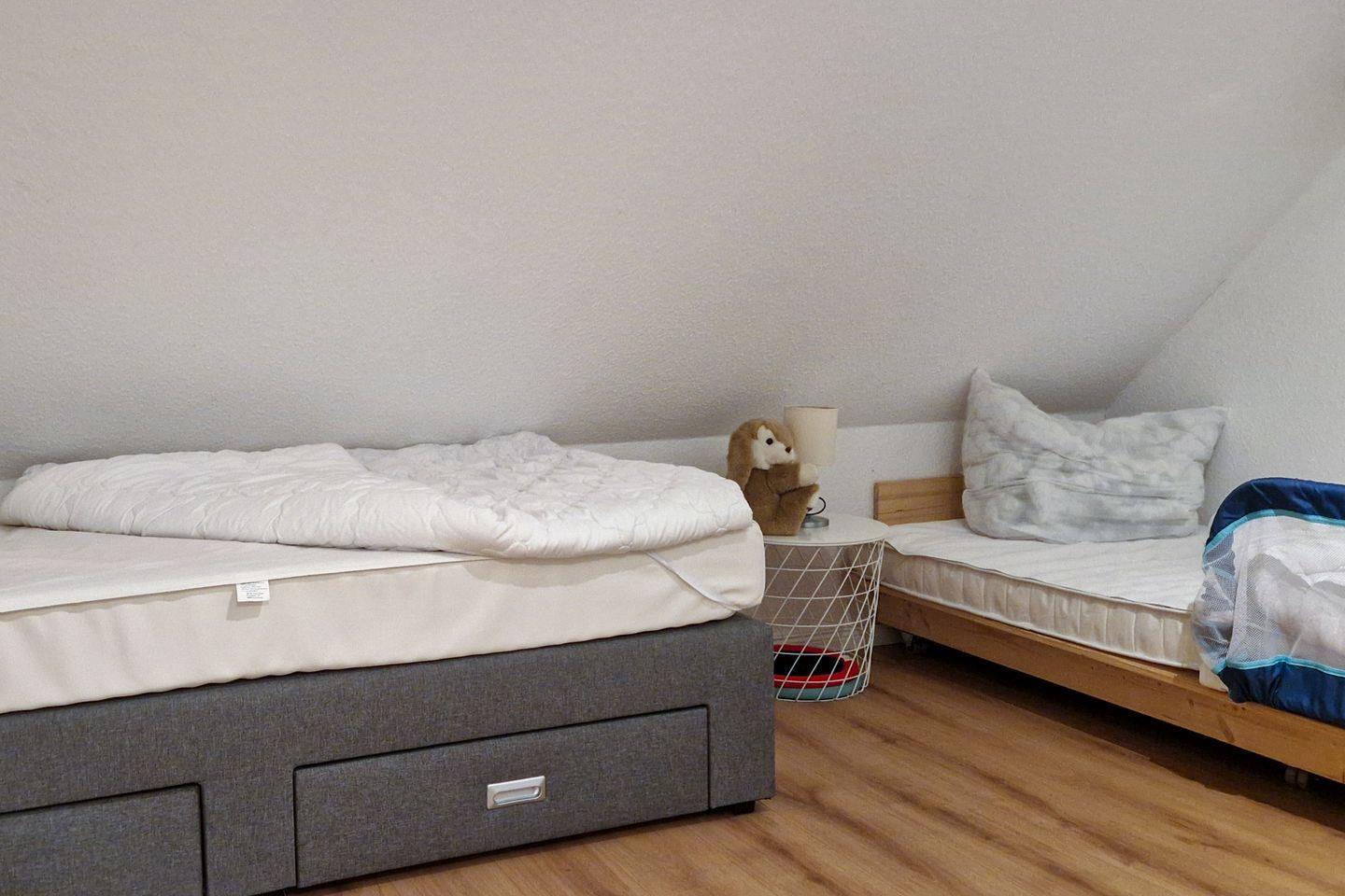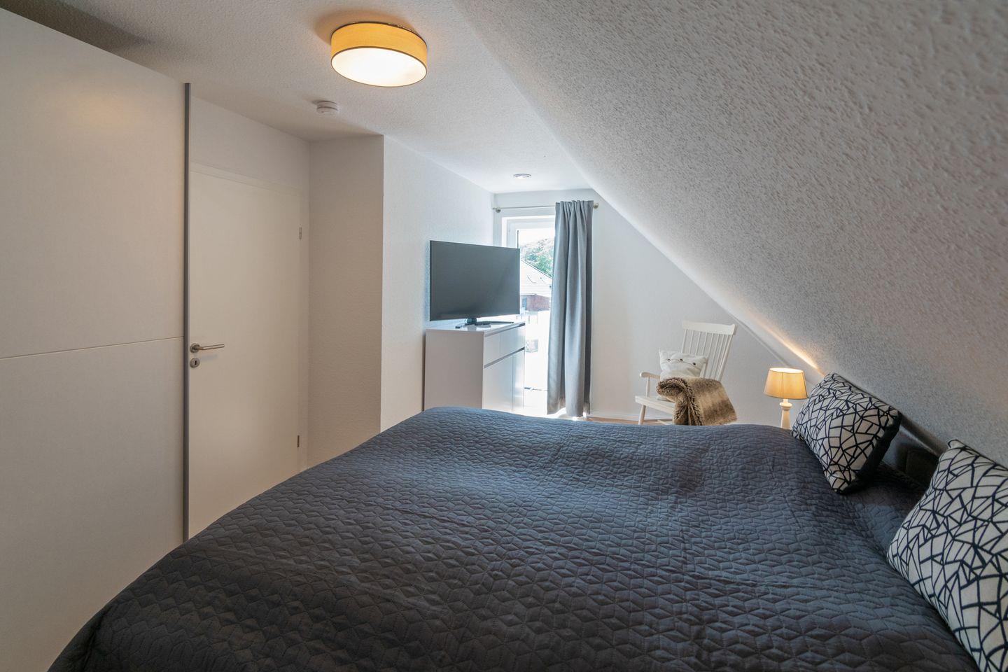 Im Obergeschoss erwartet Sie ein elegantes Schlafzimmer mit einem bequemen Boxspring-Ehebett und eigenem Fernseher sowie ein weiteres Schlafzimmer mit einem komfortablen Einzelboxspringbett und einem niedrigen Einzelbett (Länge 1,80 m, nur für Kinder geeignet). Das moderne Duschbad mit WC verspricht Wohlfühlmomente nach einem erlebnisreichen Tag.