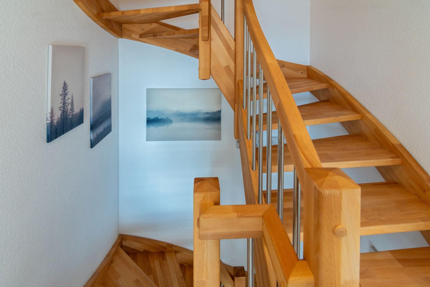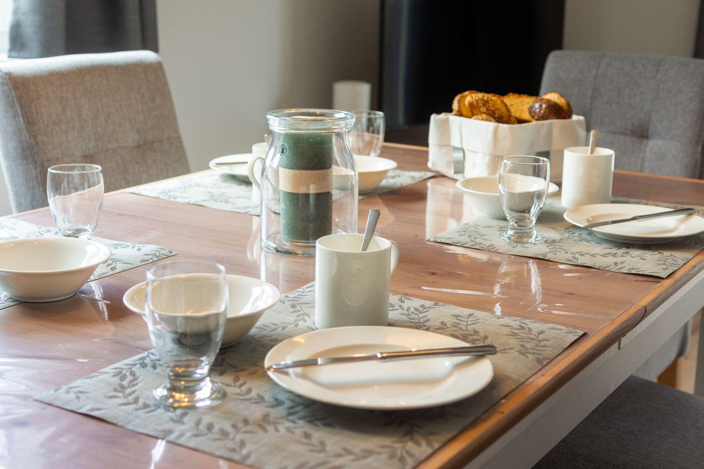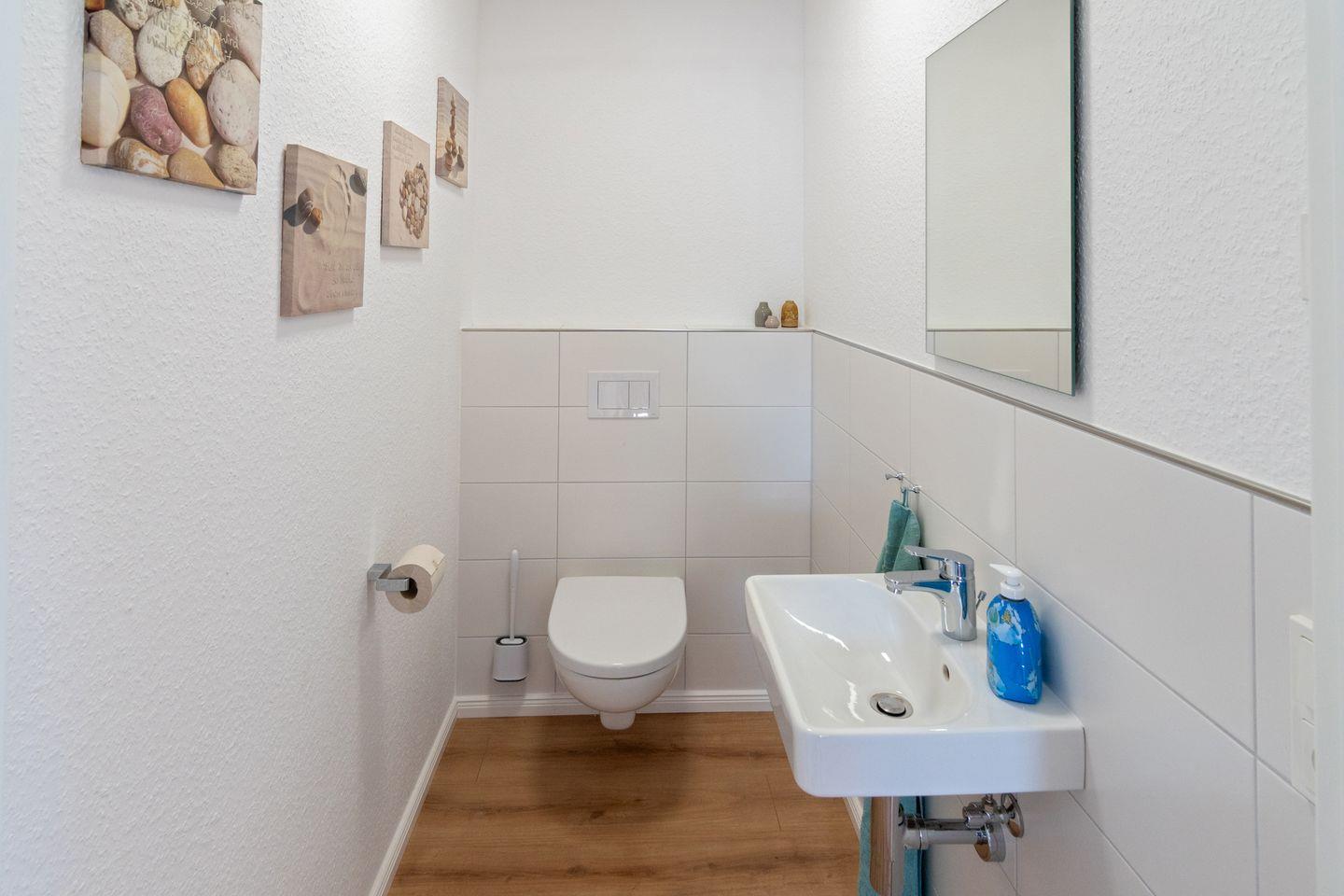 Im Erdgeschoss lädt der großzügige Wohn- und Essbereich mit einem gemütlichen Sofa, einem großen TV und einem stilvollen Esstisch zum Entspannen und Verweilen ein. Die separate, voll ausgestattete Küche lässt keine Wünsche offen und bietet alles, was Sie für die Zubereitung köstlicher Mahlzeiten benötigen. Ein Gäste-WC sowie ein praktischer Hauswirtschaftsraum mit zusätzlichem Stauraum runden das Erdgeschoss ab.