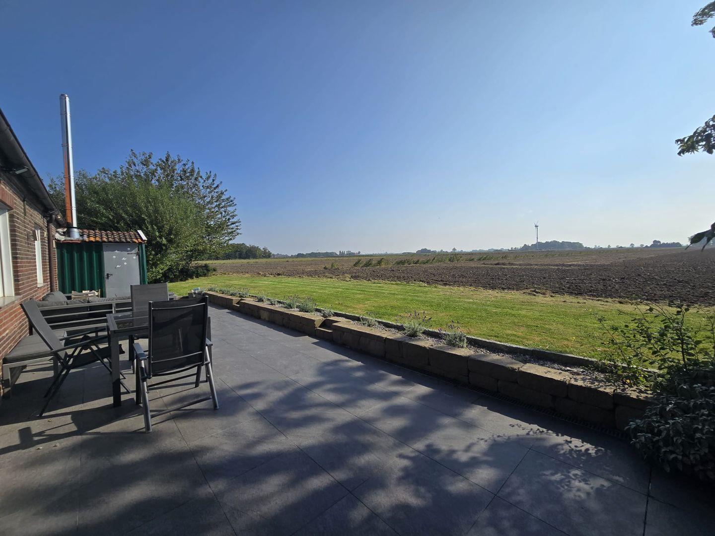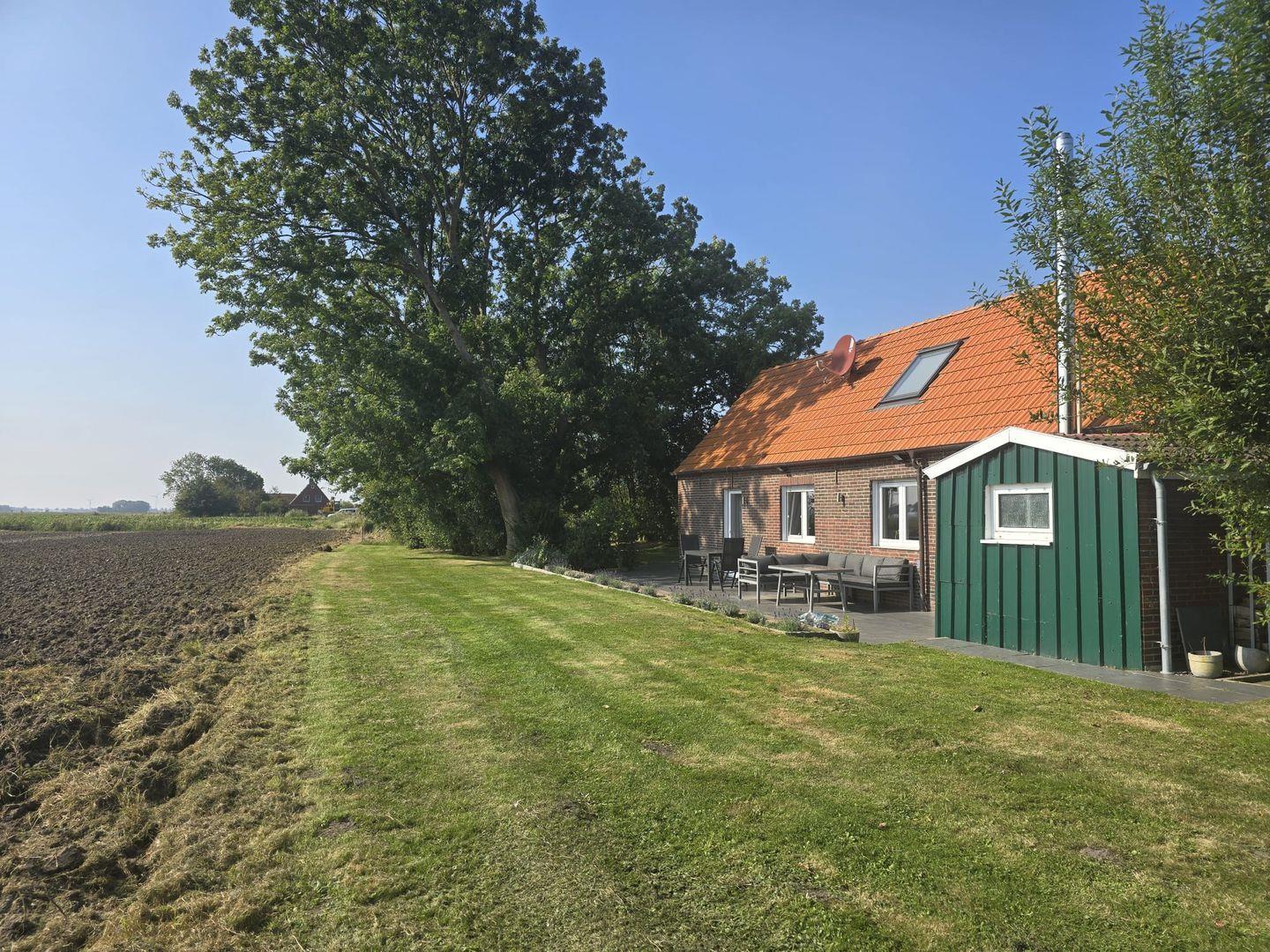 Die sonnige Terrasse lädt zum Entspannen im Freien ein. Hier können Sie die Ruhe genießen, ein Buch lesen, die frische Nordseeluft einatmen oder gemeinsam mit Familie und Freunden grillen. Der Panoramablick über die Felder und das Umland macht jeden Moment im Freien besonders.