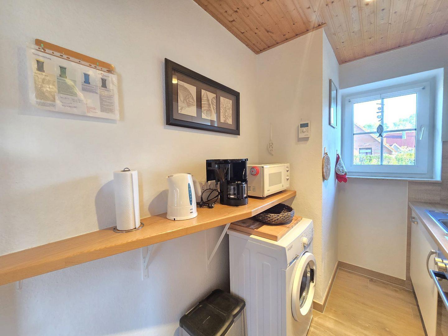 Die moderne Küche ist vollständig ausgestattet und lässt keine Wünsche offen: Spülmaschine, Ceranfeld, Mikrowelle, Kaffeemaschine und alle wichtigen Küchenutensilien stehen bereit, sodass Sie sich wie zu Hause fühlen können.