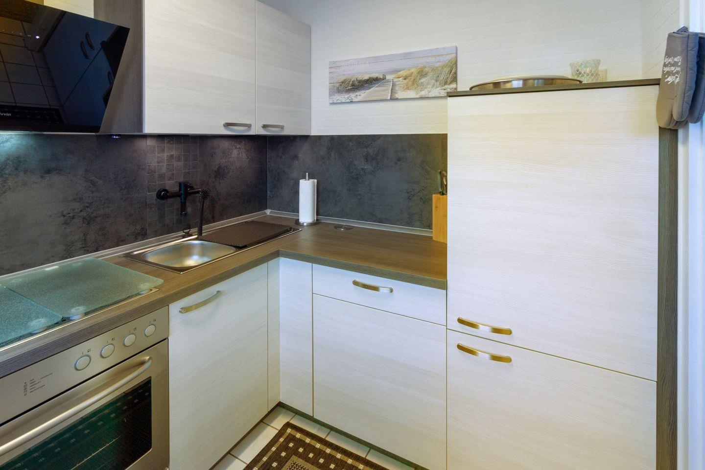 Die separate Küche ist komplett ausgestattet: Ceranherd, Backofen, Mikrowelle, Kühlschrank, Gefrierschrank, Kaffeemaschine und alle nötigen Utensilien stehen bereit. Ein Essbereich sowie ein gemütliches Wohnzimmer mit Sofa, Satelliten-TV, Büchern und kostenfreiem WLAN laden zum Verweilen ein.