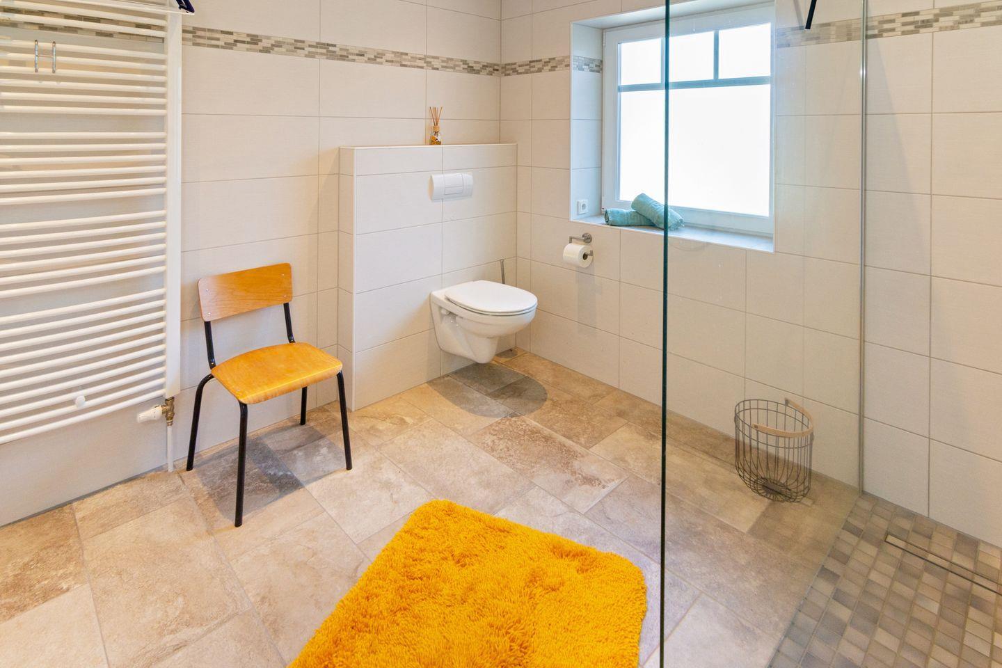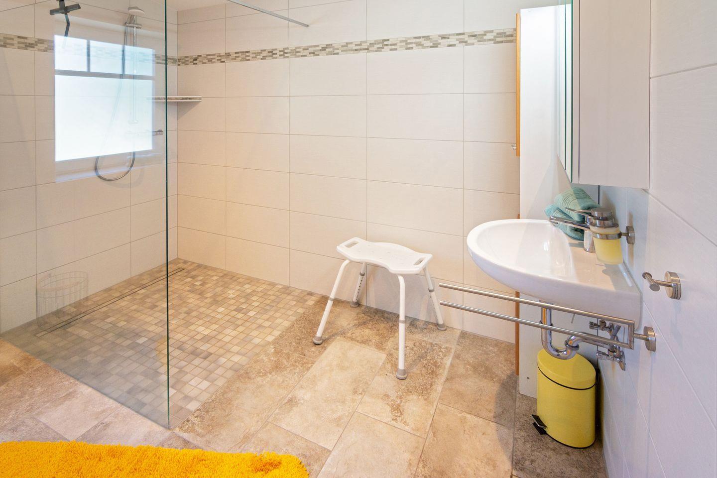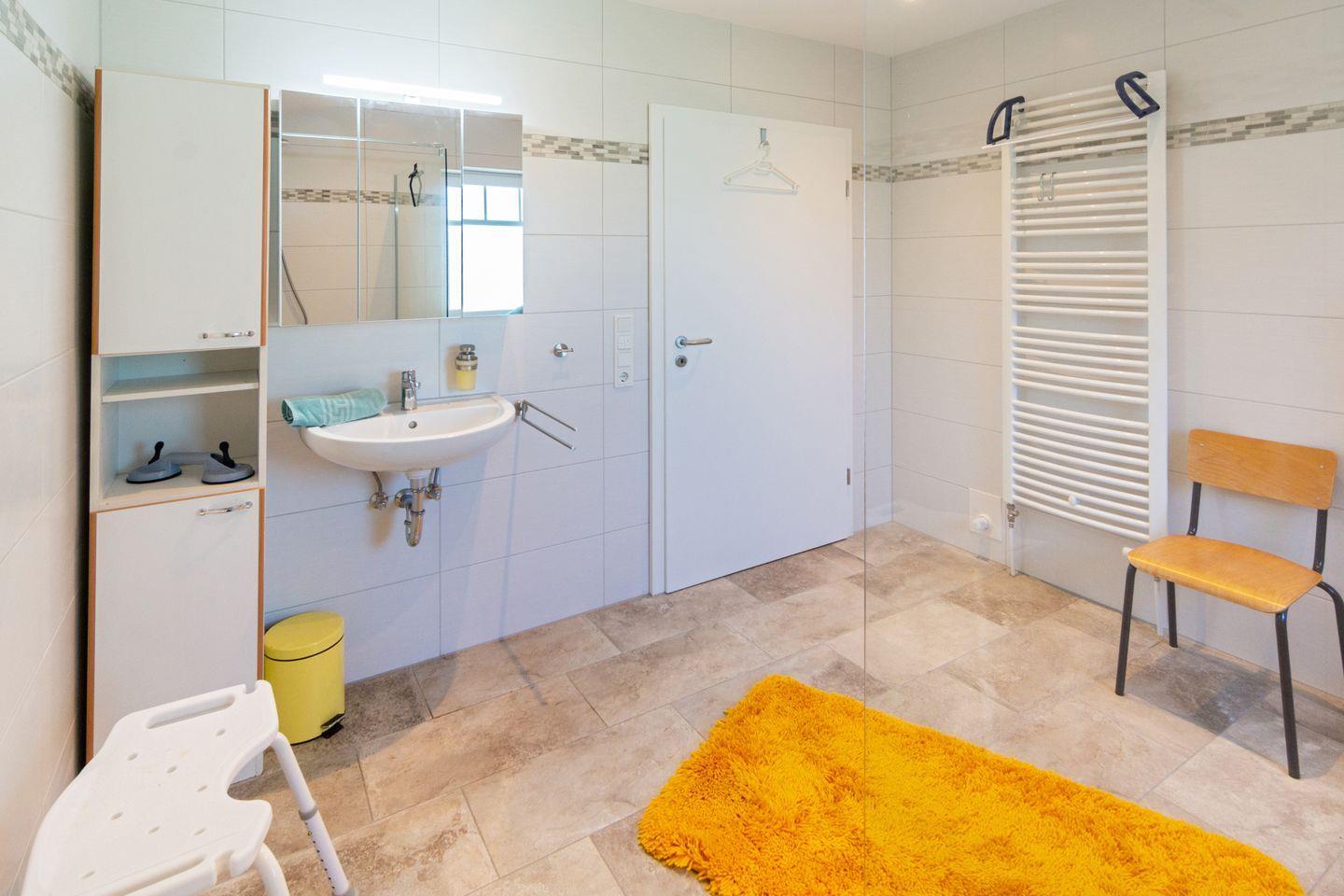 Das barrierefreie Badezimmer bietet eine bodengleiche Rollstuhldusche, erhöhte Toiletten sowie eine angenehme Fußbodenheizung. Zusätzlich gibt es ein Gäste-WC.