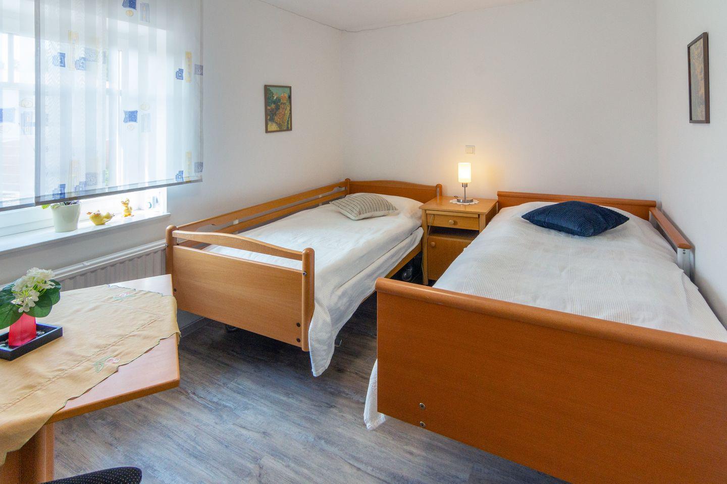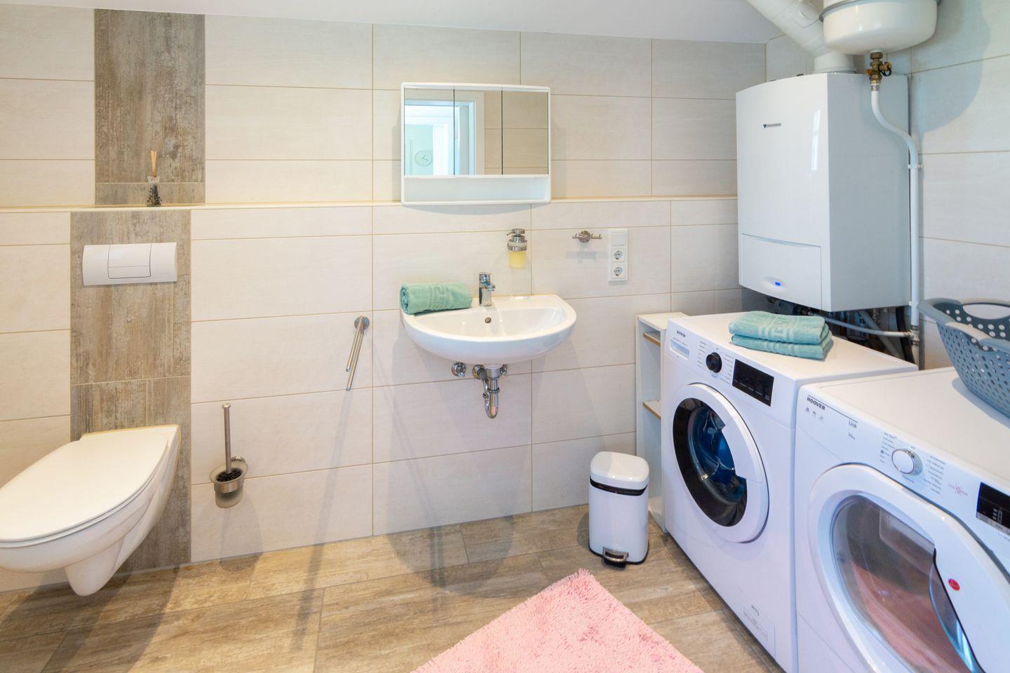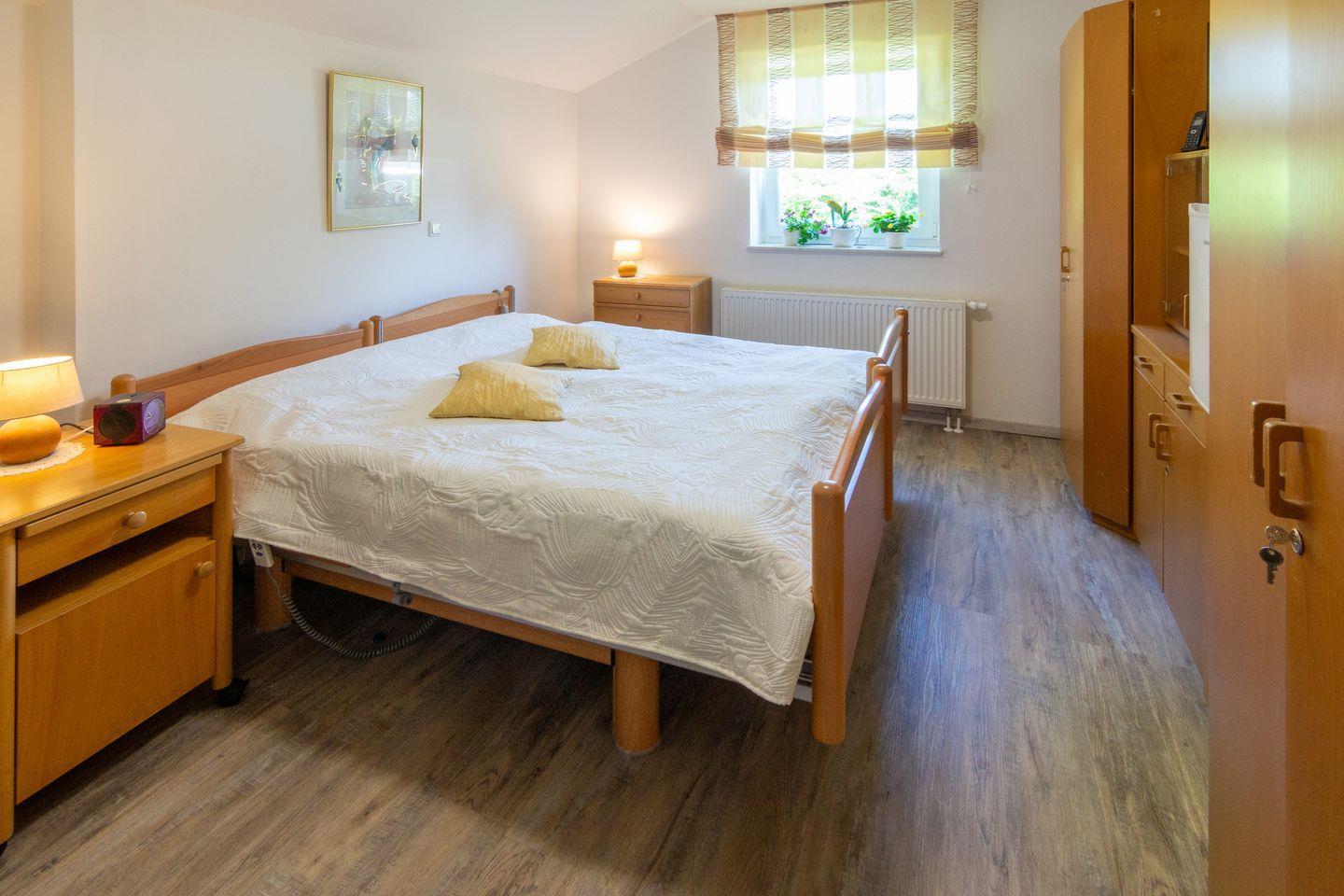 Das barrierefreie Badezimmer bietet eine bodengleiche Rollstuhldusche, erhöhte Toiletten sowie eine angenehme Fußbodenheizung. Zusätzlich gibt es ein Gäste-WC.