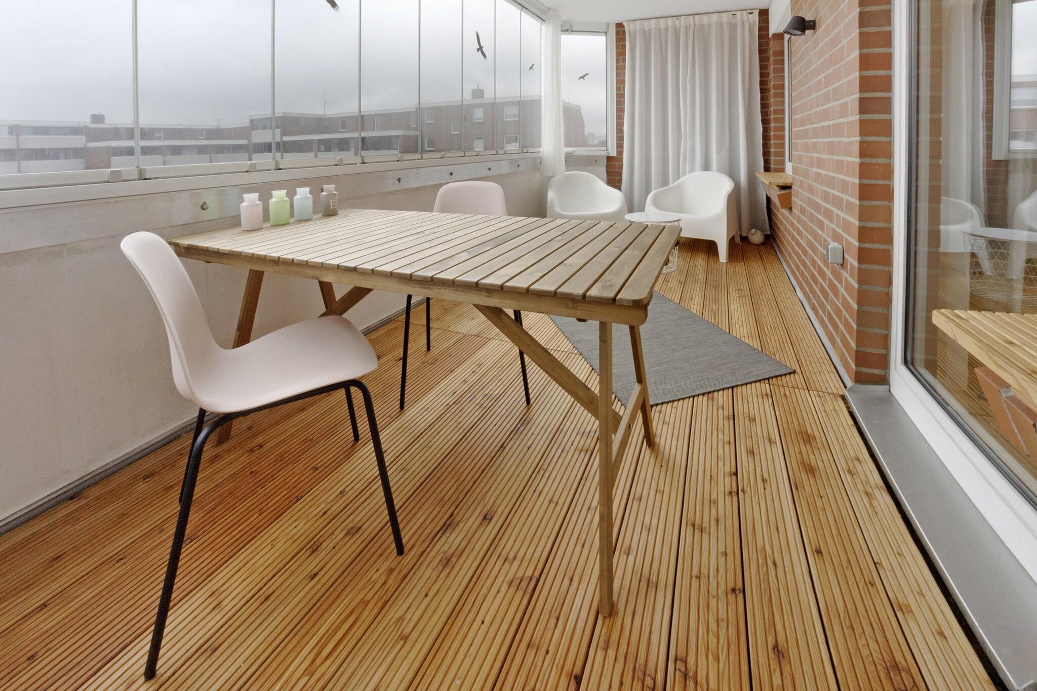 På 2. etage: (åbent køkken(kakkelovn, brødrister, kaffemaskine, ovn, køle-fryseskab), stue / spisestue(Fjernsyn, sofahjørne), soveværelse(enkeltseng, enkeltseng), badeværelse(bruser, håndvask, toilet), balkon) varme, terrasse, cykelopbevaring, parkering