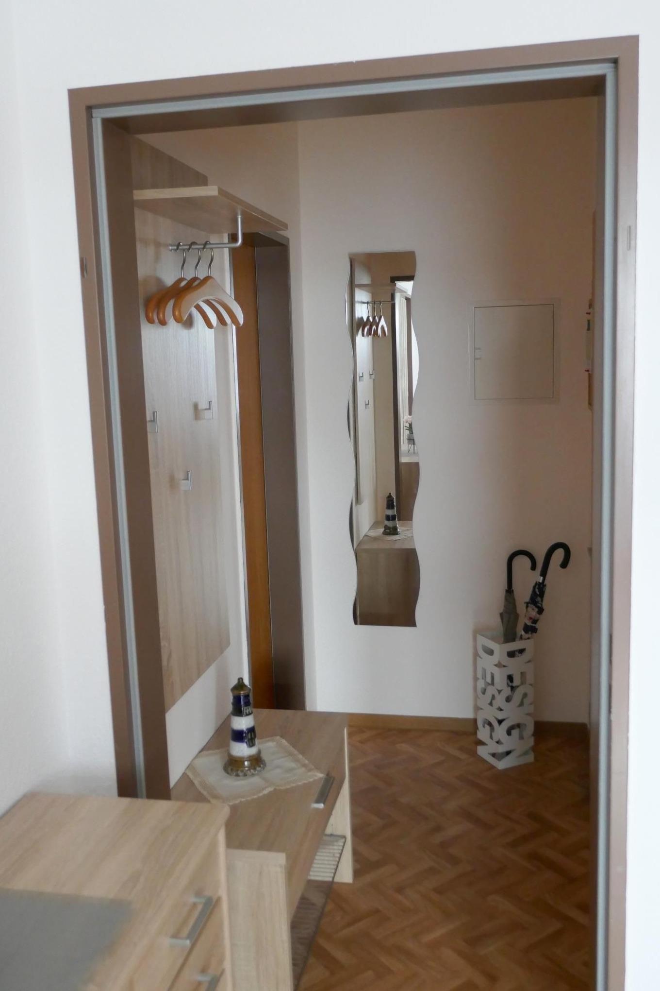 Ausstattung: Sat-TV mit Flachbildschirm, Radio, Kühlschrank, Herd mit Ceranfeld und Backofen, Kaffeemaschine, Mikrowelle, Wasserkocher, Eierkocher, Toaster, Bügeleisen, Elektrogrill, Stühle und Tisch auf dem verglasten Balkon, Zentralheizung, Fenster mit elektrischen Rolläden.