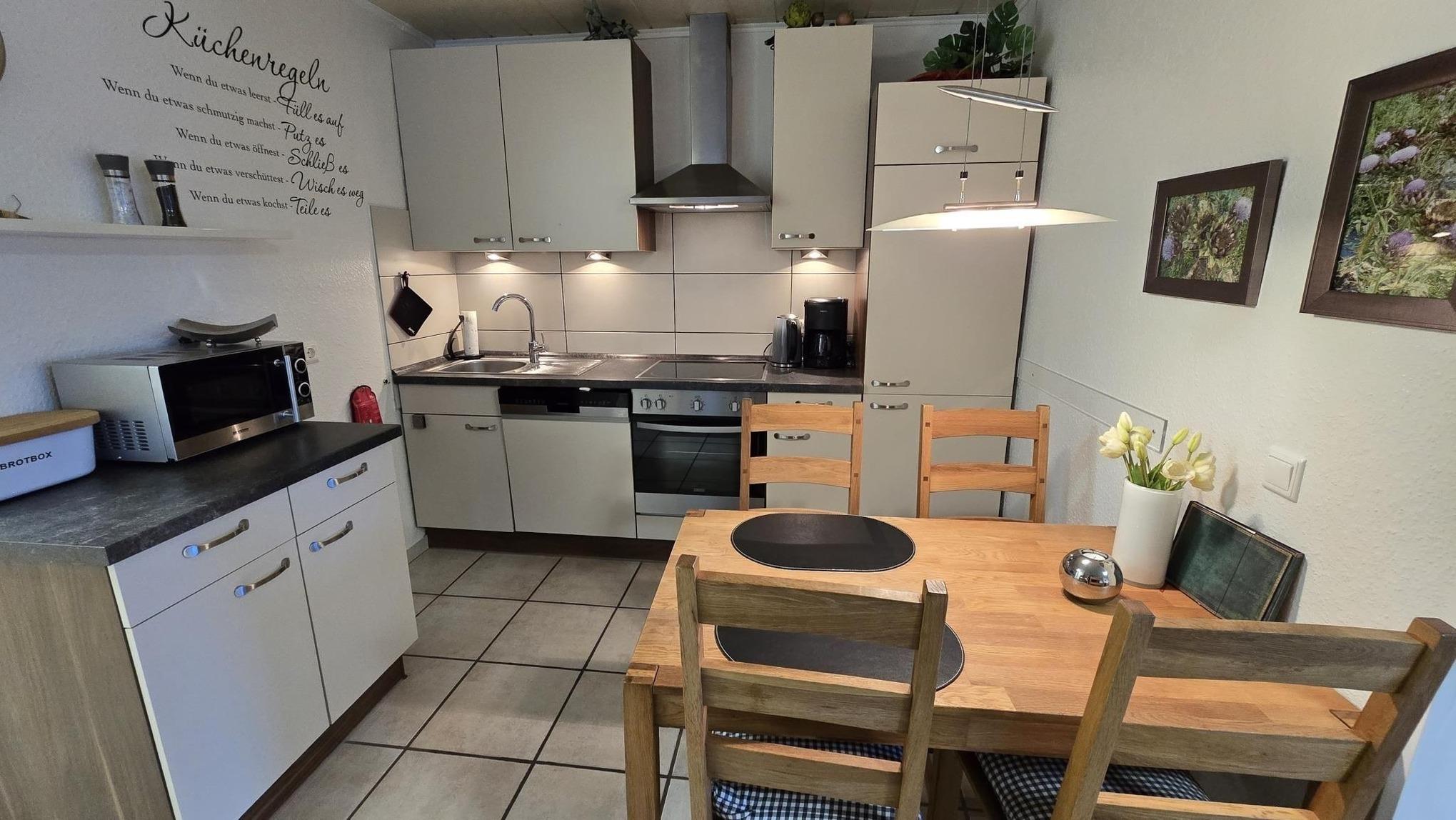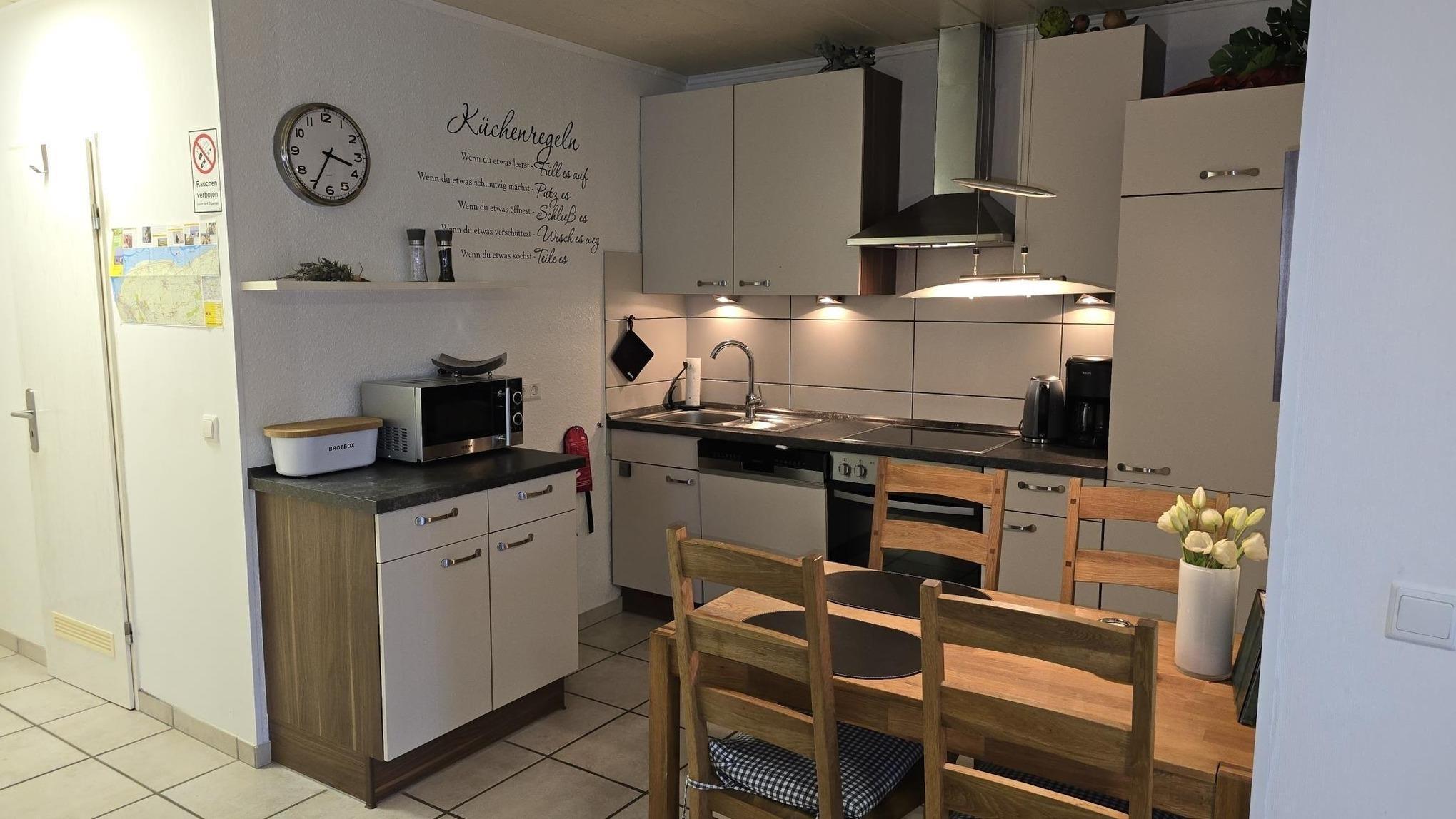 Die gemütliche Wohnung im Erdgeschoss des Hauses Baltrum in Dornumersiel bietet Platz für 2 bis 4 Personen und überzeugt durch ihre durchdachte Raumaufteilung. Im Wohnzimmer lädt eine moderne Küche mit kompletter Ausstattung, inklusive Spülmaschine, zum Kochen ein. Das Schlafzimmer ist mit einem komfortablen Doppelbett (1,60 x 2,00 m) ausgestattet. Die Dusche mit WC und eine Waschmaschine im Münzautomat sorgen für zusätzlichen Komfort. Die Wohnung verfügt über kostenfreies WLAN und einen sat TV mit 56 cm Flachbildschirm sowie eine Stereoanlage mit CD-Player. Eine Gartenterrasse mit Gartenmöbeln, Bank und Gartenliege lädt zum Verweilen ein. Für Fahrräder ist ein Abstellraum im Keller vorhanden. Ein Bollerwagen und ein zugehöriger PKW-Stellplatz runden das Angebot ab. Alle Fenster sind mit Insektenschutz ausgestattet und eine Markise schützt vor Sonne.