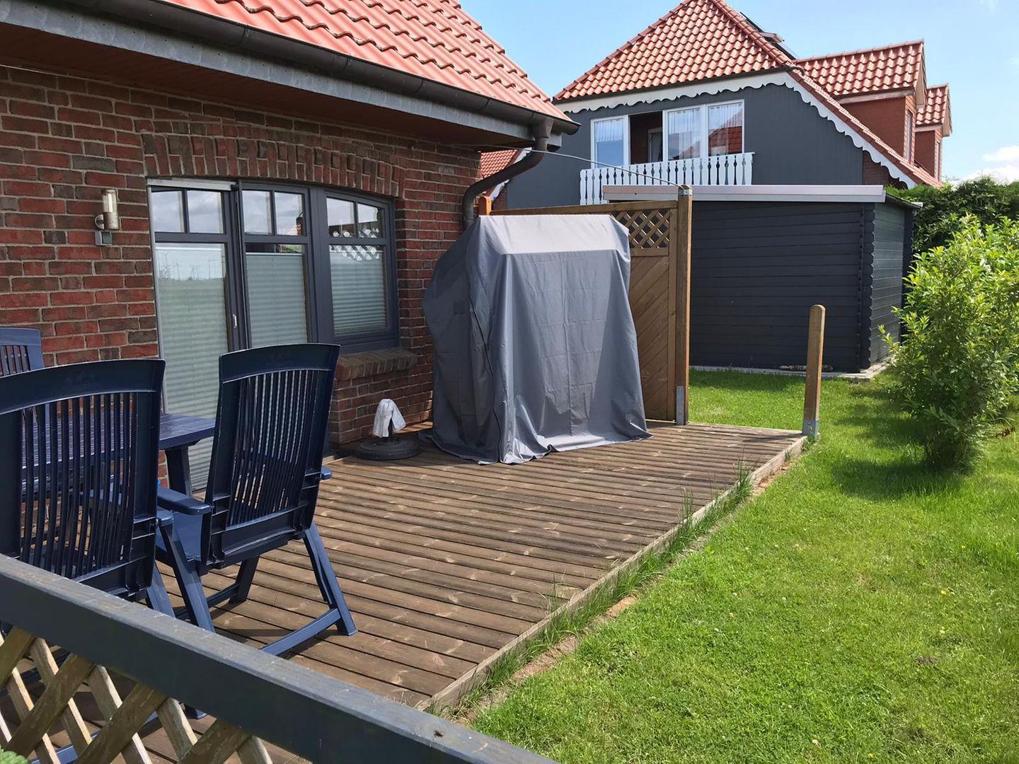 Draußen lädt die sonnige Terrasse mit Gartenmöbeln dazu ein, den Tag gemütlich ausklingen zu lassen. Der Garten ist größtenteils eingezäunt, während eine dichte Hecke auf der offenen Seite für Privatsphäre sorgt. Ein besonderes Plus ist die Garage, die nicht nur Stauraum bietet, sondern auch Fahrräder und Grills bereitstellt, die Sie während Ihres Aufenthalts nutzen können. Eigene Fahrräder finden hier ebenfalls einen sicheren Platz.