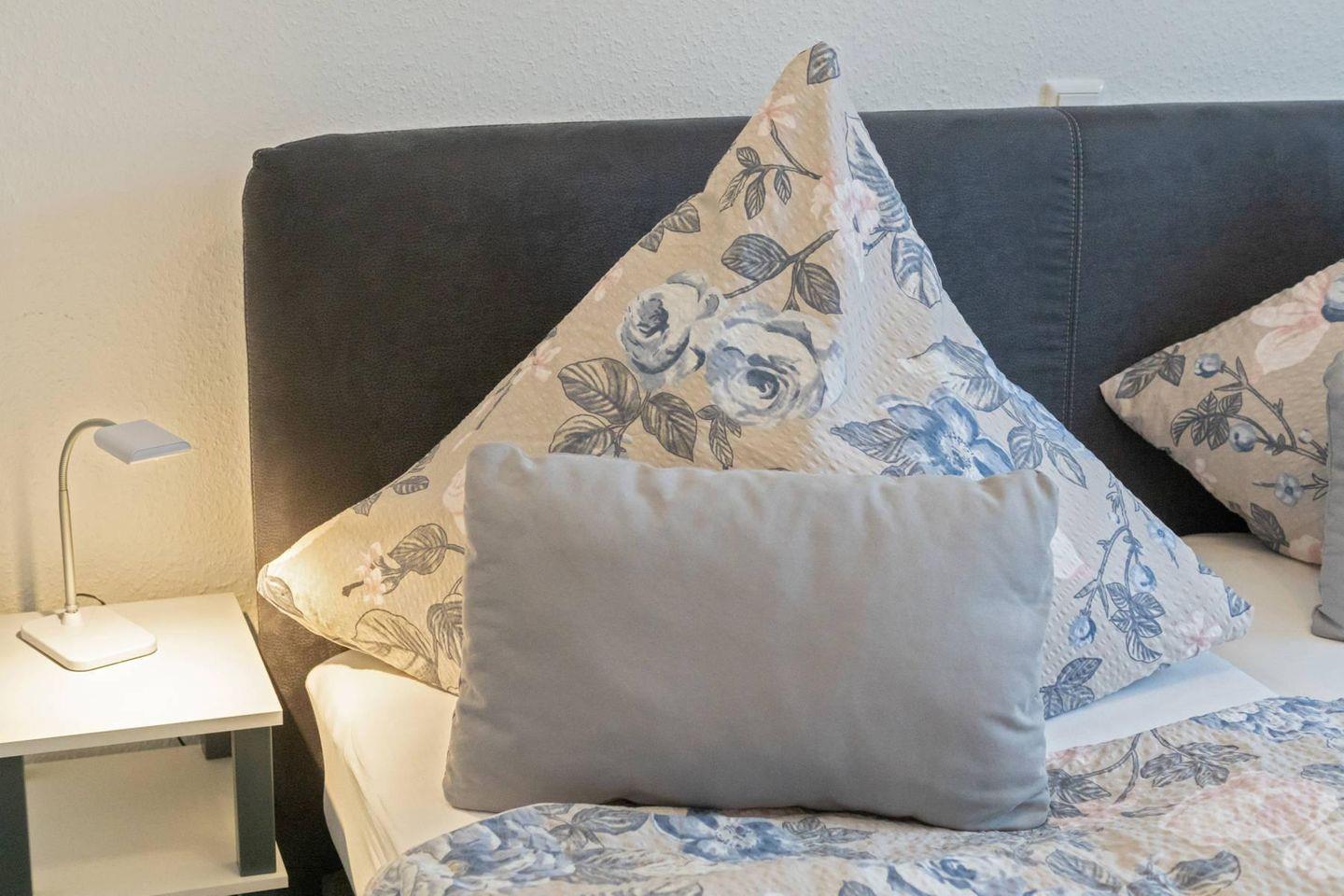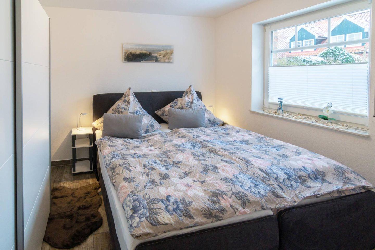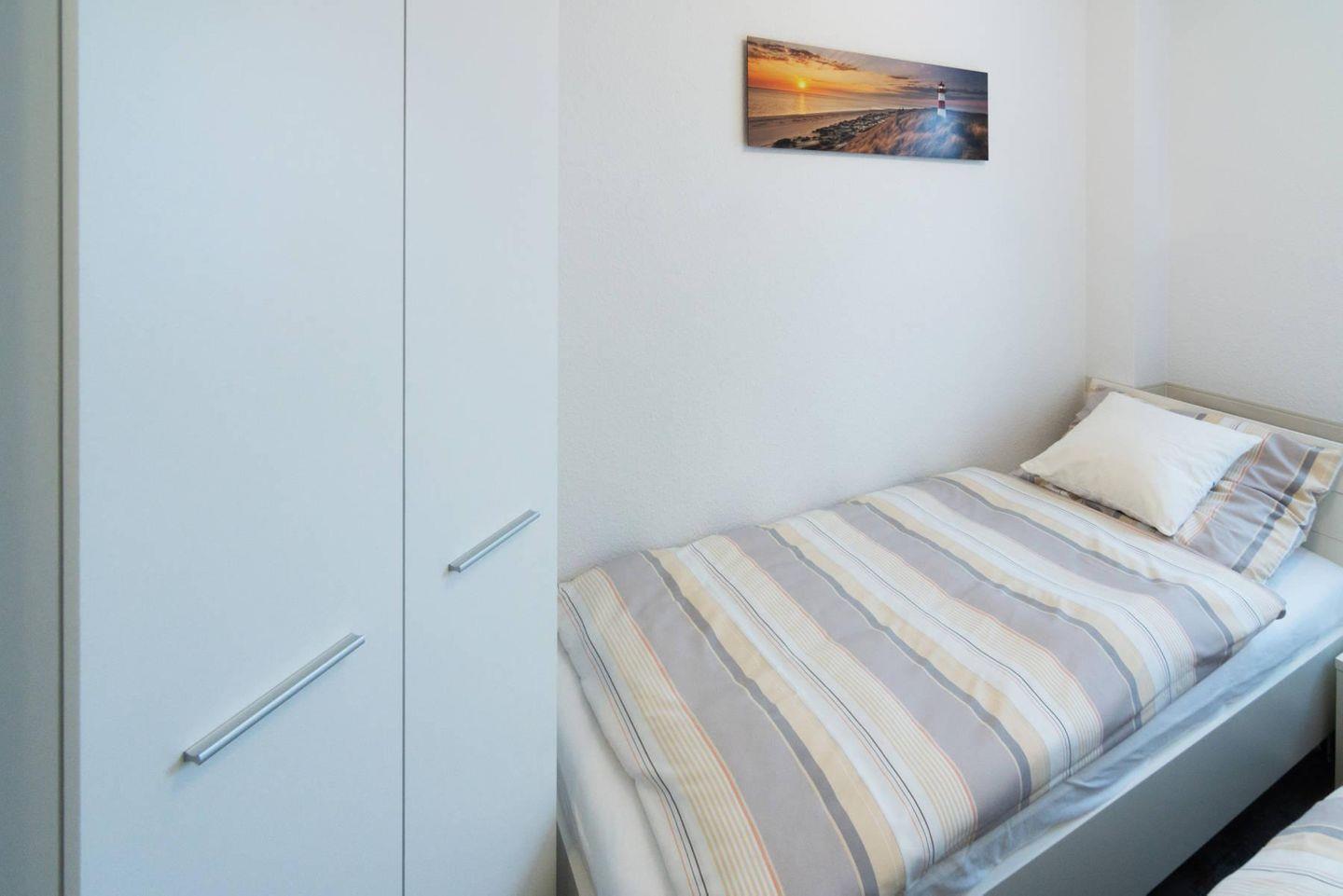 Die Wohnung umfasst drei Zimmer, darunter zwei separate Schlafzimmer – eines mit elektrischem Boxspringbett, das andere mit zwei Einzelbetten (1,90 x 0,80 m, auch zusammenstellbar, mit Bettrausfallschutz). Zudem gibt es ein Duschbad mit WC und einen Abstellraum. Kinder und Babys sind willkommen, ein Hochstuhl ist vorhanden.