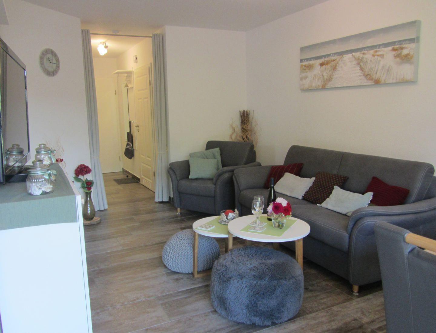 Der helle Wohnbereich ist gemütlich eingerichtet mit Sofaecke, zwei TVs, DVD-/CD-Player, Spielen und Büchern. Fußbodenheizung, Fliegengitter, Sichtschutz und WLAN über GigaCube sorgen für Komfort.