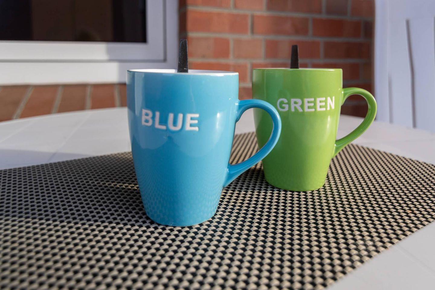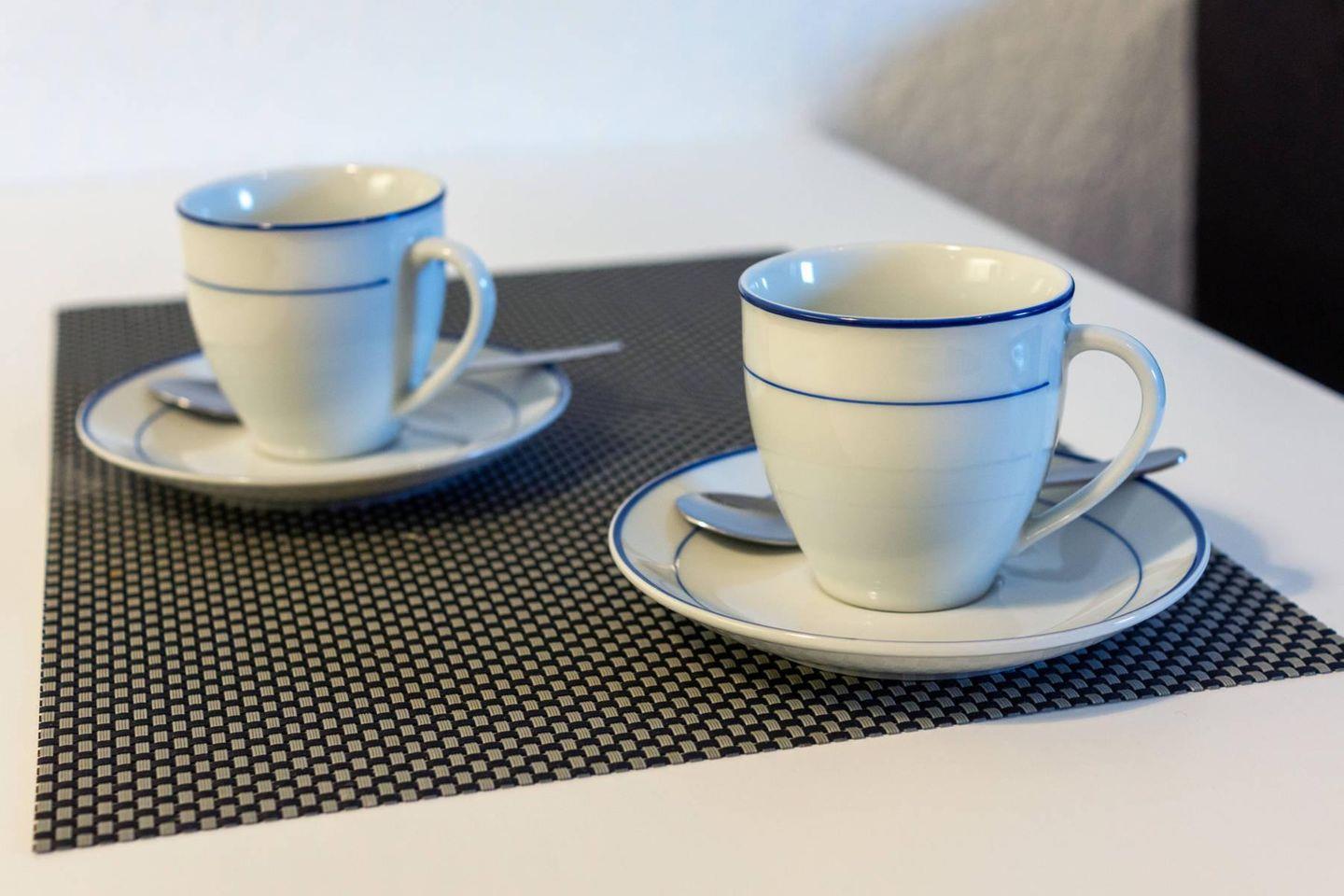 Die offene Küche ist voll ausgestattet mit Spülmaschine, Backofen, Herd, Kühlschrank mit Gefrierfach, Kaffeemaschine, Wasserkocher, Toaster, Geschirr und Besteck – ideal für Selbstversorger. Eine moderne Heizung sorgt für angenehme Temperaturen.