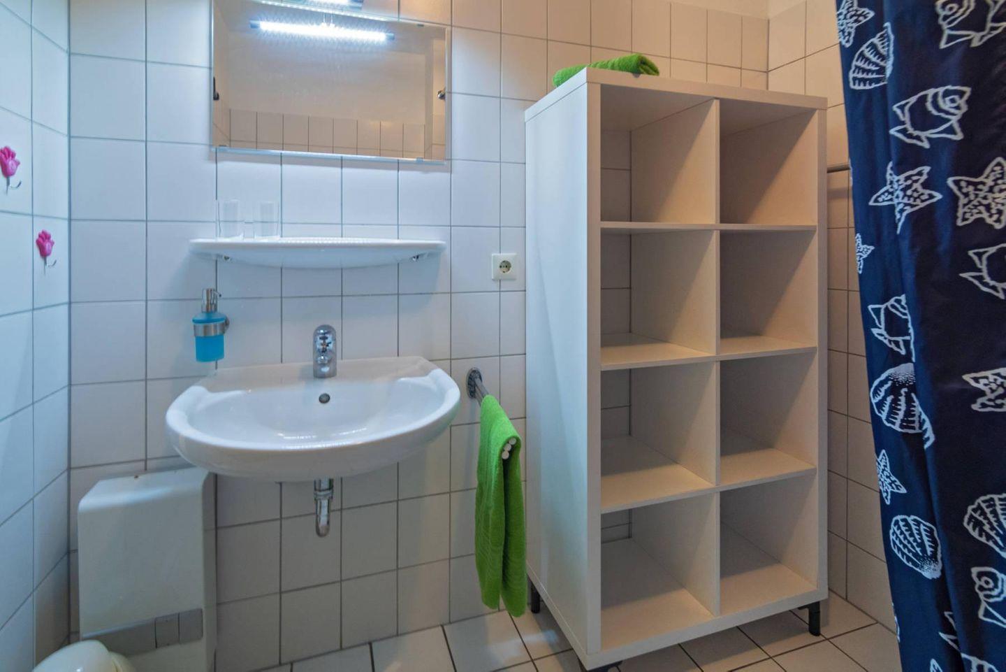 Das Badezimmer ist mit Dusche, Waschbecken, WC und Spiegel funktional eingerichtet.