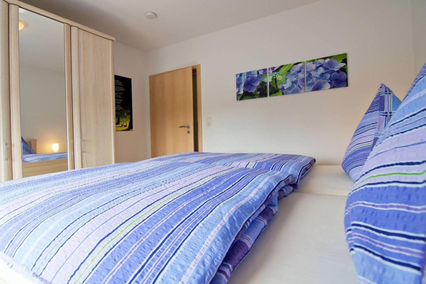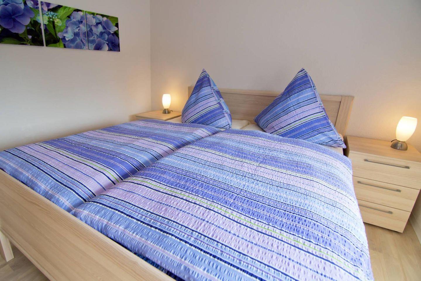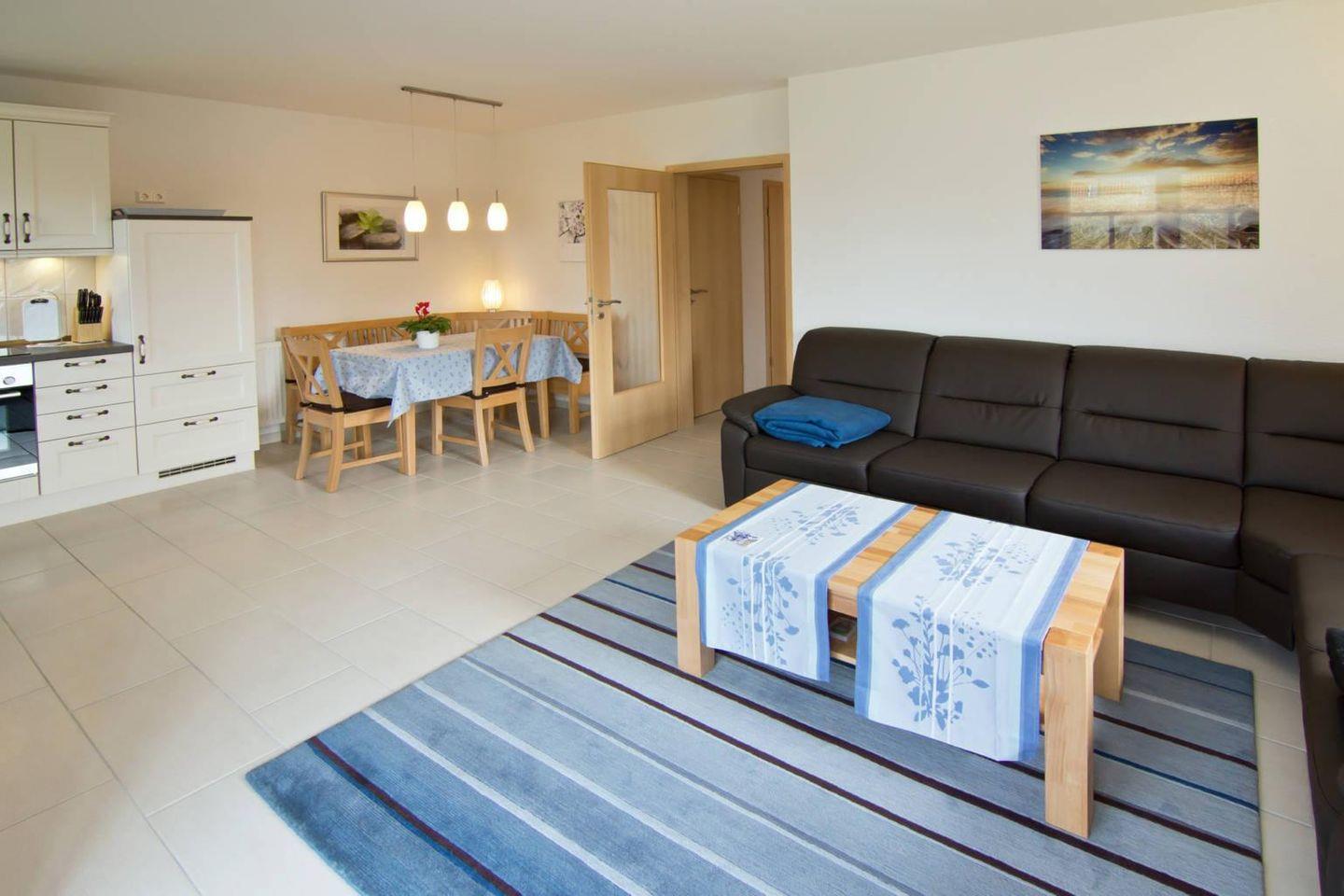 Im großzügigen Wohn- und Essbereich können Sie gemeinsam entspannte Stunden verbringen. Die angrenzende, voll ausgestattete Küche lässt keine Wünsche offen und bietet alles, was Sie zur Zubereitung Ihrer Mahlzeiten benötigen. Zwei Schlafzimmer bieten Ihnen jeweils den nötigen Komfort – ein Schlafzimmer mit Ehebett und das andere mit zwei Einzelbett.