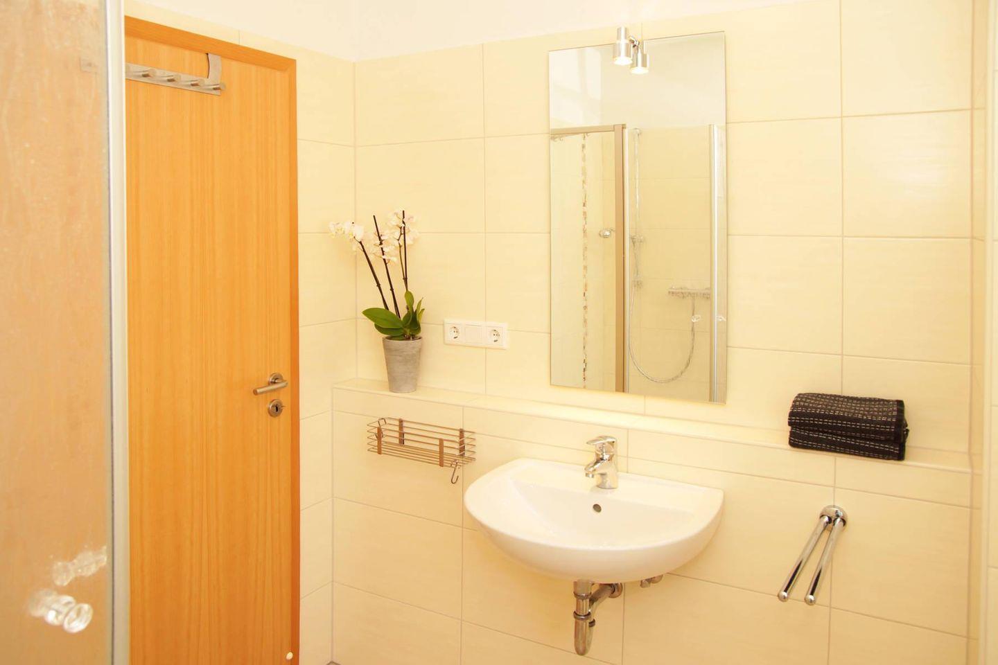 Das Bad verfügt über Dusche mit Wanne, Waschbecken, Spiegel, Fenster und Föhn. Zusätzlich gibt es ein Gäste-WC. Eine Waschmaschine, Bügeleisen und Staubsauger stehen bereit.