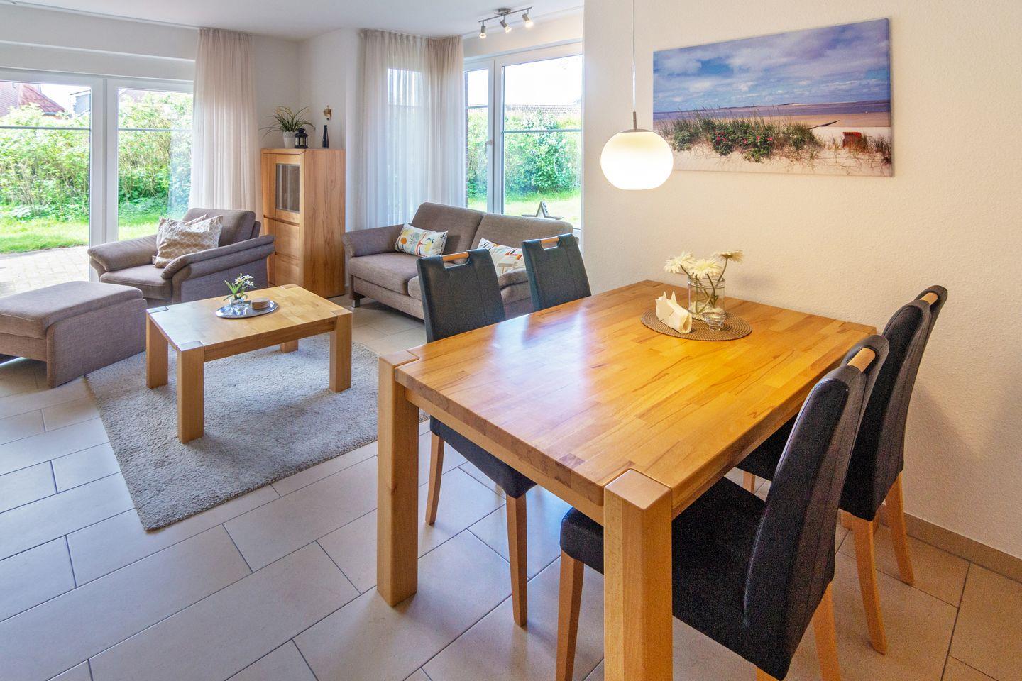Modernes, helles Nichtraucher-Ferienhaus in Dornumersiel – ruhig und zentral gelegen. Mit Terrasse, Loungeecke und Garten bietet es auf 75?m² Platz für 4 Personen und ein Kleinkind. WLAN inklusive. Supermarkt mit Bäckerei (auch sonntags), Restaurants, Eisdiele und Fahrradverleih sind fußläufig erreichbar. Strand und Hafen liegen am idyllischen Mahlbusen mit Minigolf und Tretbootverleih. Haustiere sind aus Rücksicht auf Allergiker nicht erlaubt. Ideal auch für Familienurlaub mit Freunden.
