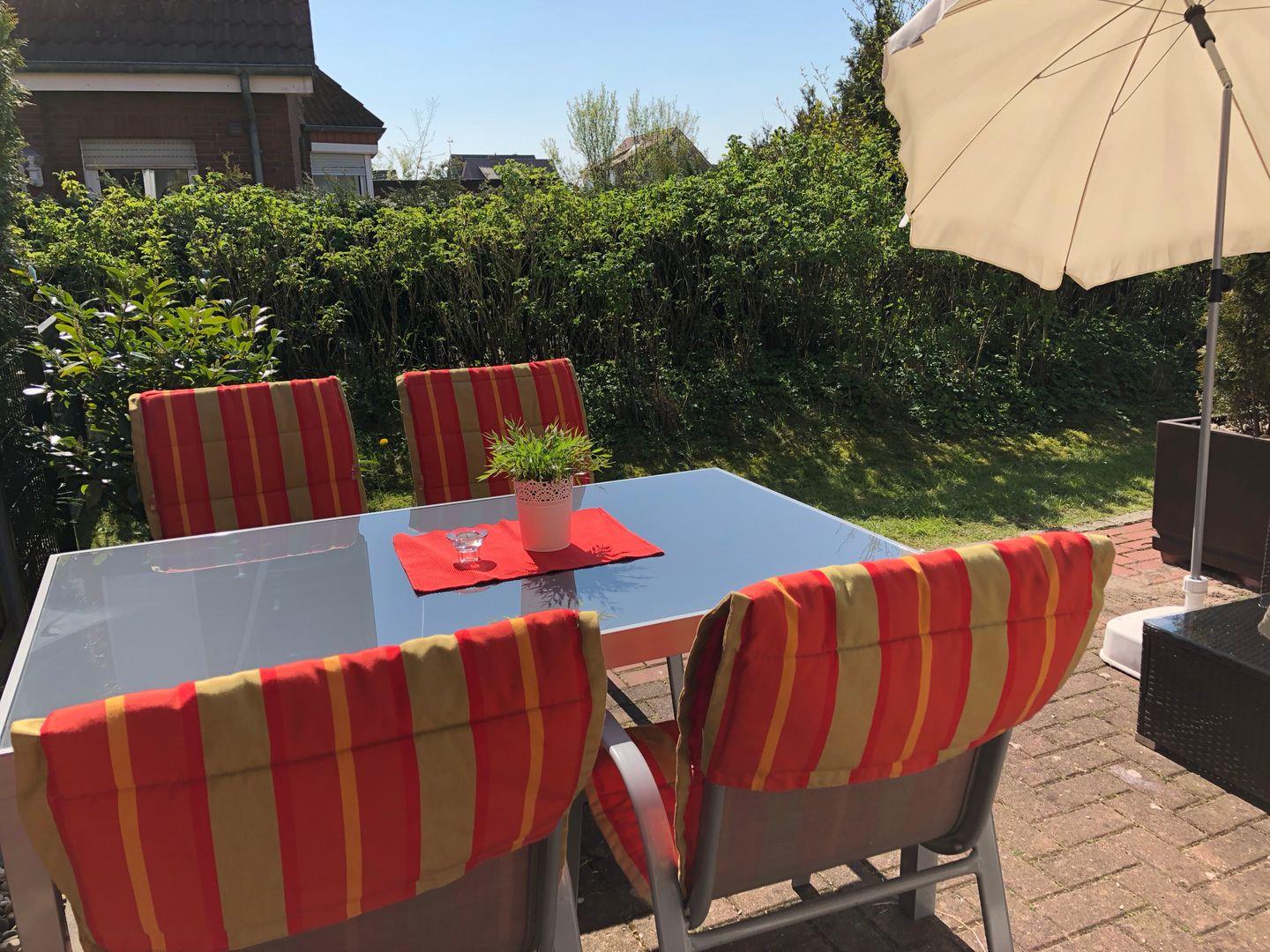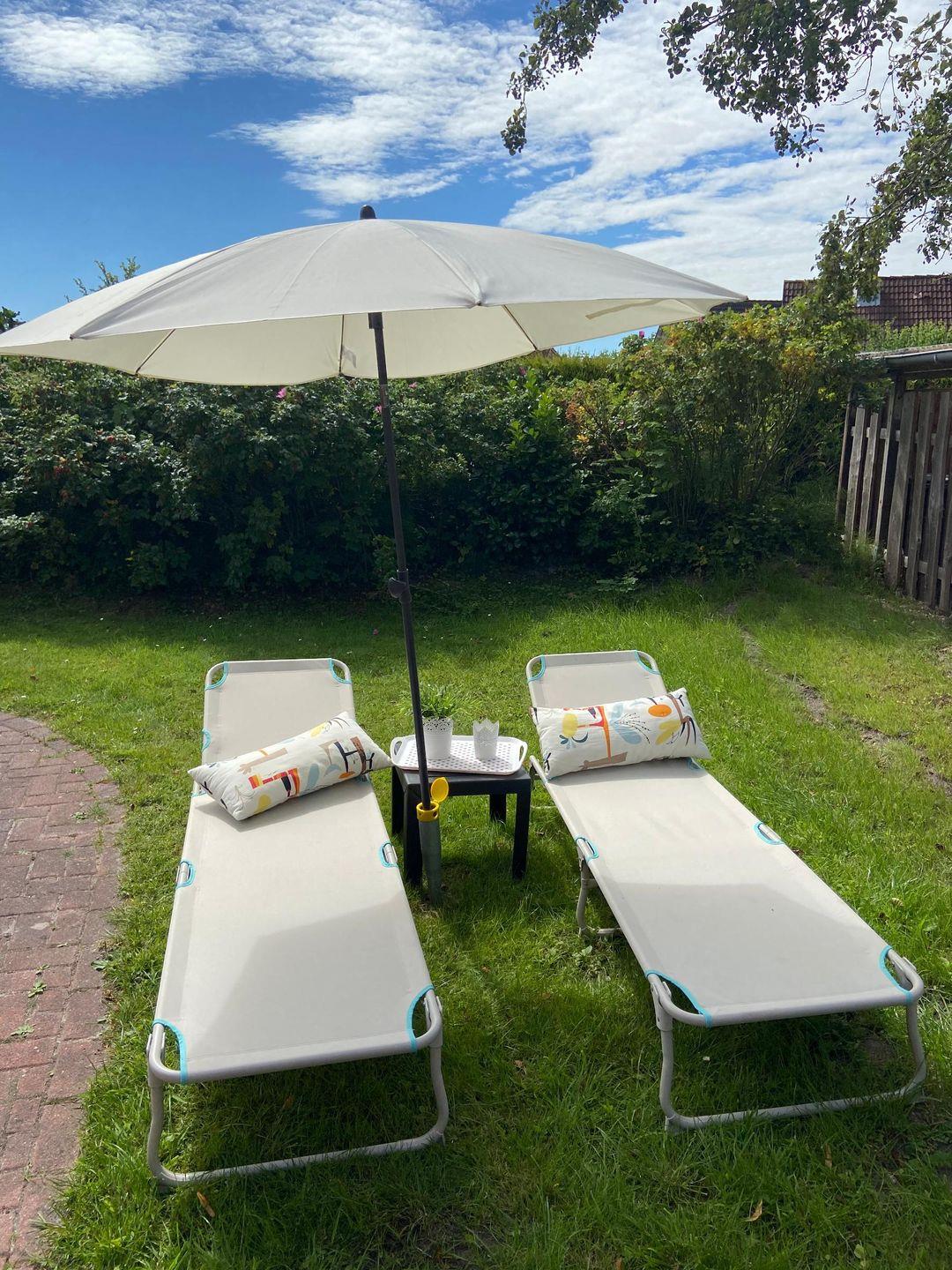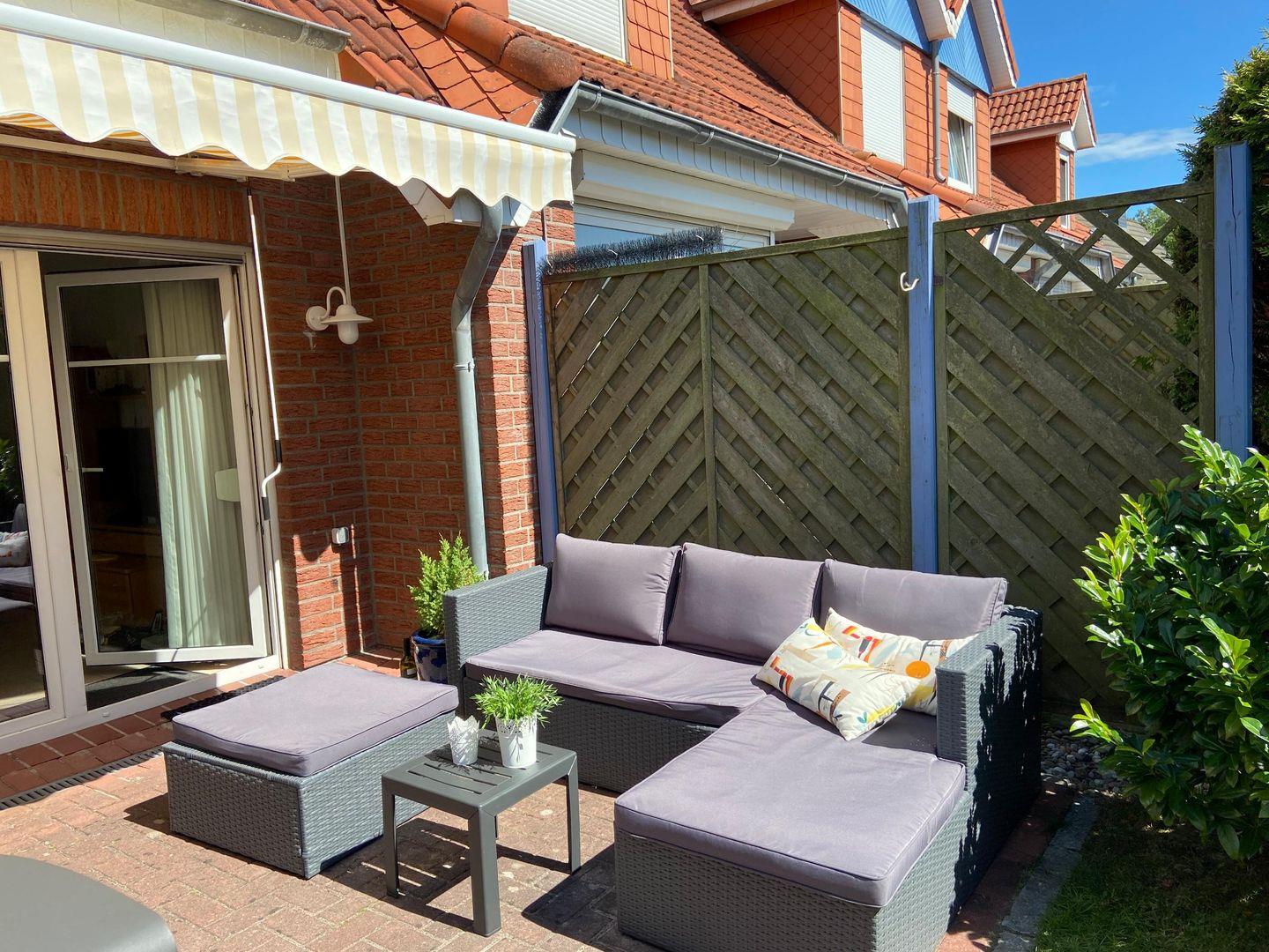 Zur Ausstattung gehören: kostenloser Parkplatz am Haus, möblierte Terrasse mit Markise, Garten mit Sitzplätzen, Elektrogrill und Außendusche. Fenster mit Sicht- und Sonnenschutz sorgen für Privatsphäre.