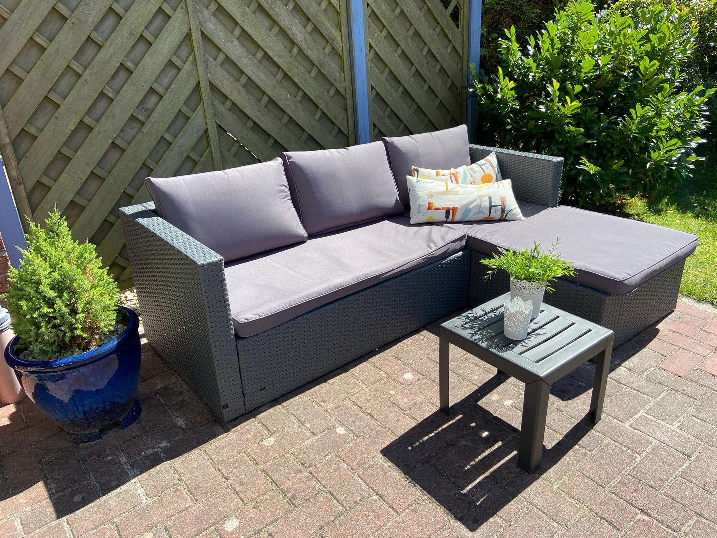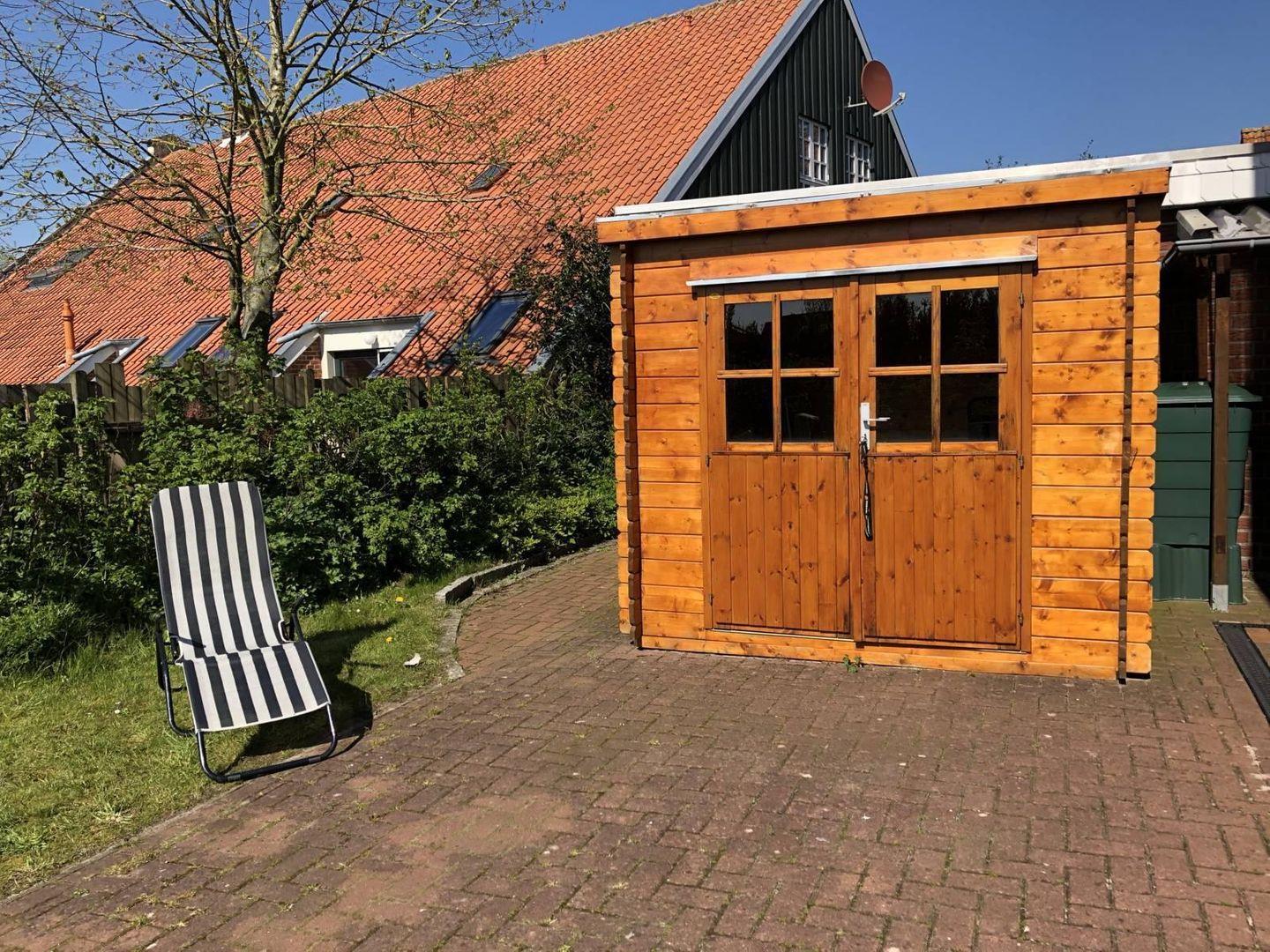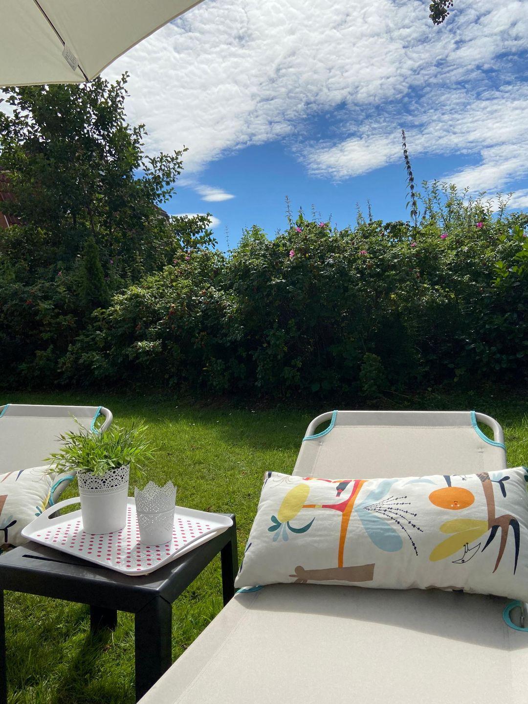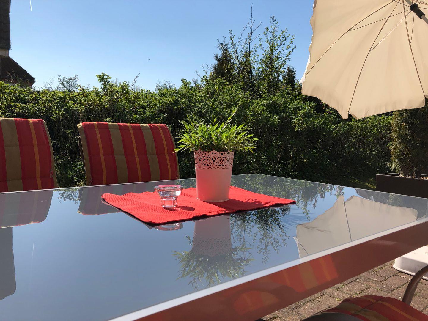 Zur Ausstattung gehören: kostenloser Parkplatz am Haus, möblierte Terrasse mit Markise, Garten mit Sitzplätzen, Elektrogrill und Außendusche. Fenster mit Sicht- und Sonnenschutz sorgen für Privatsphäre.