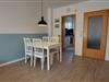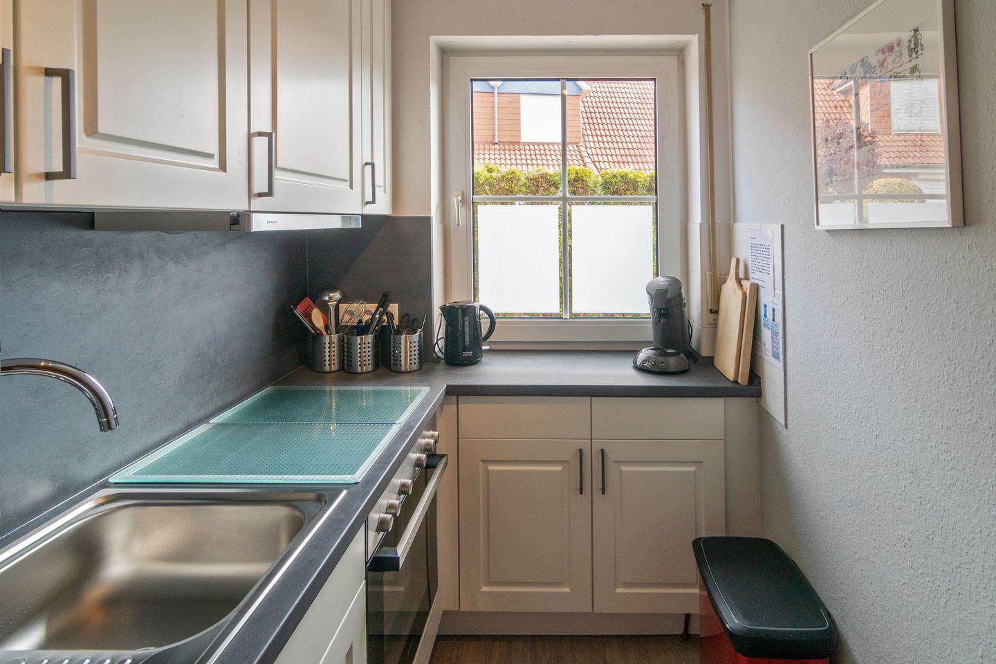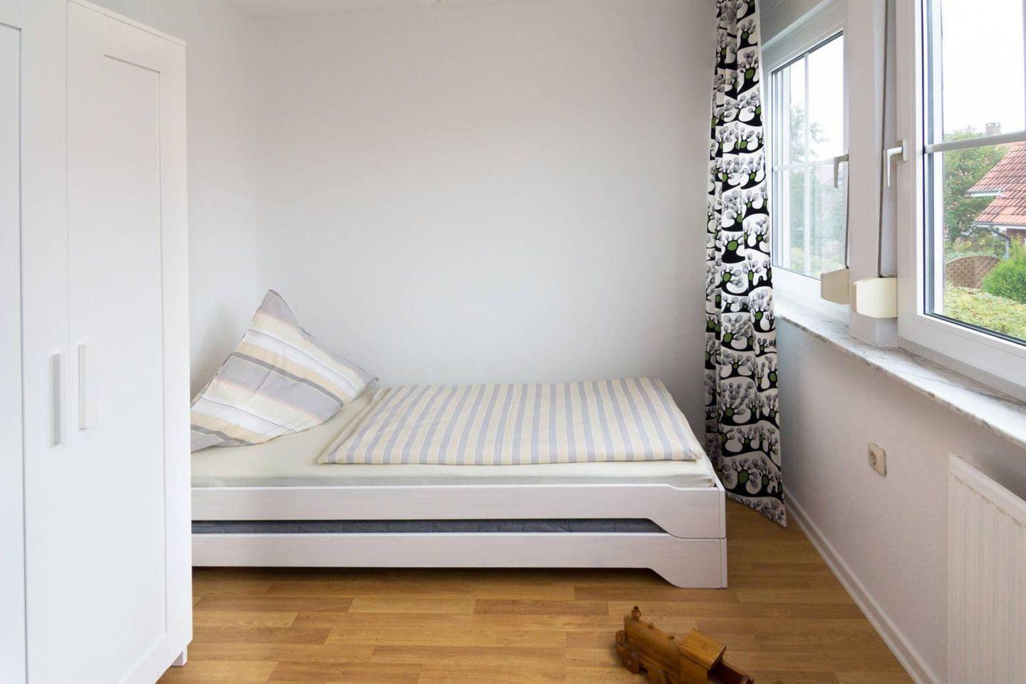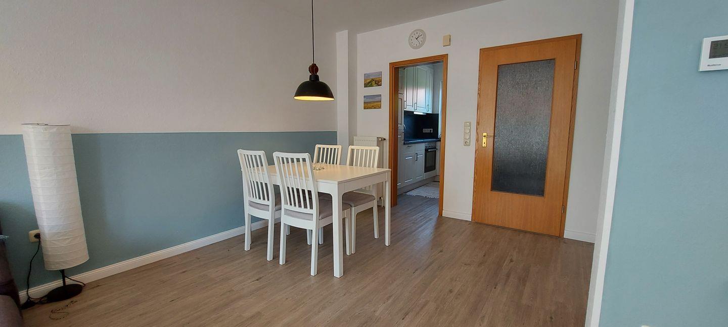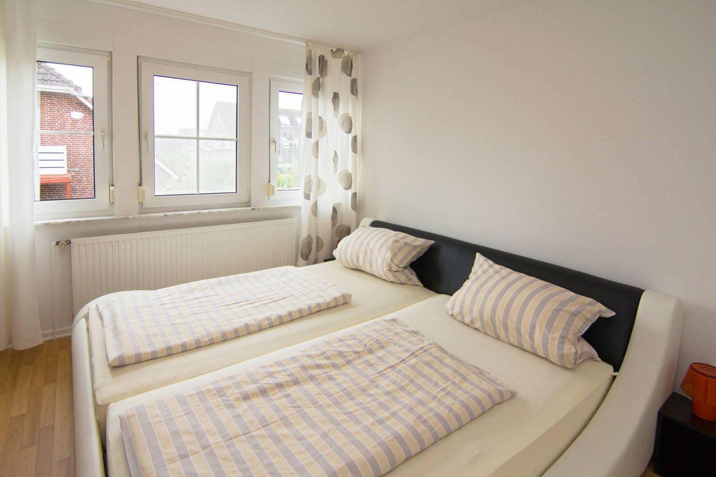 Das hell eingerichtete Reihenhaus verfügt im Erdgeschoß über einen Wohn- und Essbereich, eine separate voll ausgestattete Küche und ein Gäste-WC. Im Obergeschoß befinden sich ein Schlafzimmer mit Ehebett sowie ein Schlafzimmer mit zwei Stapelbetten (ungenügend für Erwachsene, dies ist zu beachten). Außerdem ein Duschbad mit WC. Zur Wohnung gehört eine Terrasse mit Garten und ein eigener PKW-Stellplatz. in diesem Ferienhaus ist das Mitbringen von einem Hund (kostenpflichtig) erlaubt.