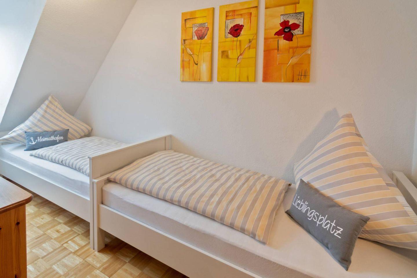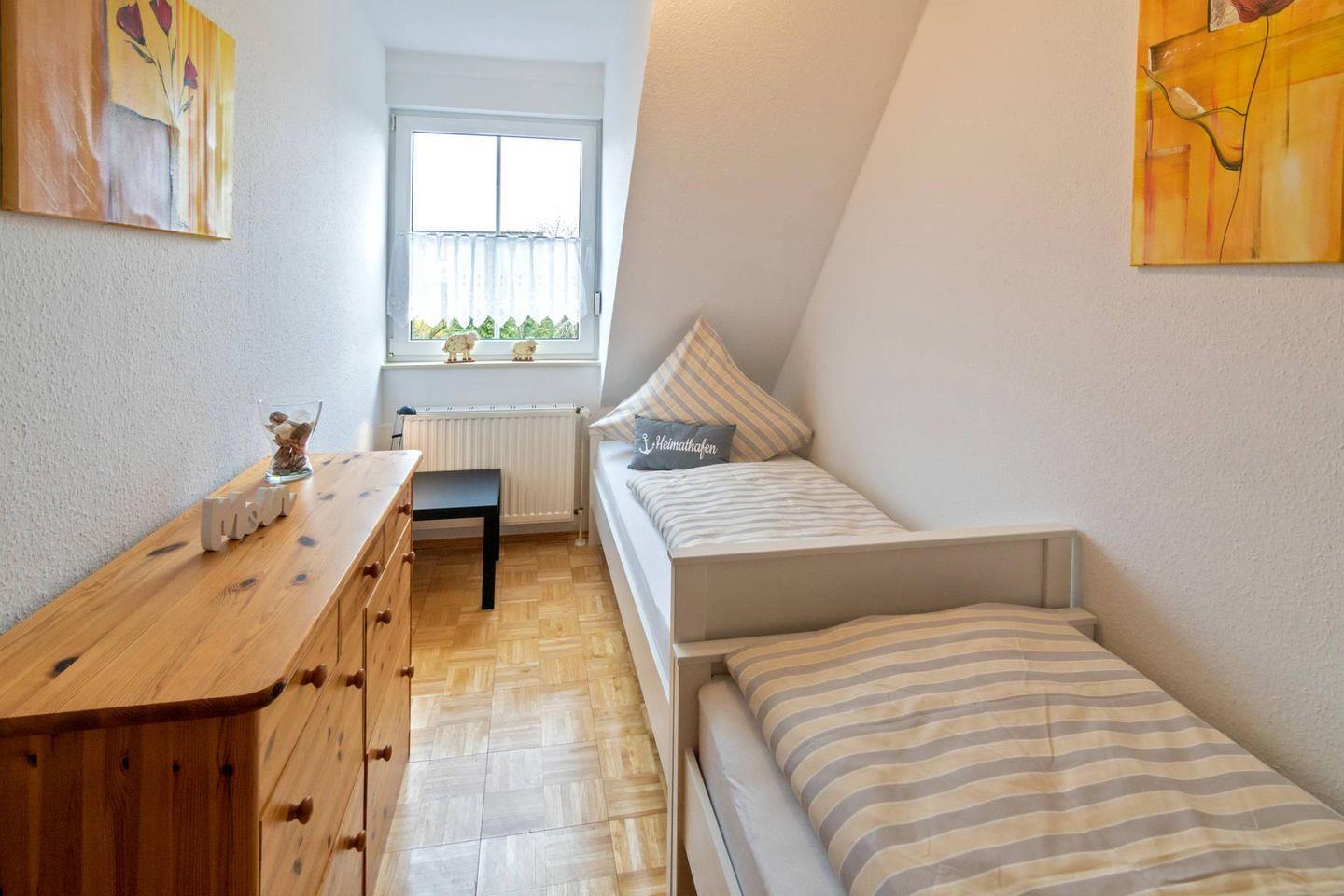 Im Obergeschoss finden Sie zwei Schlafzimmer – eines mit einem Doppelbett und das andere mit zwei Einzelbetten – sowie ein zusätzliches Badezimmer mit Badewanne und WC. Über eine platzsparende Treppe gelangen Sie von einem der Schlafzimmer in ein weiteres Zimmer im Dachgeschoss, das mit einem bequemen Schlafsofa ausgestattet ist. Dieser Raum ohne Tür eignet sich besonders gut als Rückzugsort oder als Spielbereich für Kinder.