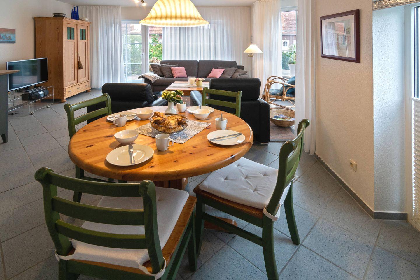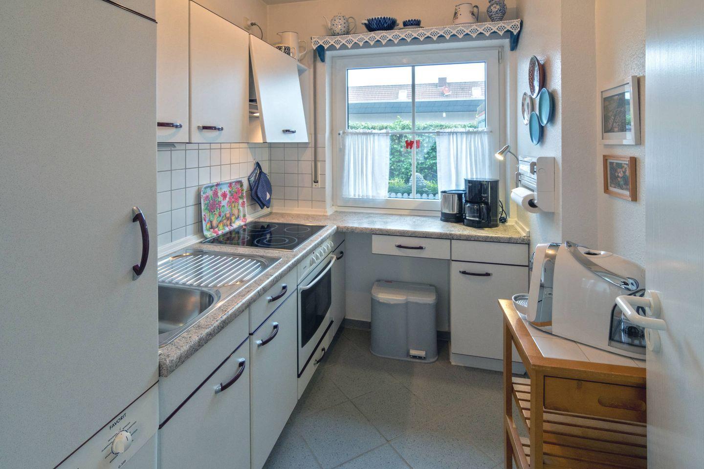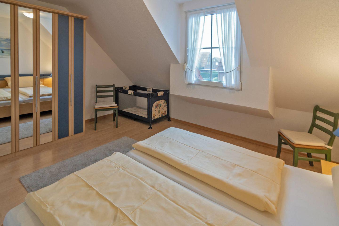 Die ruhig gelegene Doppelhaushälfte verfügt im Erdgeschoss über einen gemütlichen Wohn- und Essbereich mit voll ausgestatteter Küche, ein Gäste-WC und einen Abstellraum. Im Obergeschoss befinden sich zwei Schlafzimmer und ein Duschbad mit WC. Ein Schlafzimmer ist mit einem Doppelbett ausgestattet und bietet Platz für das Kleinkindbett, im zweiten Schlafzimmer befinden sich zwei Einzelbetten. Zum Haus gehört eine Terrasse und ein Abstellraum für zwei Fahrräder. Das WLAN steht Ihnen selbstverständlich kostenlos zur Verfügung.