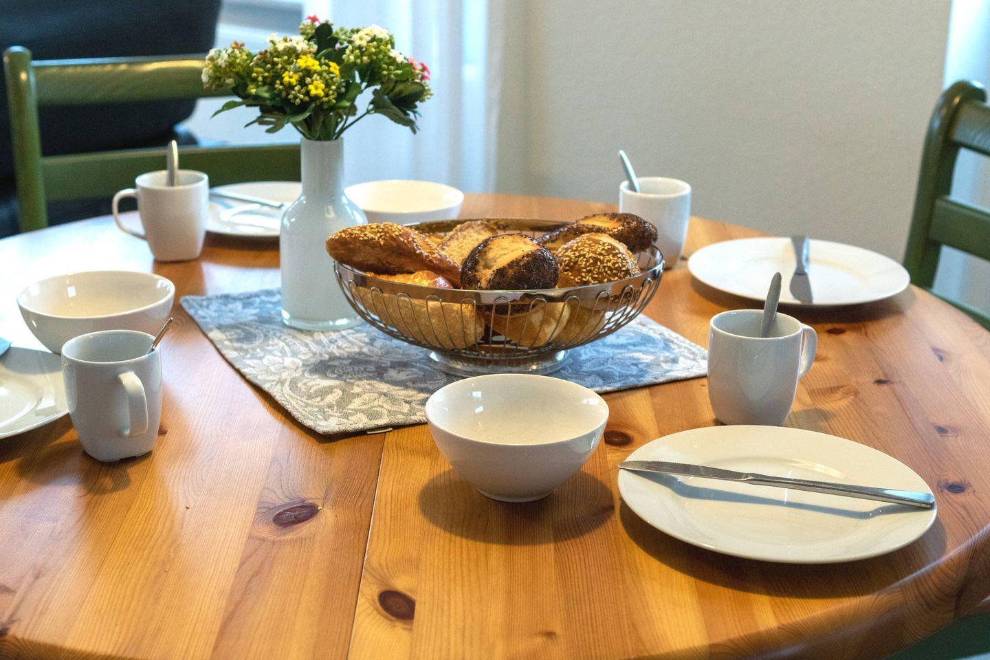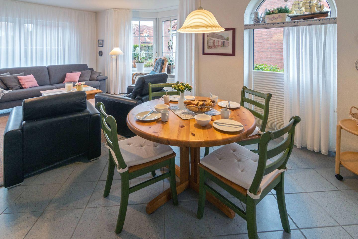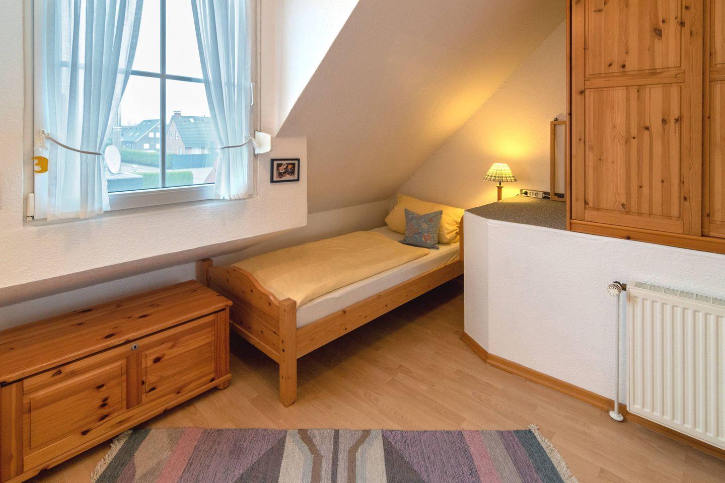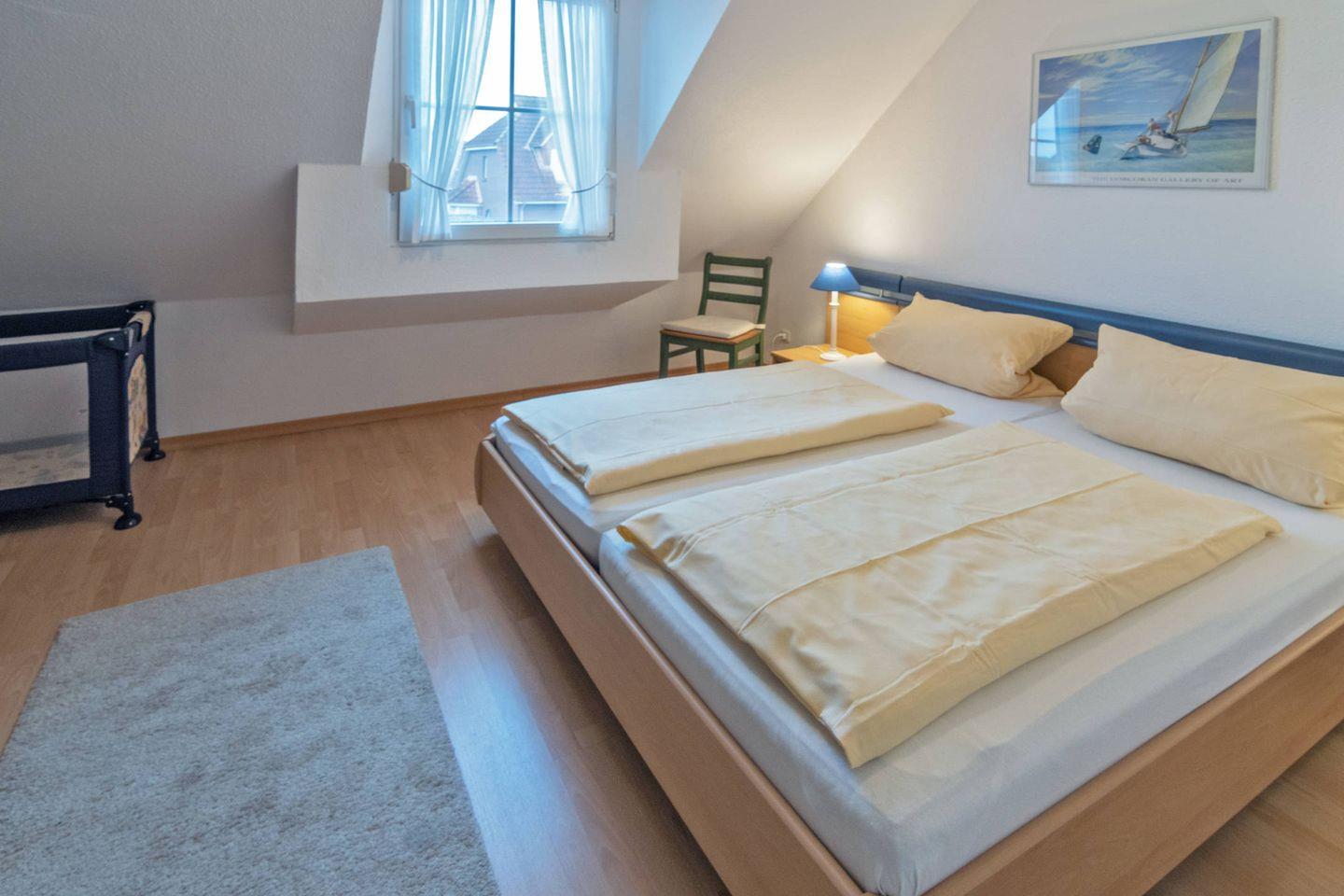 Die ruhig gelegene Doppelhaushälfte verfügt im Erdgeschoss über einen gemütlichen Wohn- und Essbereich mit voll ausgestatteter Küche, ein Gäste-WC und einen Abstellraum. Im Obergeschoss befinden sich zwei Schlafzimmer und ein Duschbad mit WC. Ein Schlafzimmer ist mit einem Doppelbett ausgestattet und bietet Platz für das Kleinkindbett, im zweiten Schlafzimmer befinden sich zwei Einzelbetten. Zum Haus gehört eine Terrasse und ein Abstellraum für zwei Fahrräder. Das WLAN steht Ihnen selbstverständlich kostenlos zur Verfügung.