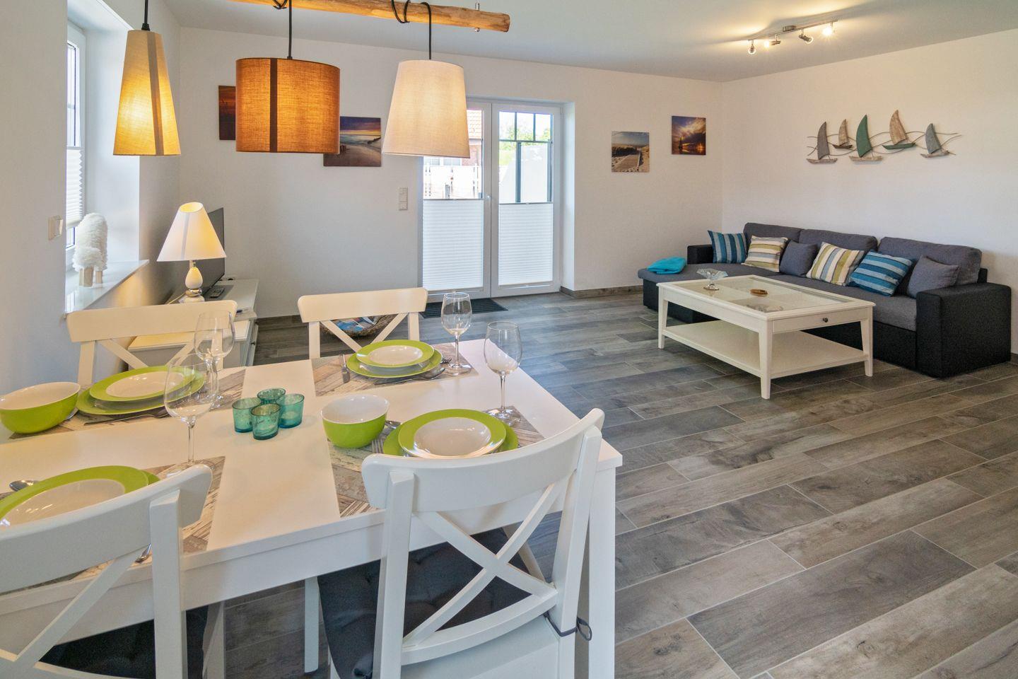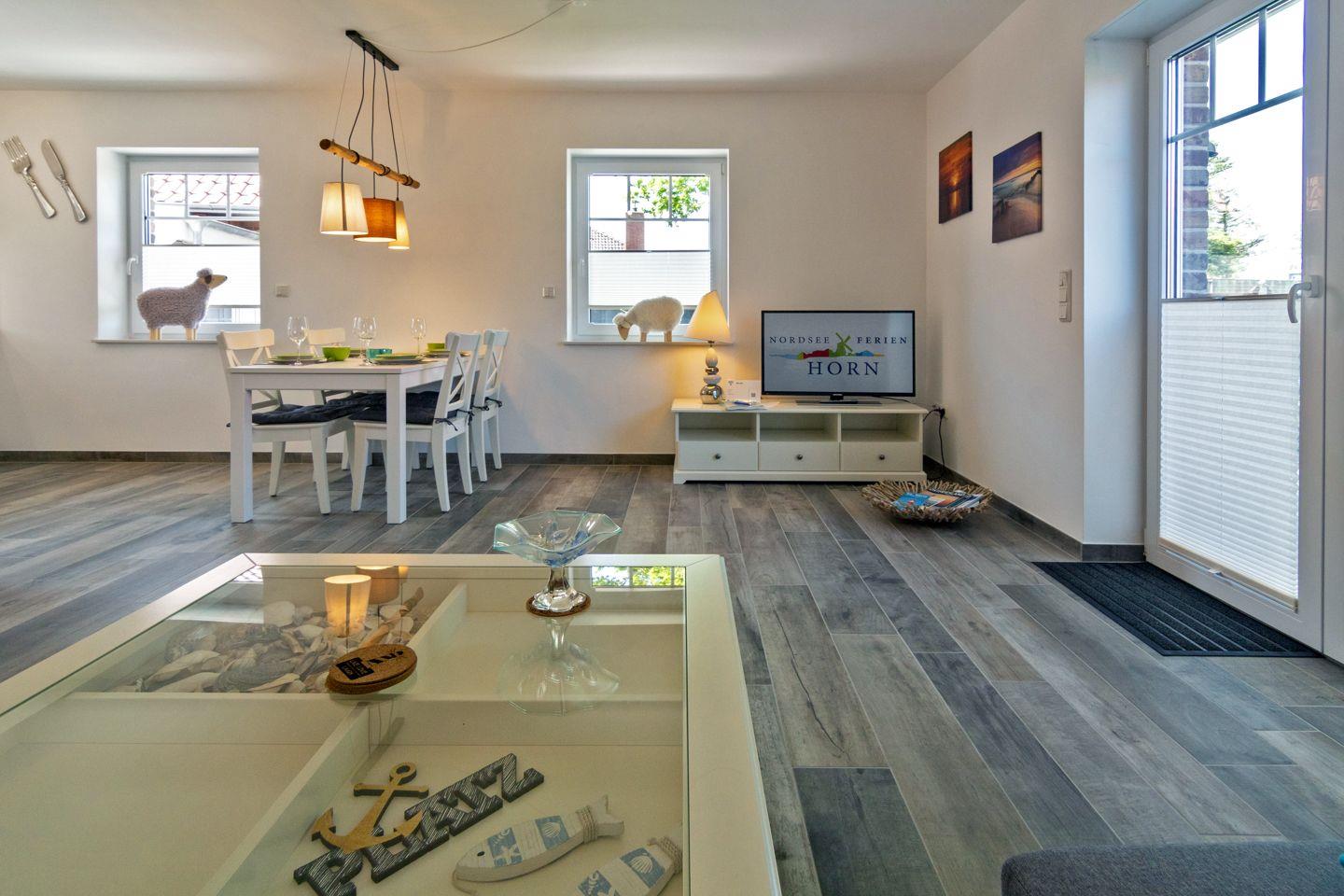 Das moderne Ferienhaus "To Huus" in Dornumersiel überzeugt mit seiner ruhigen, zentralen Lage und bietet Platz für 4 Personen und ein Kleinkind. Es verfügt über einen großzügigen Wohn- und Essbereich, eine voll ausgestattete Küche, zwei Schlafzimmer, ein Gäste-WC und ein modernes Duschbad. Zur Ausstattung gehören kostenloses WLAN, ein eingezäunter Garten mit Terrasse und ein PKW-Stellplatz. Haustiere sind nicht erlaubt.