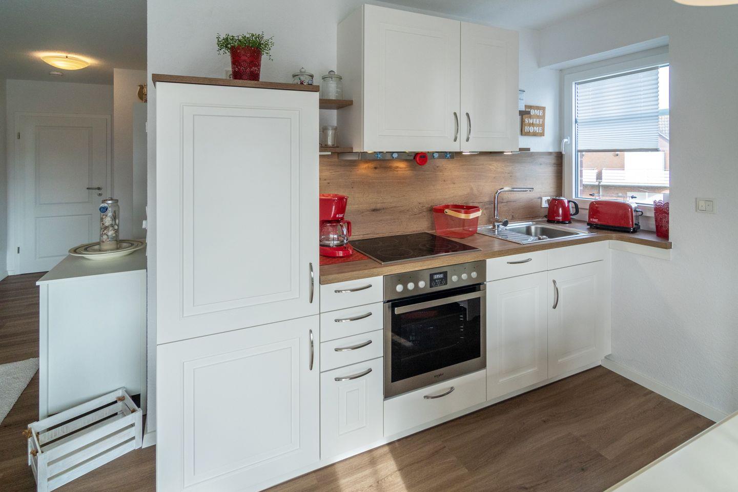 Die offene Küche neben dem Wohnzimmer ist mit modernen Geräten ausgestattet, darunter ein Herd, ein Backofen, sowie eine Spülmaschine und ein Kühlschrank mit Gefrierfach. Hier können Sie Ihre Kochkünste entfalten und köstliche Mahlzeiten zubereiten. Des Weiteren stehen Ihnen Küchenutensilien, Wasserkocher, Toaster und eine Kaffeemaschine zur Verfügung, sodass Sie sich rundum wohlfühlen können.