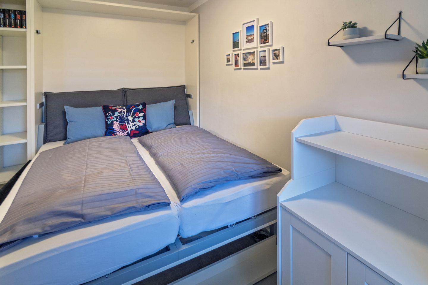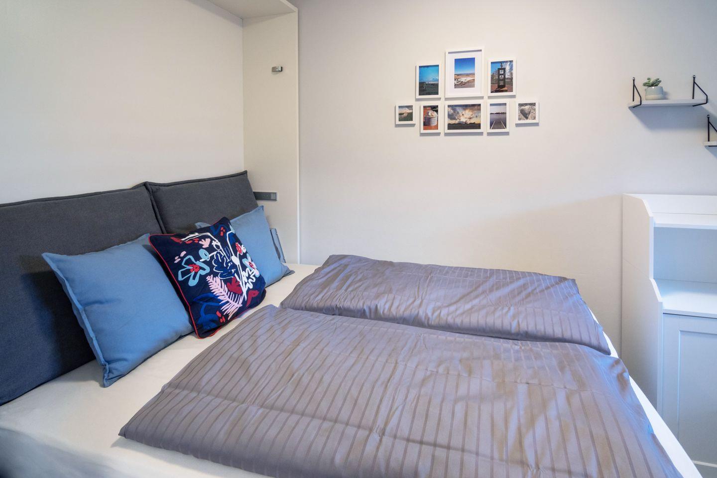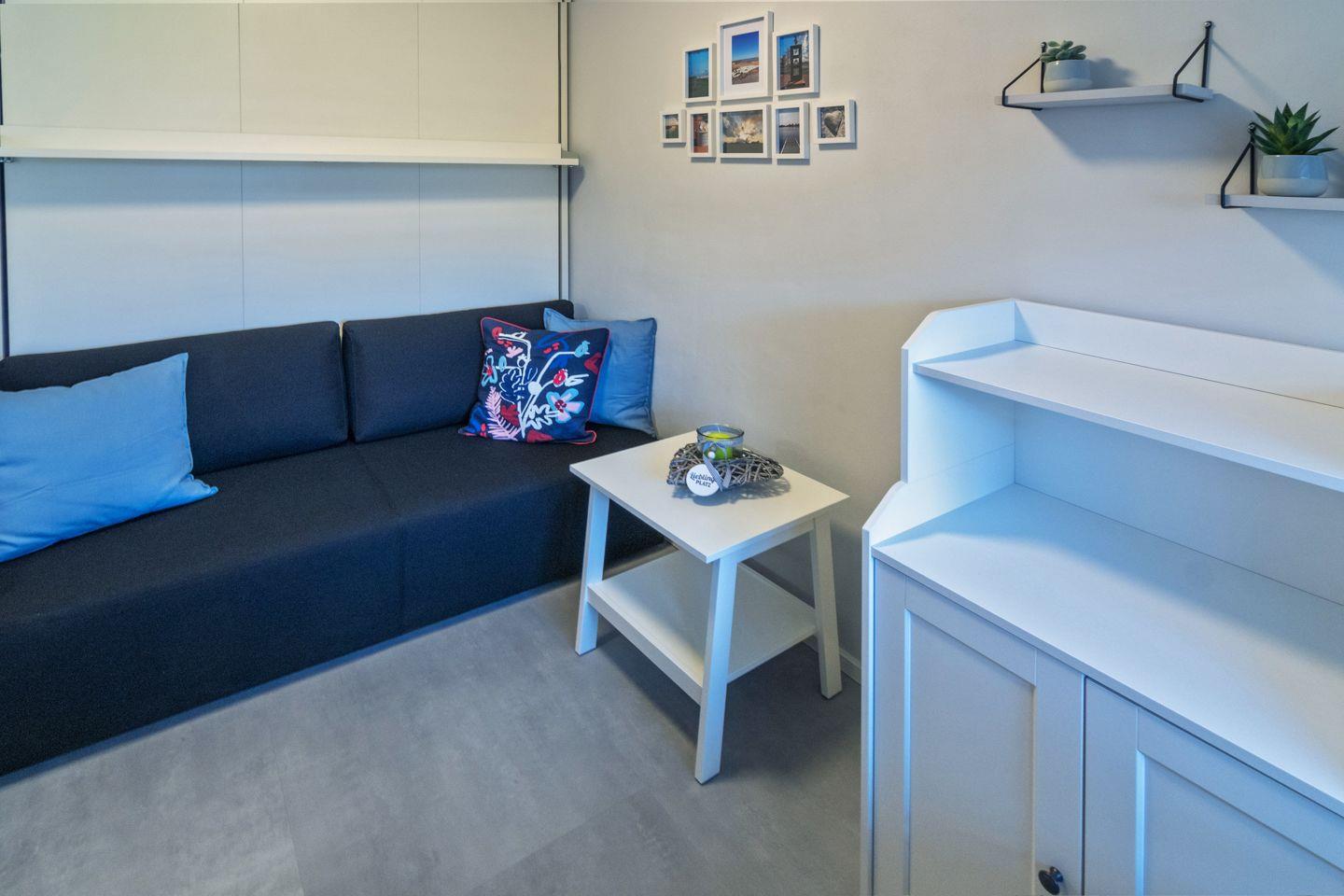 Das separate Schlafzimmer bietet zwei Schlafplätze, ein Zustellbett ist bei Bedarf möglich. Pflegeleichter Vinylboden sorgt für ein allergikerfreundliches Umfeld. Das moderne Bad verfügt über eine bodengleiche Dusche, WC, Waschbecken, Haartrockner und eine eigene Waschmaschine mit Wäscheständer.
