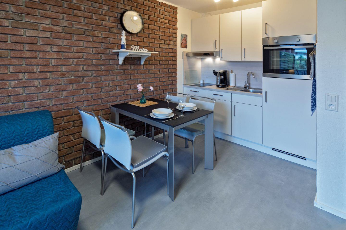 Der Wohn- und Essbereich mit offener, gut ausgestatteter Küche schafft eine wohnliche Atmosphäre. Zur Ausstattung gehören Ceranfeld, Backofen, Kühlschrank mit Gefrierfach, Spülmaschine, Kaffeemaschine, Senseo, Wasserkocher, Toaster, Mixer sowie ausreichend Geschirr und Besteck. Am Esstisch finden alle bequem Platz. Bücher stehen ebenfalls zur Verfügung.