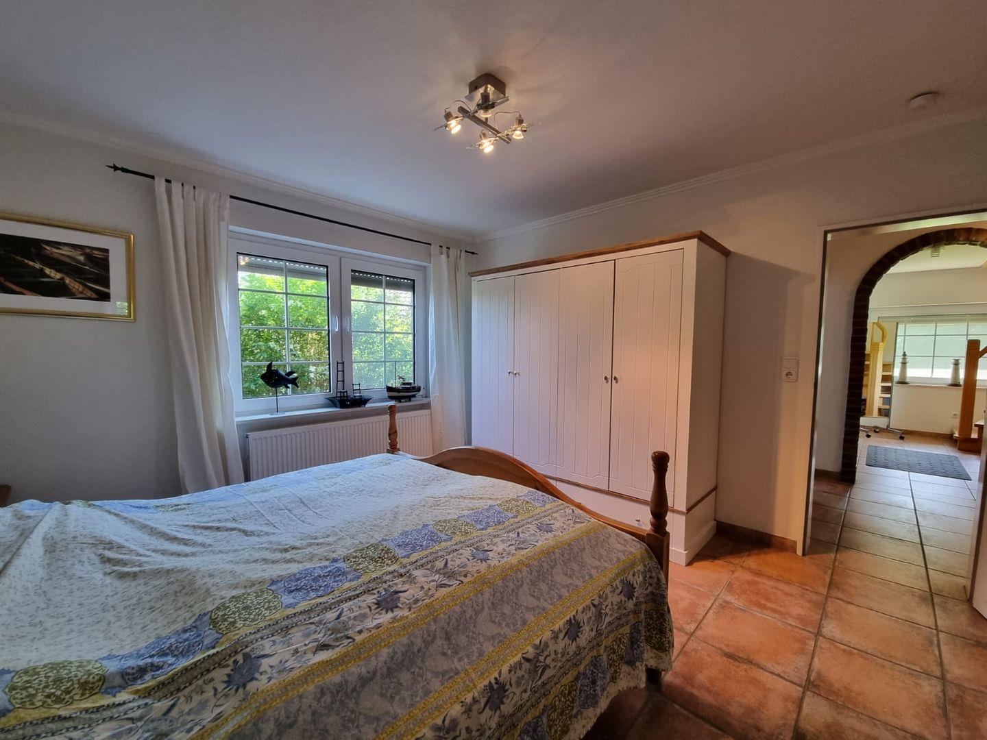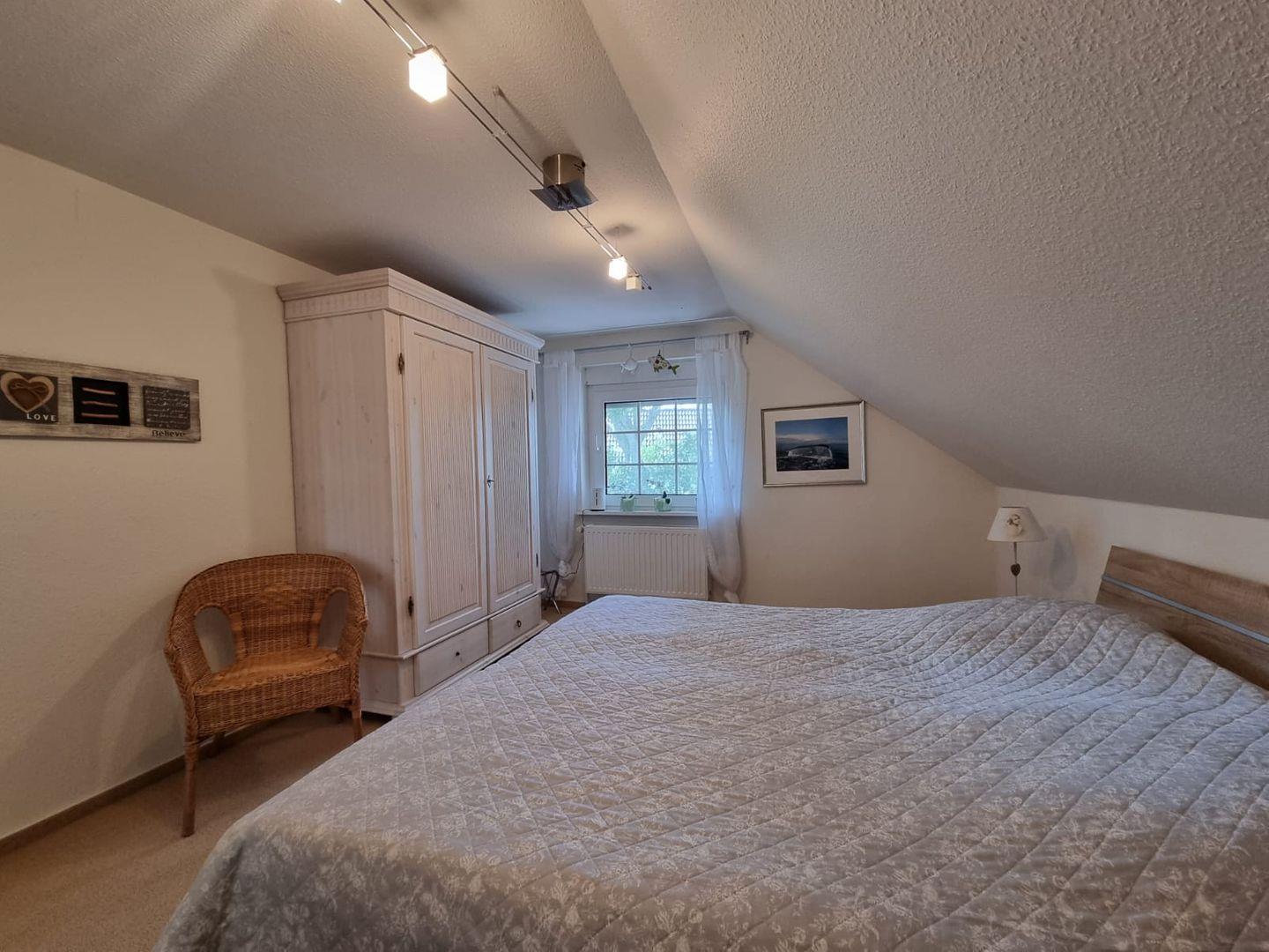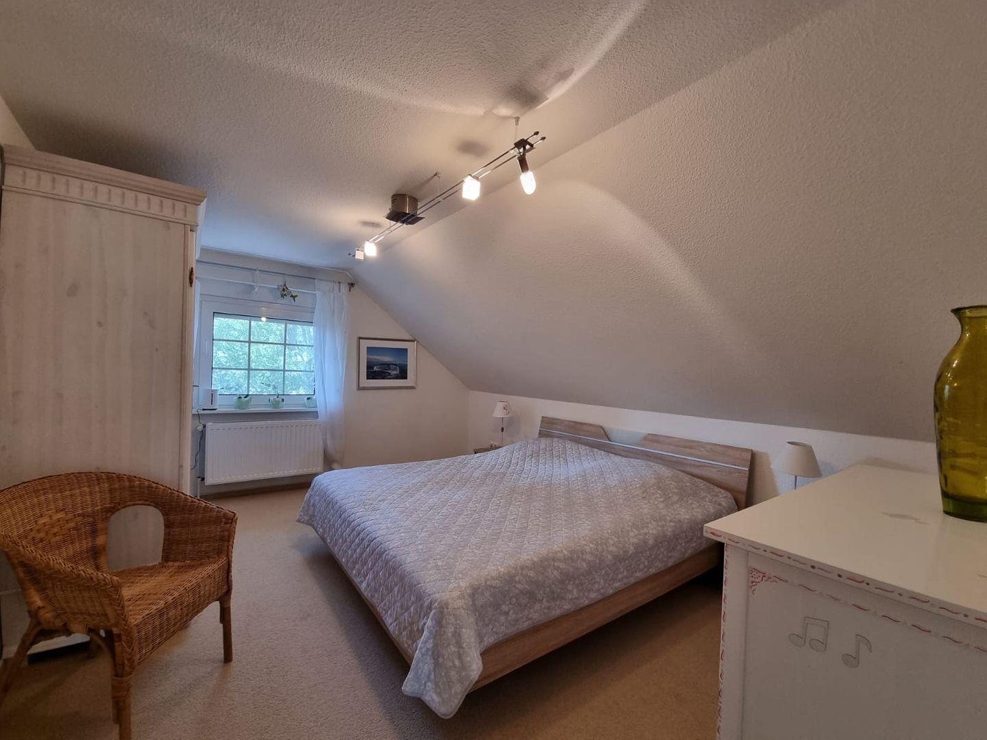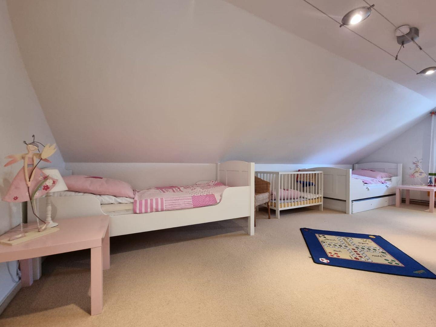Das Obergeschoss bietet weiteren Platz für erholsame Nächte. Zwei zusätzliche Schlafzimmer verfügen jeweils über ein 180 x 200 cm großes Doppelbett und eignen sich perfekt für Paare oder erwachsene Mitreisende. Für die jüngsten Gäste steht ein liebevoll eingerichtetes Kinderzimmer bereit. Es ist mit zwei Einzelbetten und einem festen Babybett ausgestattet und bietet Schlafmöglichkeiten für bis zu drei Kinder. Viele Spielsachen sorgen dafür, dass bei den kleinen Gästen keine Langeweile aufkommt.