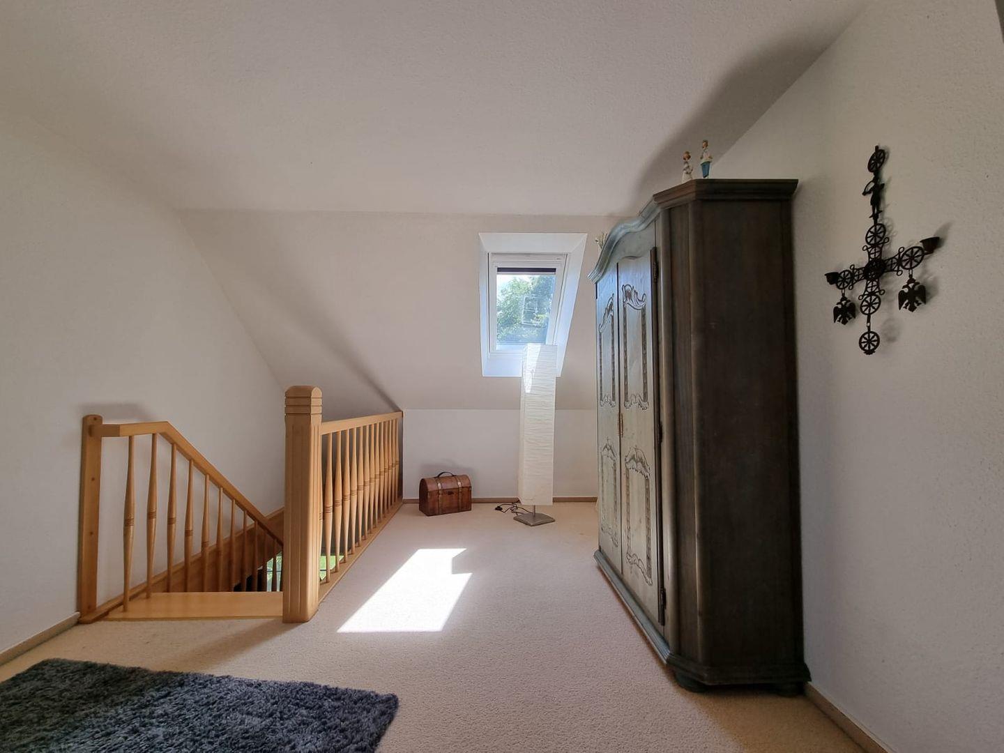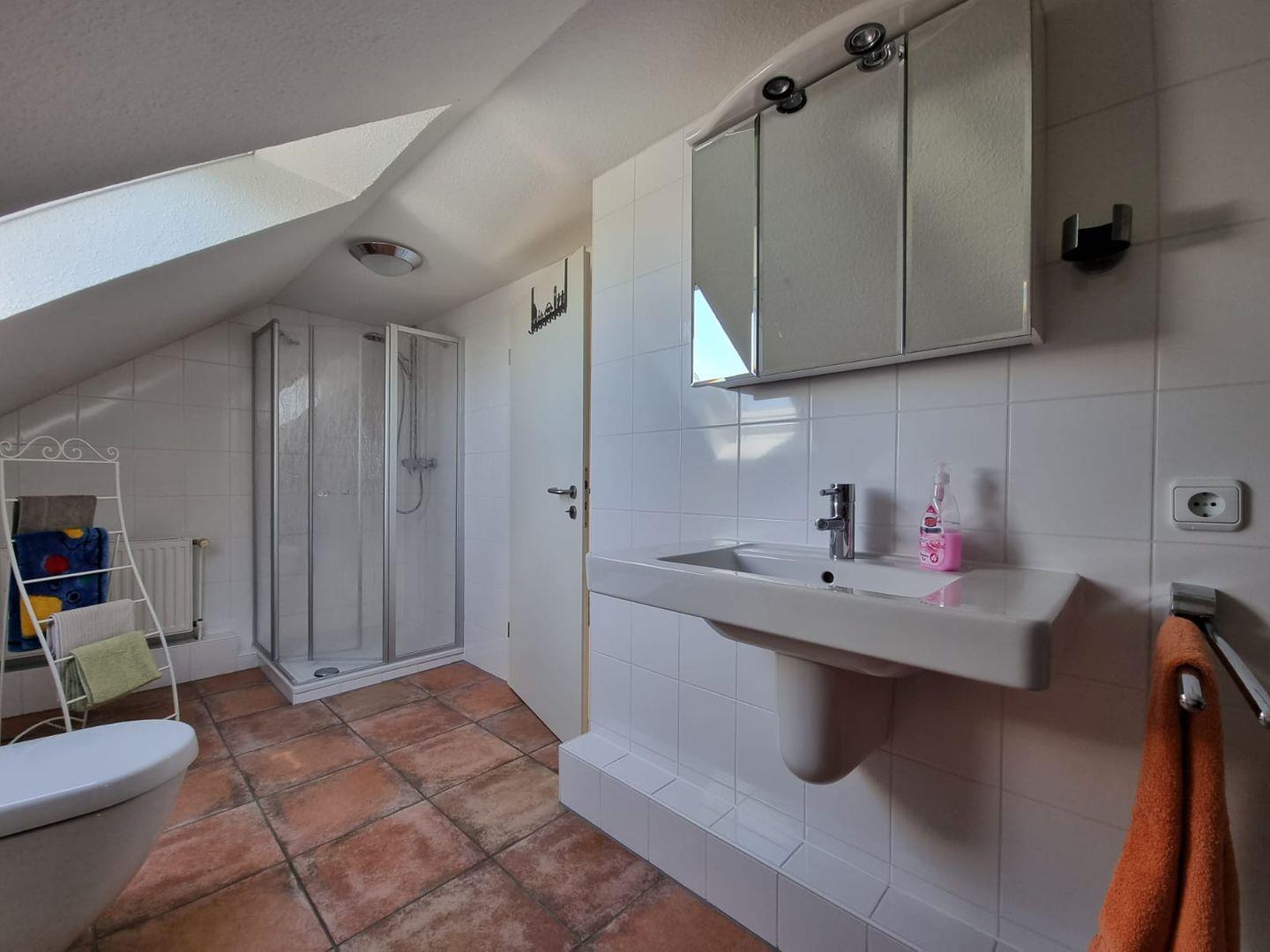 Ein zweites Badezimmer im Obergeschoss mit Dusche, Waschbecken und Toilette bietet zusätzlichen Komfort und verhindert Engpässe am Morgen.