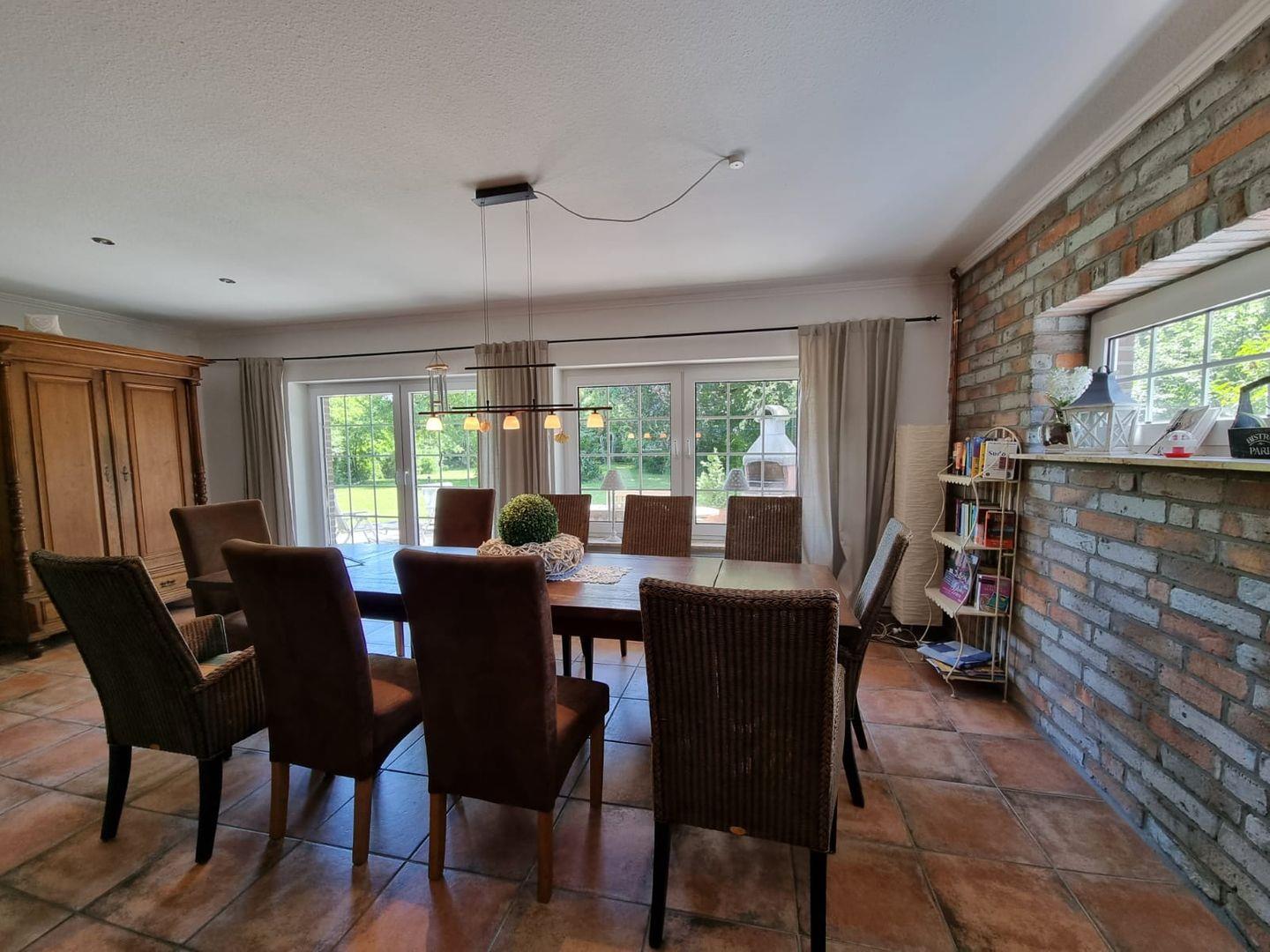 Ein besonderes Highlight des Hauses ist der Kamin im Wohnbereich, der an kühleren Tagen für wohlige Wärme sorgt und eine behagliche Atmosphäre schafft. Der großzügige Wohn- und Essbereich im Erdgeschoss verfügt über direkten Zugang zur Terrasse und zum gepflegten Garten, sodass Innen- und Außenbereich harmonisch ineinandergreifen.