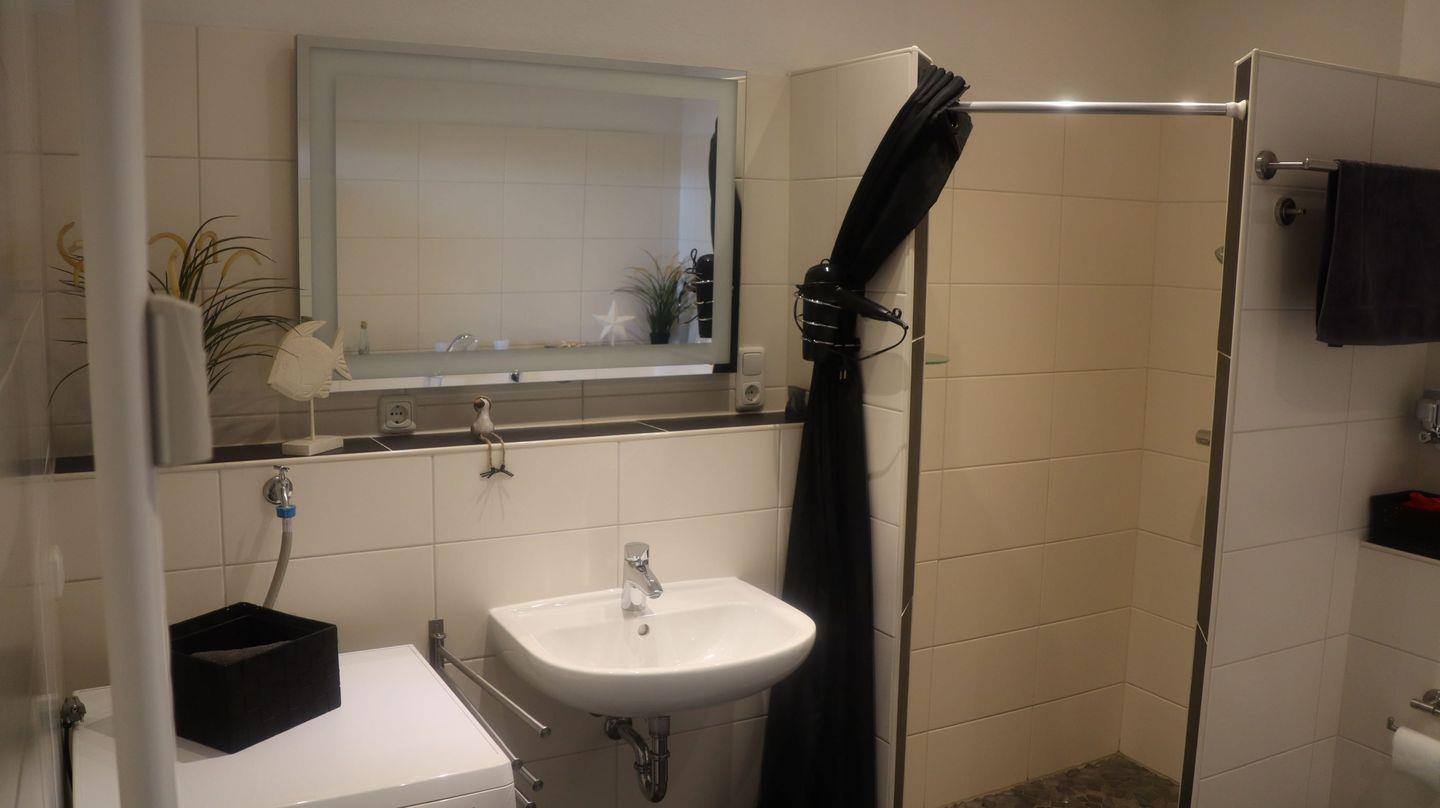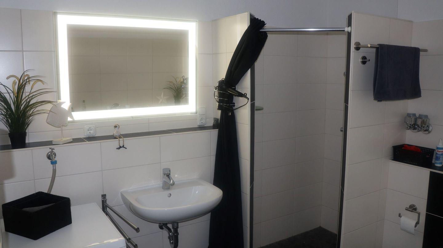 Das große, helle Badezimmer bietet sowohl eine ebenerdige Dusche als auch eine Badewanne. Es wurde vollständig modernisiert und senioren- sowie rollstuhlgerecht gestaltet.