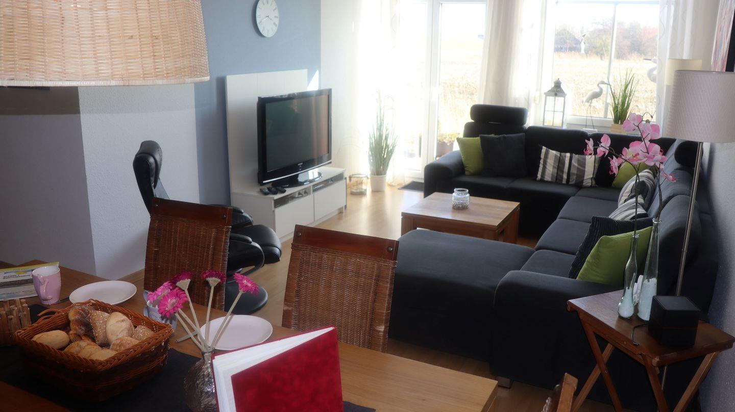 Der großzügige, lichtdurchflutete Wohn- und Essbereich lädt zum gemeinsamen Entspannen ein. Ein 42-Zoll-Flachbild-TV, DVD-Player, Stereoanlage sowie eine Auswahl an DVDs, CDs, Büchern und Spielen für Groß und Klein sorgen für Unterhaltung bei jedem Wetter. Für die kleinen Gäste gibt es zusätzlich eine liebevolle Spielecke.