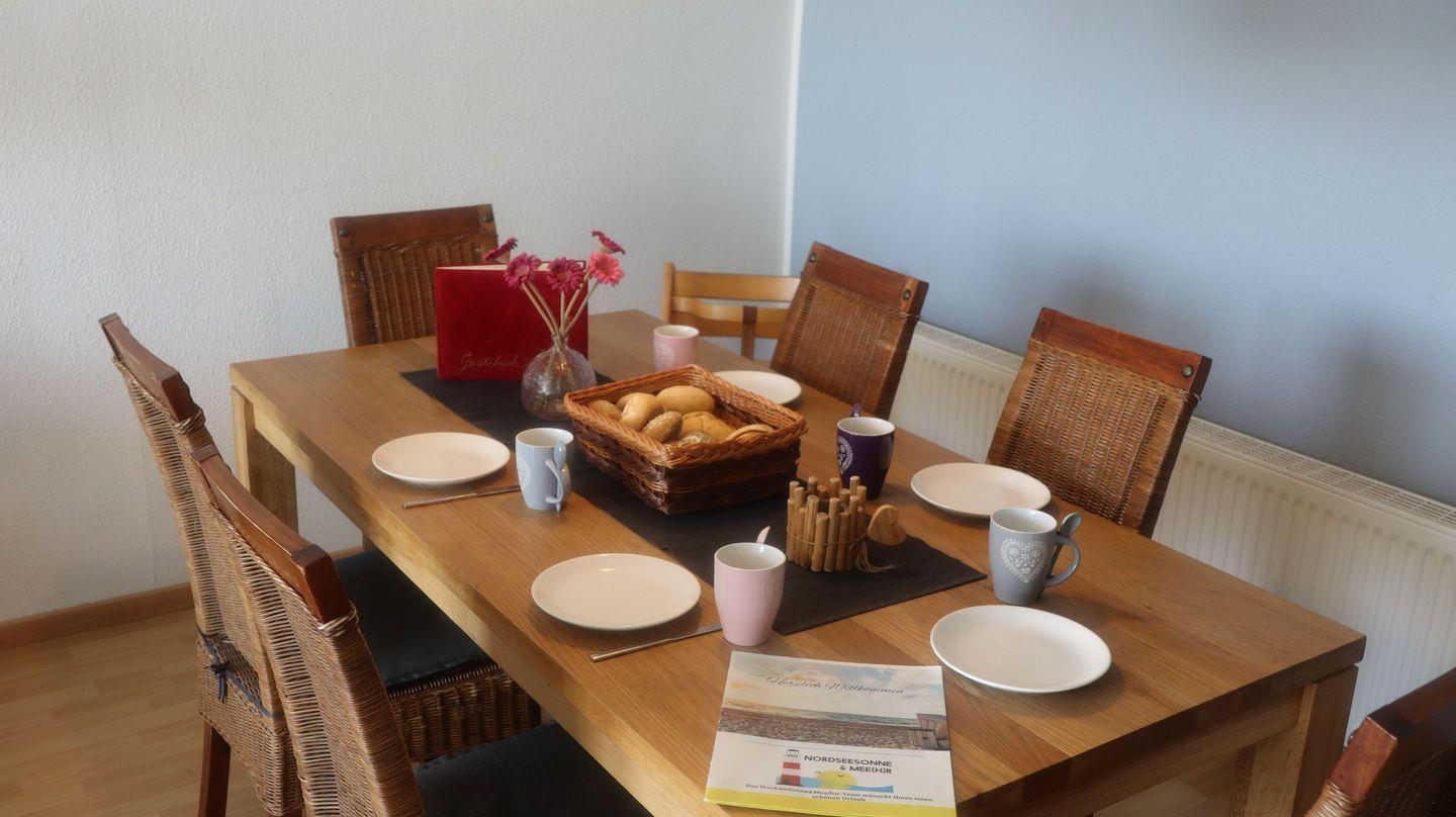 Die große, teilüberdachte Terrasse mit Gartenmöbeln und eigenem Strandkorb eröffnet einen weiten, unverbauten Blick in die Natur oder auf den Deich. Ein idealer Ort, um nach einem Strandspaziergang die Seele baumeln zu lassen – vielleicht mit einem guten Glas Wein. Genuss pur!