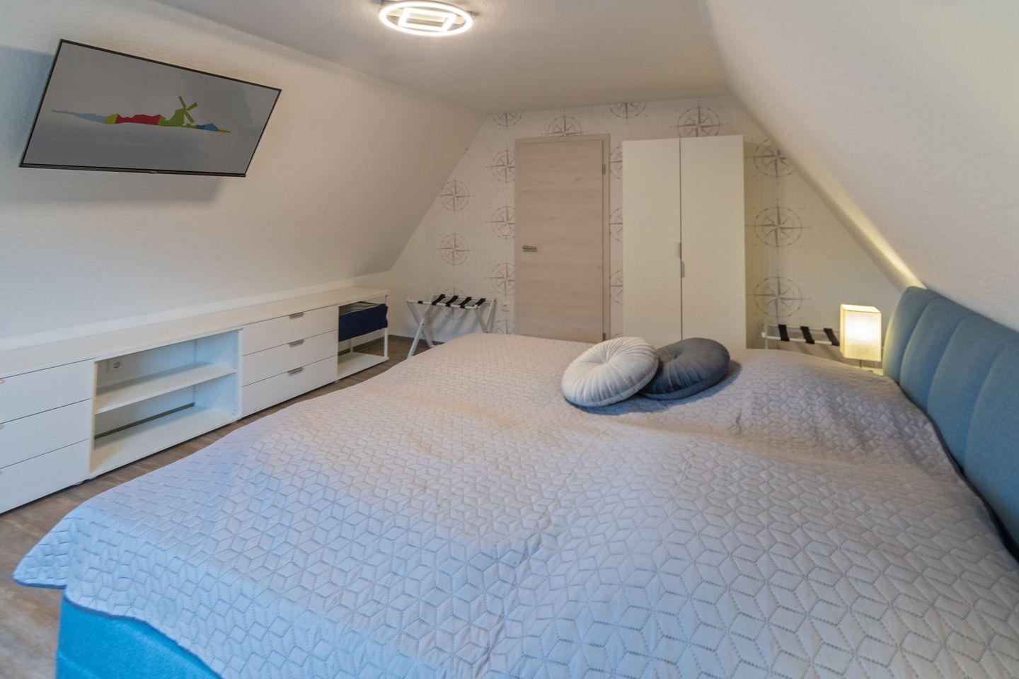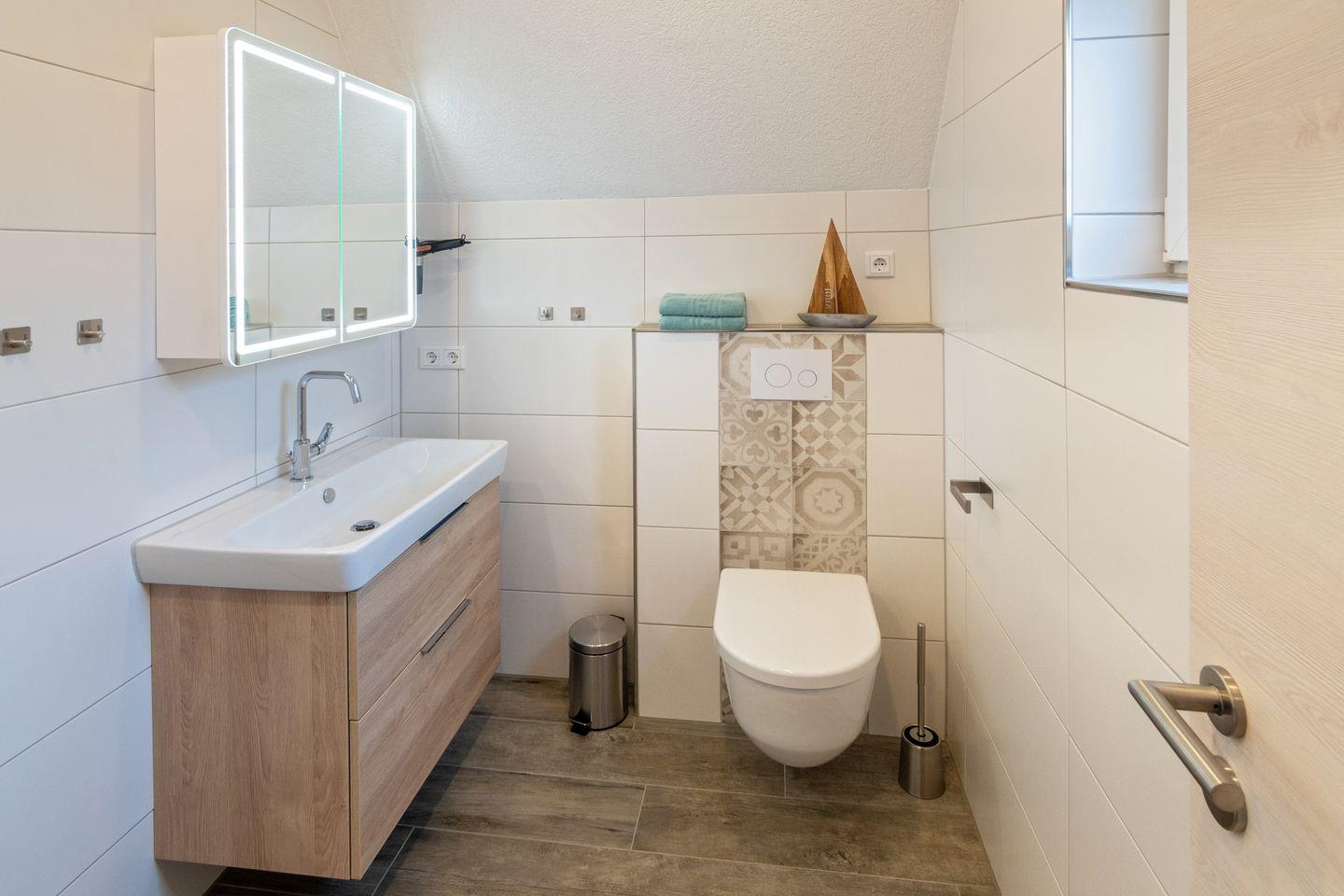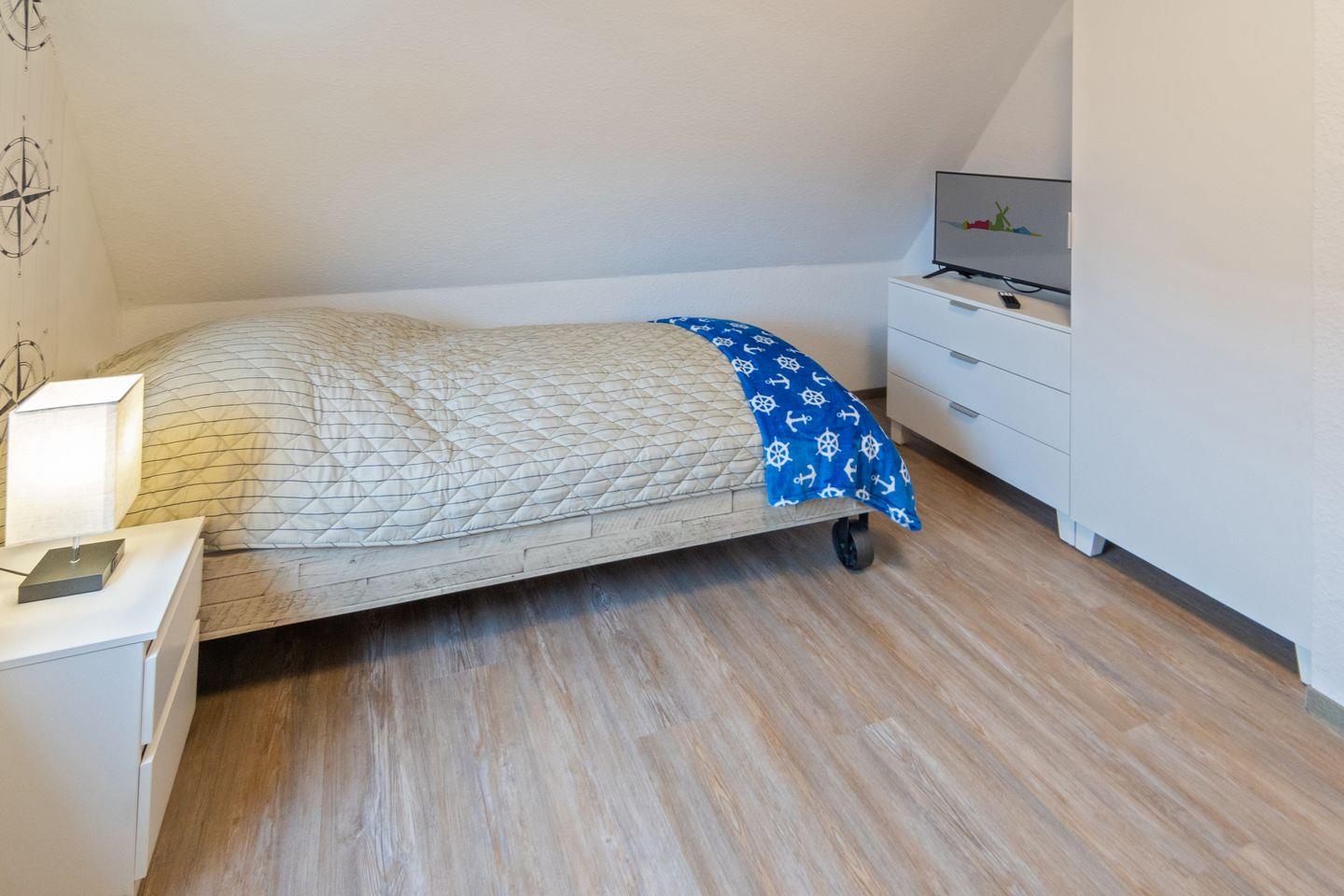 Das Badezimmer ist hell und modern gestaltet, verfügt über eine bodengleiche Dusche, Waschbecken, WC und ein Fenster. Zusätzlich ist ein Gäste-WC vorhanden, was besonders bei voller Belegung zusätzlichen Komfort bietet. Für die Jüngsten stehen ein Treppengitter, ein Kinderhochstuhl sowie ein Babybett zur Verfügung. Zudem gibt es zwei Zustellbetten, sodass sich die Unterkunft flexibel den Bedürfnissen kleiner Familien anpasst. Kinder sind im Muschelsammler ausdrücklich willkommen.