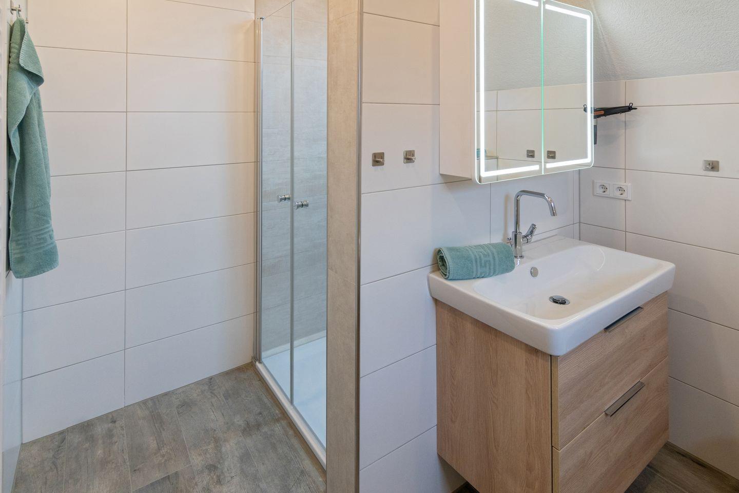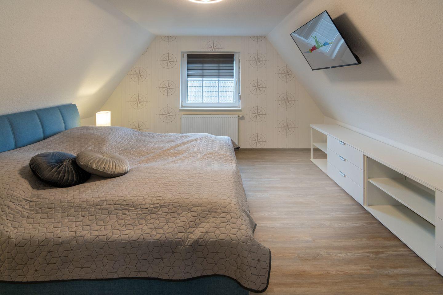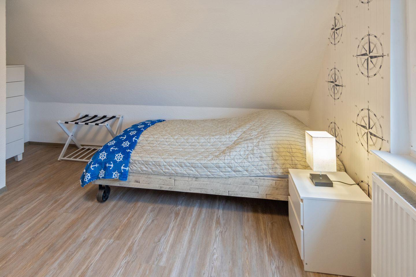 Das Badezimmer ist hell und modern gestaltet, verfügt über eine bodengleiche Dusche, Waschbecken, WC und ein Fenster. Zusätzlich ist ein Gäste-WC vorhanden, was besonders bei voller Belegung zusätzlichen Komfort bietet. Für die Jüngsten stehen ein Treppengitter, ein Kinderhochstuhl sowie ein Babybett zur Verfügung. Zudem gibt es zwei Zustellbetten, sodass sich die Unterkunft flexibel den Bedürfnissen kleiner Familien anpasst. Kinder sind im Muschelsammler ausdrücklich willkommen.