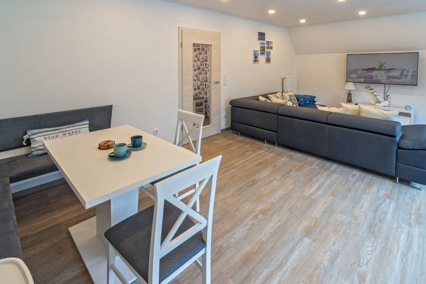 Die Küche ist als abgeschlossener Raum konzipiert und mit hochwertigen Geräten umfassend ausgestattet: Gäste profitieren von einem Ceran-Herd, Backofen, Mikrowelle, Kühlschrank mit Gefrierfach, Spülmaschine, Kaffeemaschine, Toaster, Wasserkocher, Eierkocher, Mixer sowie sämtlichen Küchenutensilien, Geschirr und Besteck für einen entspannten Selbstversorger-Urlaub. Im separaten Essbereich können gemeinsame Mahlzeiten in ruhigem Ambiente eingenommen werden.