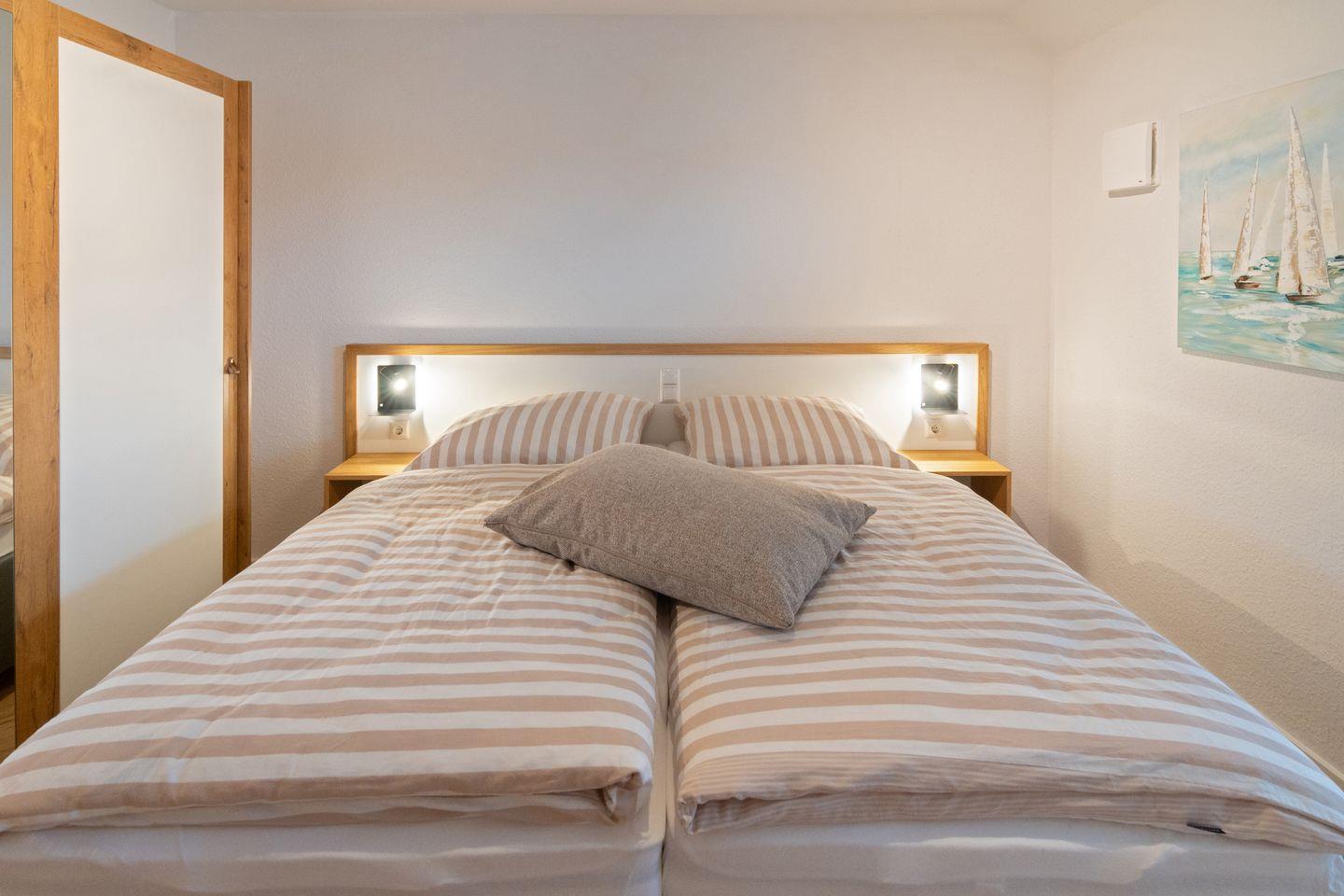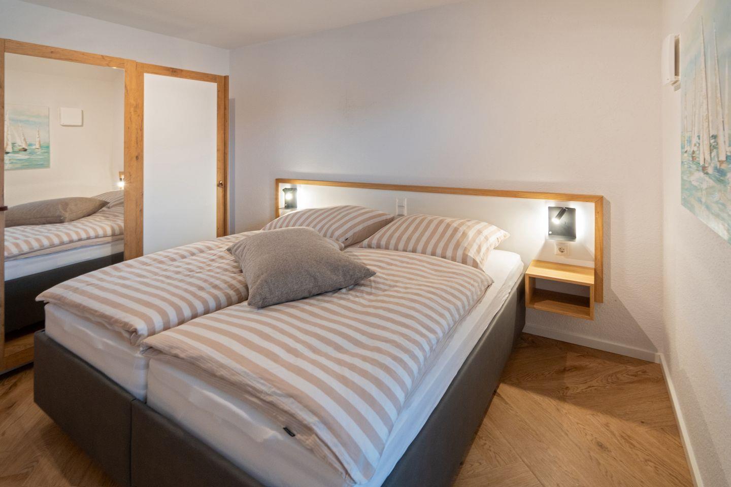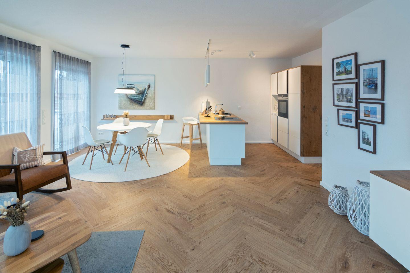 Der lichtdurchflutete Wohn- und Essbereich lädt zum Entspannen und Wohlfühlen ein. Hier können Sie den Tag in Ruhe ausklingen lassen, während Sie sich in der angrenzenden, voll ausgestatteten Küche kulinarisch verwöhnen. Diese bietet alles, was Sie für die Zubereitung Ihrer Lieblingsgerichte benötigen. Die beiden Schlafzimmer sind geschmackvoll eingerichtet – eines mit einem gemütlichen Ehebett, das andere mit zwei komfortablen Einzelbetten.