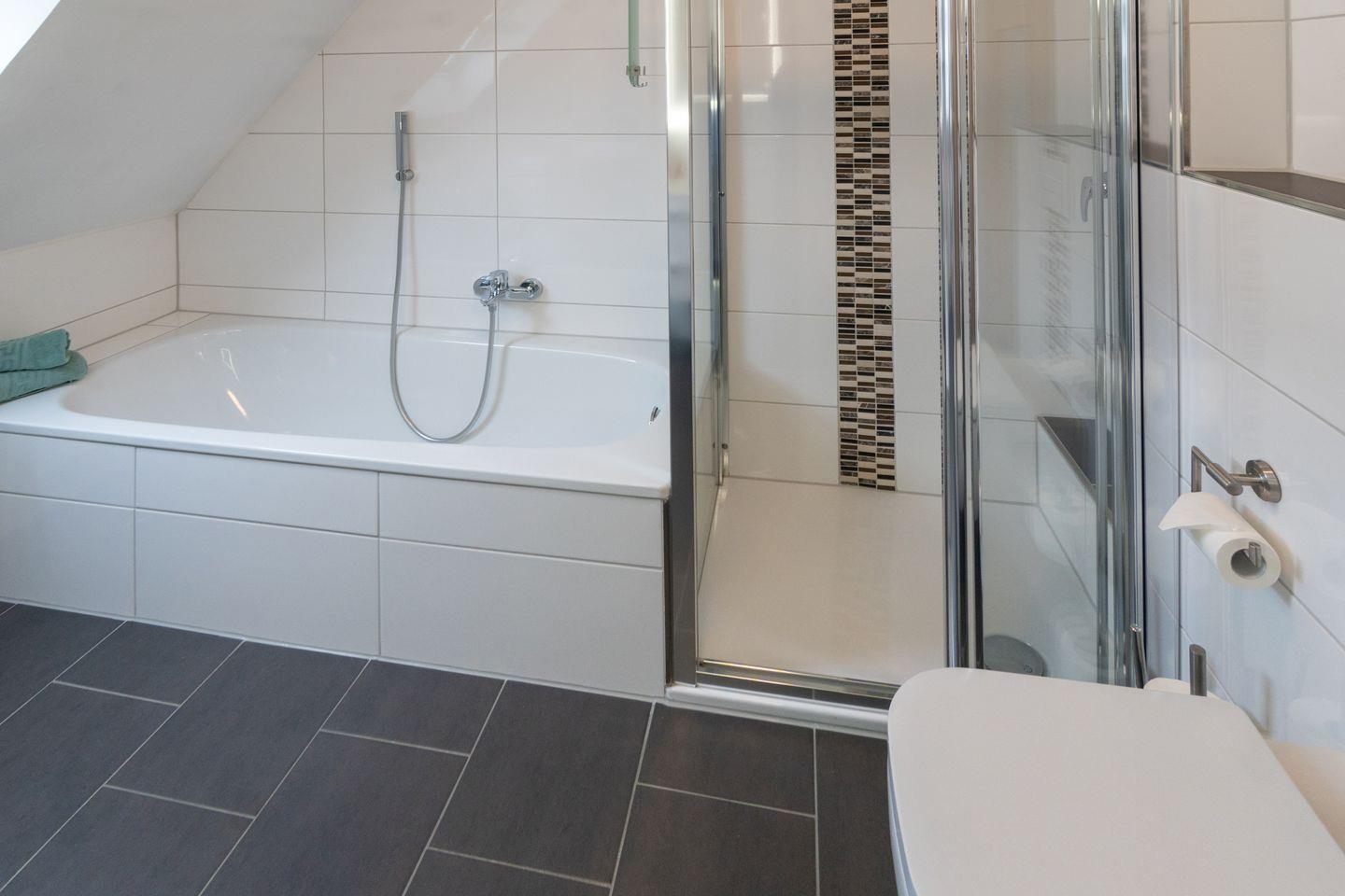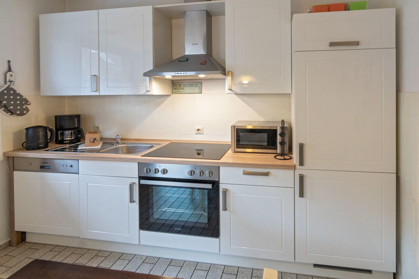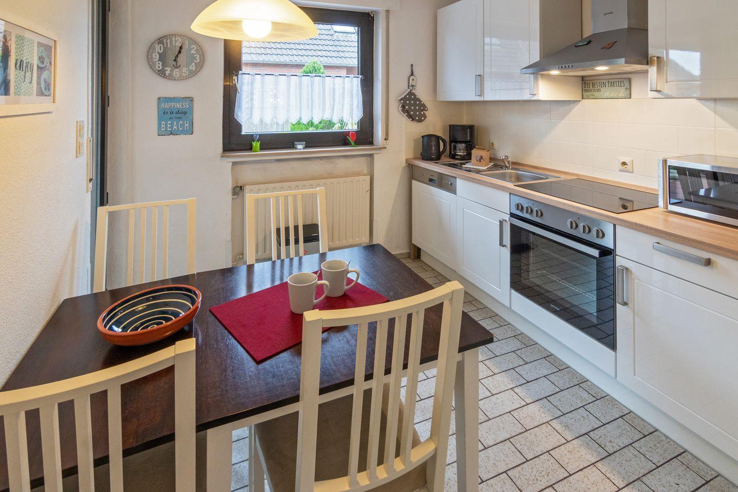 Das gemütlich eingerichtete Reihenhaus verfügt im Erdgeschoss über ein Wohnzimmer, eine separate voll ausgestattete Küche mit Essbereich und ein Gäste-WC. Im Obergeschoß befindet sich ein Schlafzimmer mit Ehebett, ein Schlafzimmer mit Einzelbett, ein Schlafzimmer mit hochwertigem Schlafsessel und Fernseher mit DVBT-Empfang (etwas eng) und ein Duschbad mit WC. Zum Haus gehört eine Terrasse. In der großzügigen Garage können Sie Ihren PKW und Fahrräder abstellen.