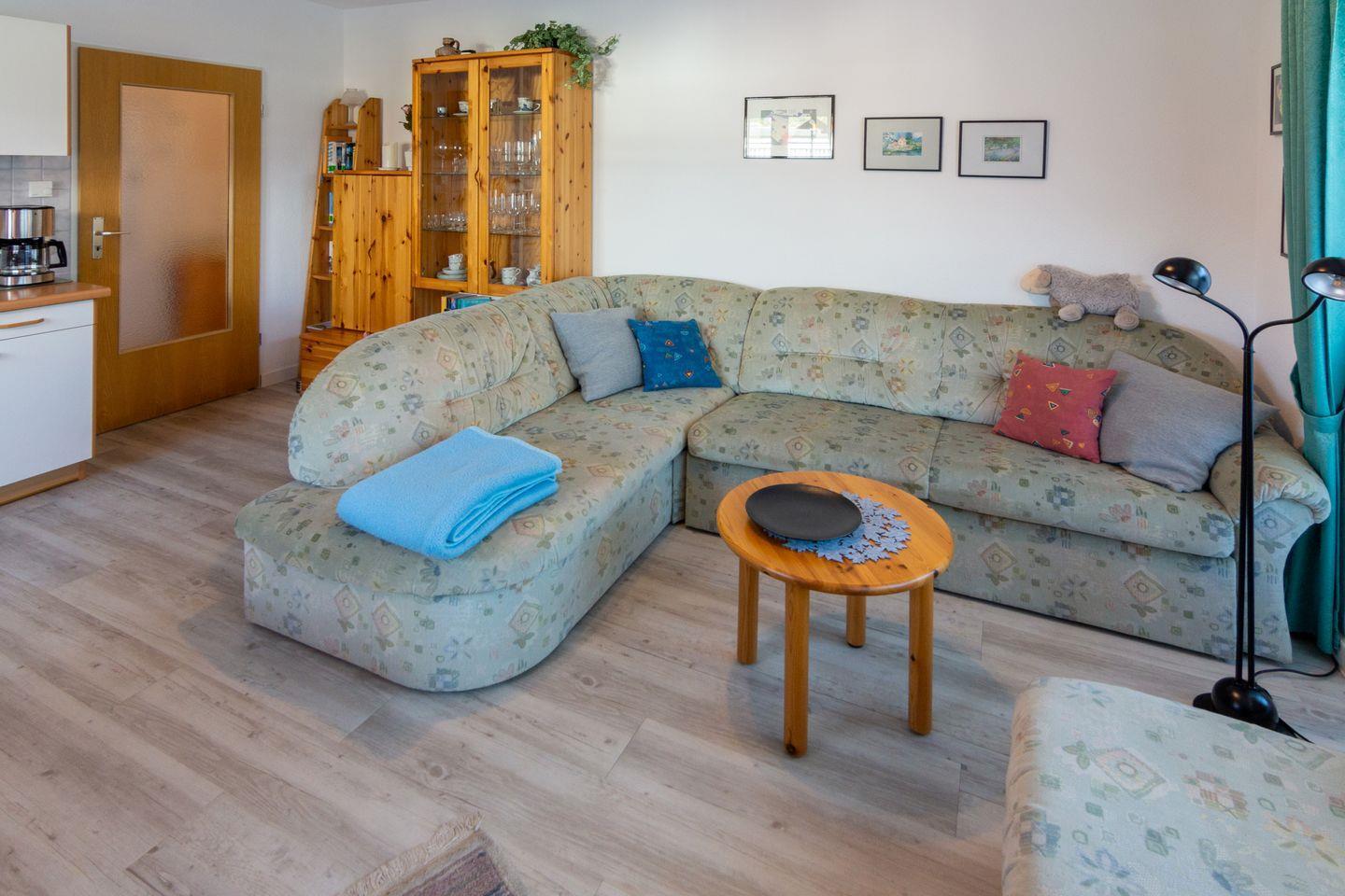 Der Wohn- und Essbereich ist hell und freundlich gestaltet und lädt zum Entspannen ein. Hier finden Sie auch eine Schlafcouch, die zusätzlichen Schlafplatz bietet. Die separate Küche ist voll ausgestattet und verfügt über alle notwendigen Elektrogeräte, um eine Mahlzeit selbst zuzubereiten.