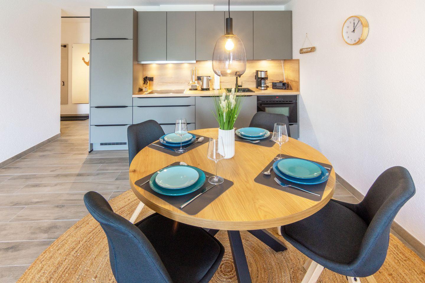 Der offene Wohnbereich lädt mit gemütlichem Sofa, zwei Fernsehern und HiFi-Anlage zu entspannten Abenden ein. Am großen Esstisch genießen Sie gemeinsame Mahlzeiten. Die hochwertige Küche ist komplett ausgestattet: Induktionsherd, Backofen, Kühlschrank mit Gefrierfach, Spülmaschine sowie Kaffeemaschine, Wasserkocher und Toaster – für einen gelungenen Start in den Tag.